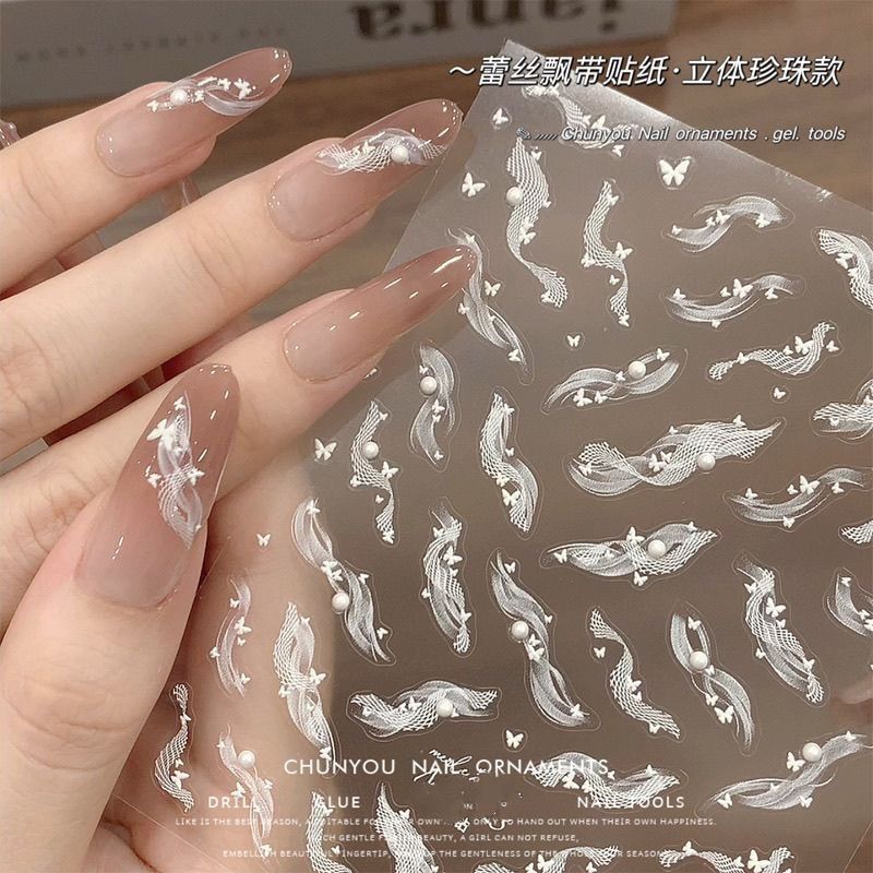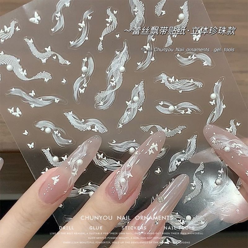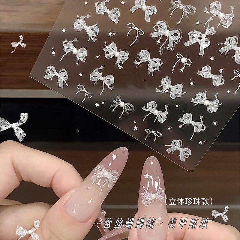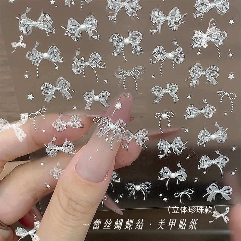 새로운 진주 레이스 활 네일 아트 스티커 스테레오 릴리프 데칼 화이트 활 네일 장식스토어 가기