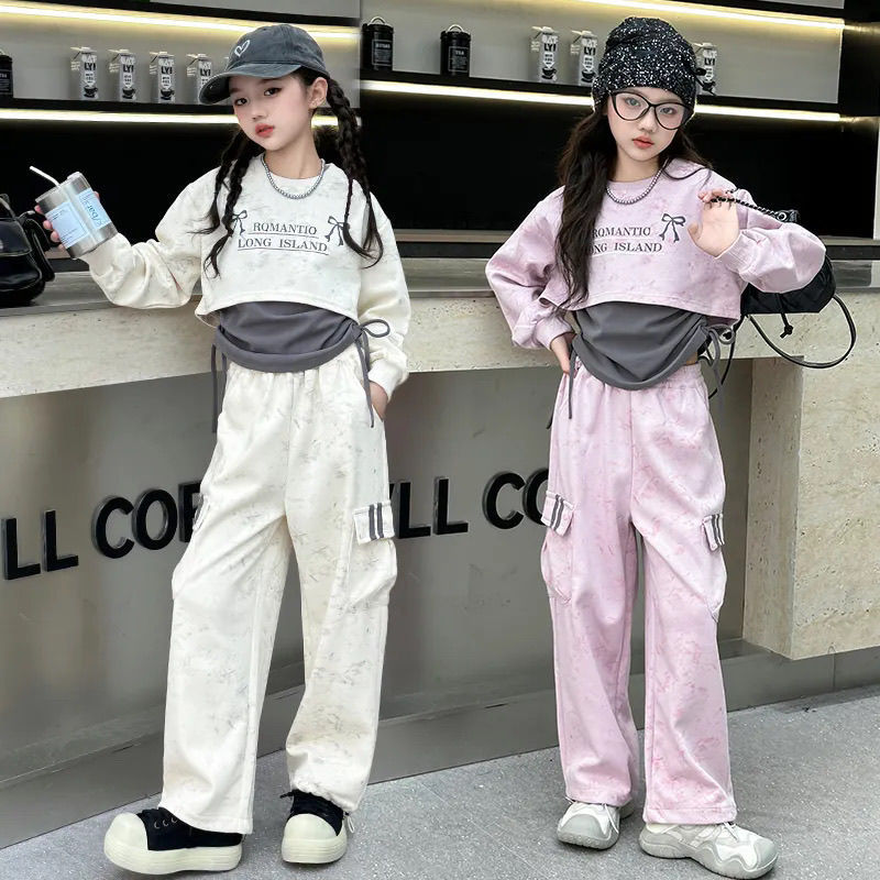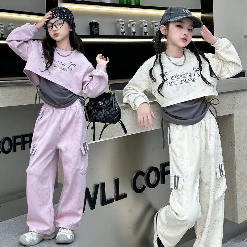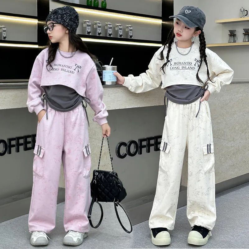 중간 및 큰 어린이를위한 소녀 한국식 유행 세트 봄 및 가을 새로운 스타일 외국식 편지 탑 웨이스트 라인 조끼 바지 3 종 세트스토어 가기