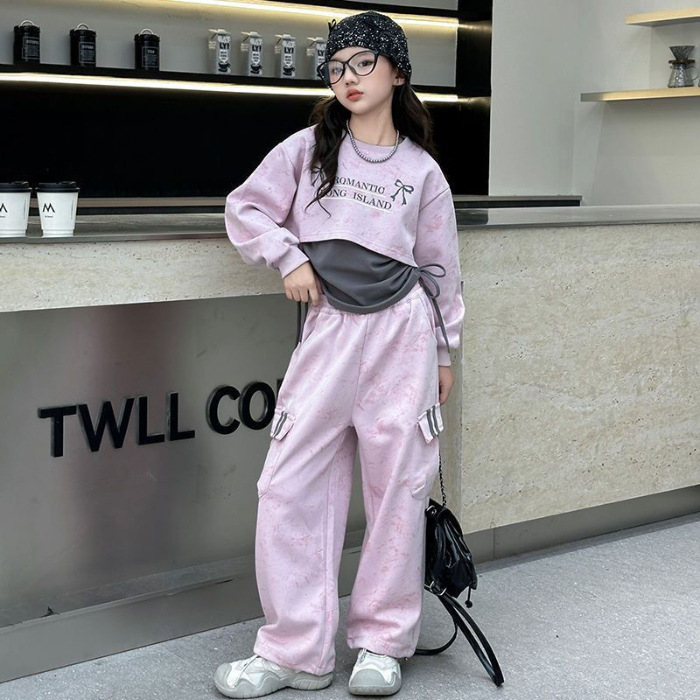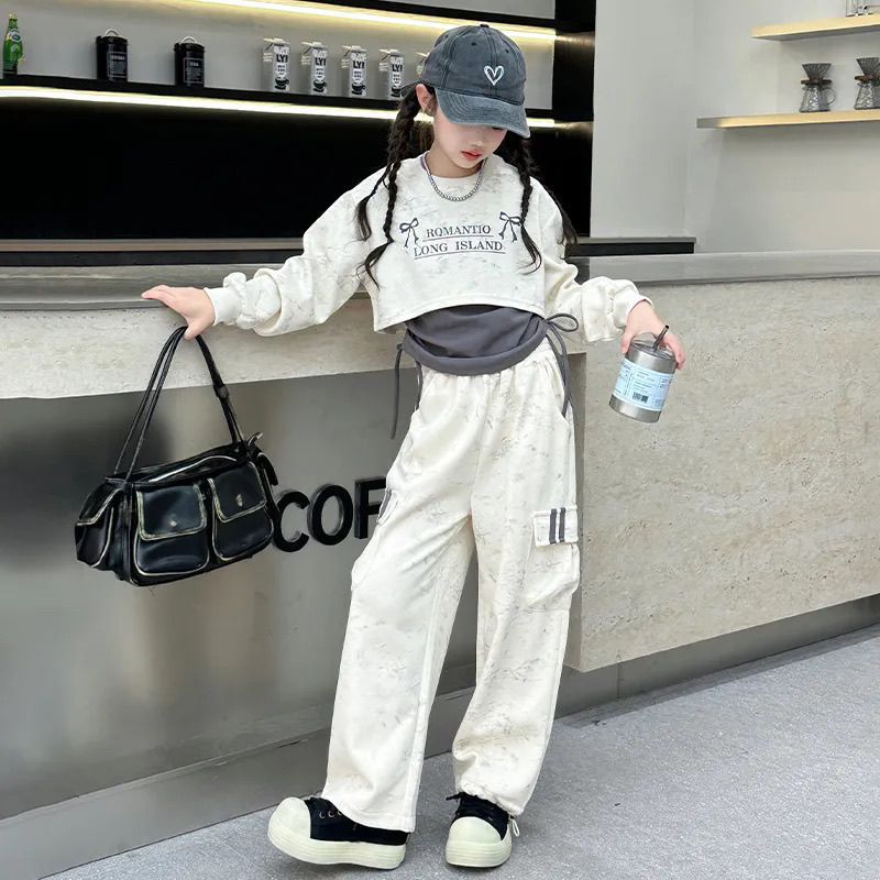 중간 및 큰 어린이를위한 소녀 한국식 유행 세트 봄 및 가을 새로운 스타일 외국식 편지 탑 웨이스트 라인 조끼 바지 3 종 세트