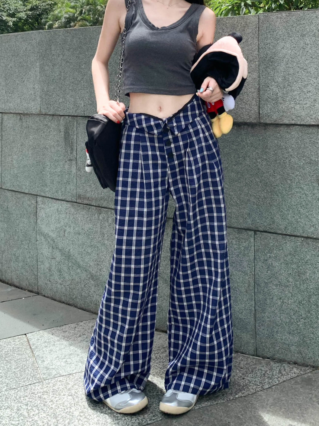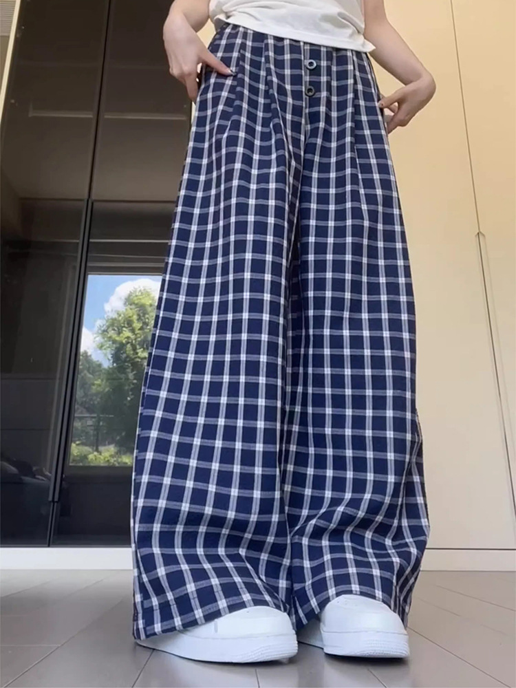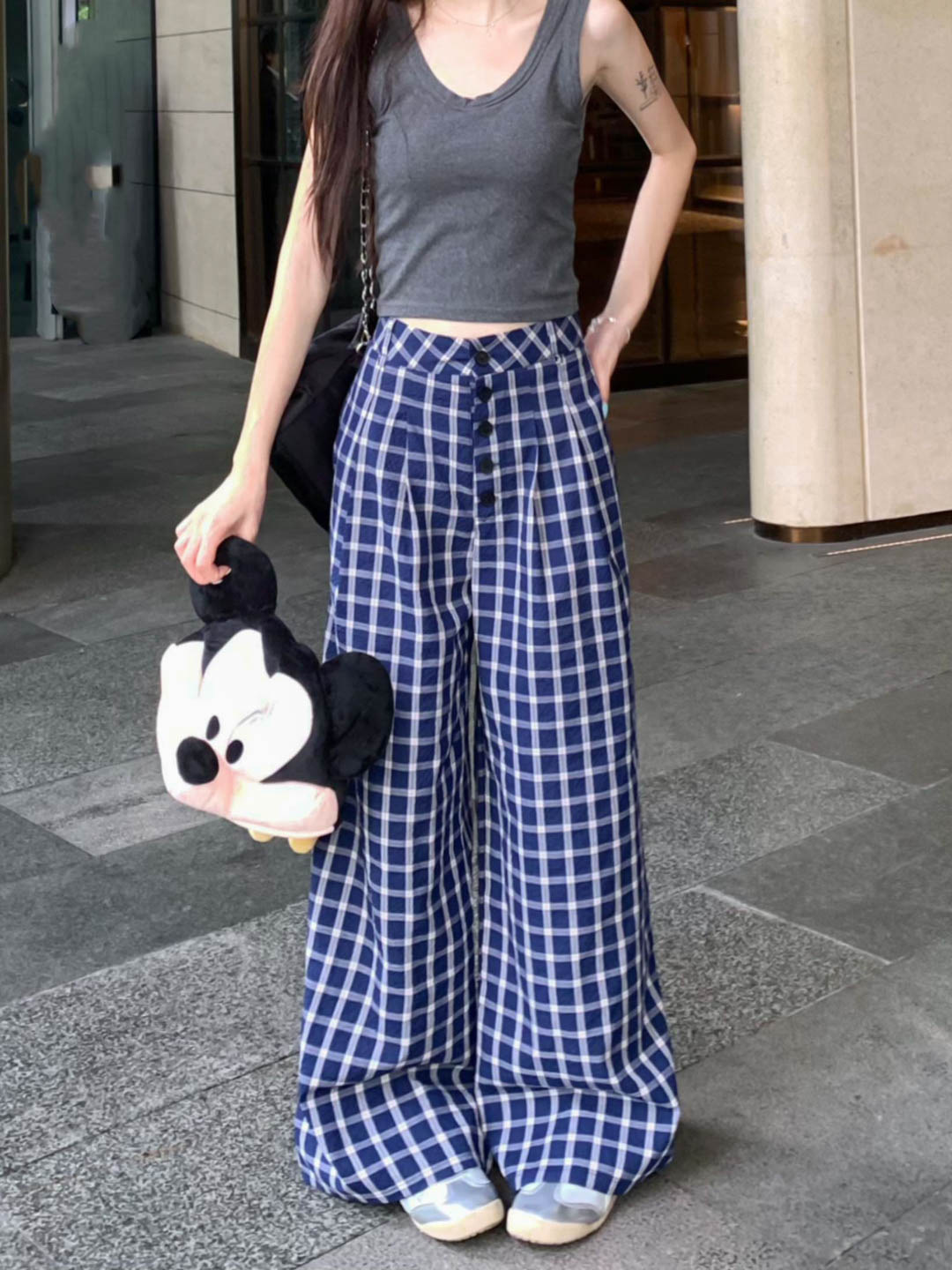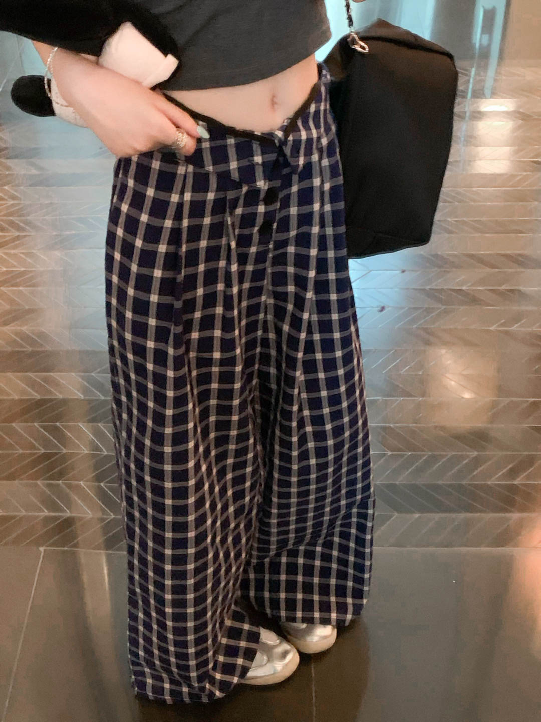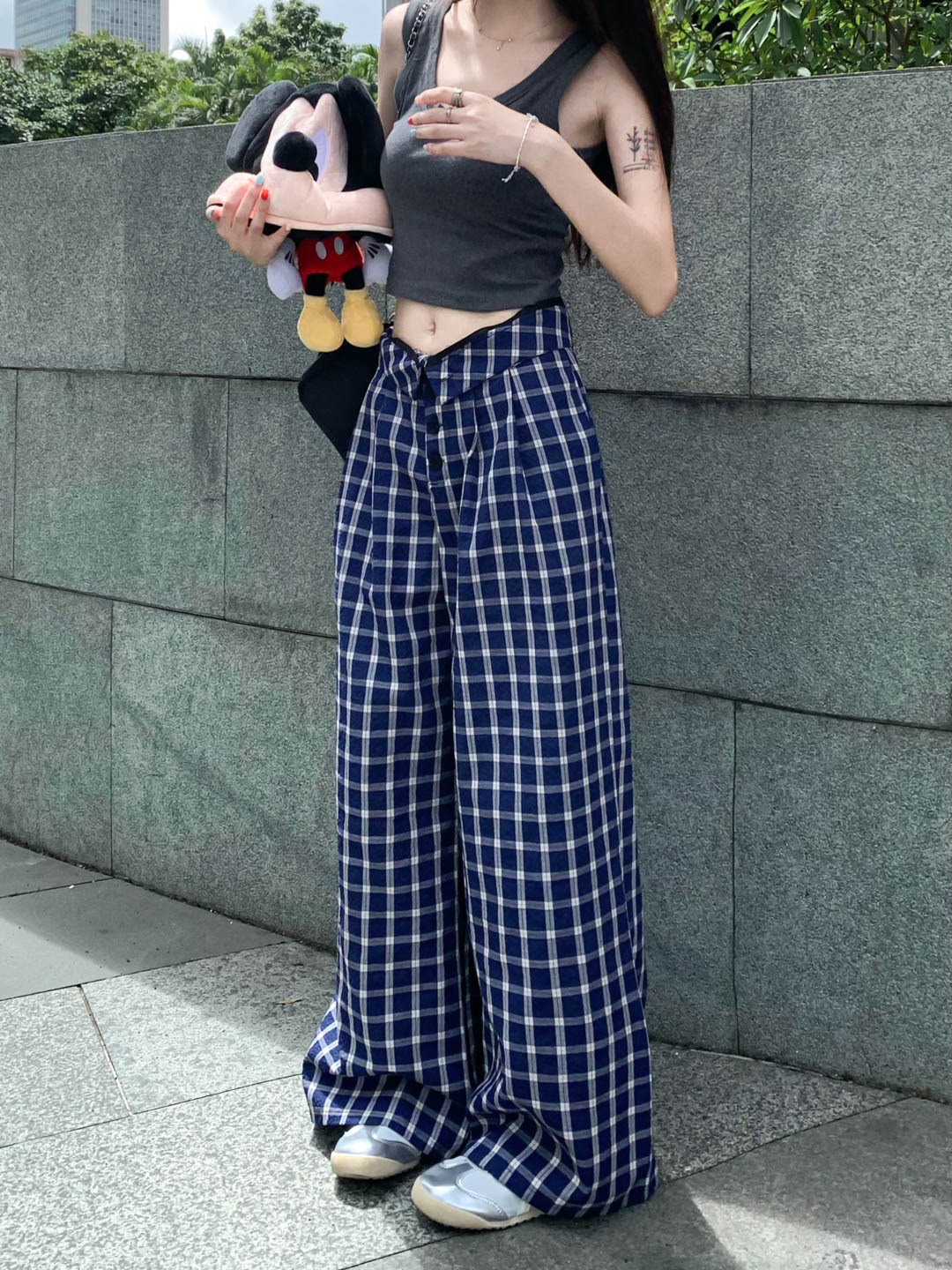 격자 무늬 스트레이트 캐주얼 바지 여성의 이른 가을 새로운 복고풍 높은 허리 느슨한 넓은 다리 뒤로 스타일 긴 바지스토어 가기