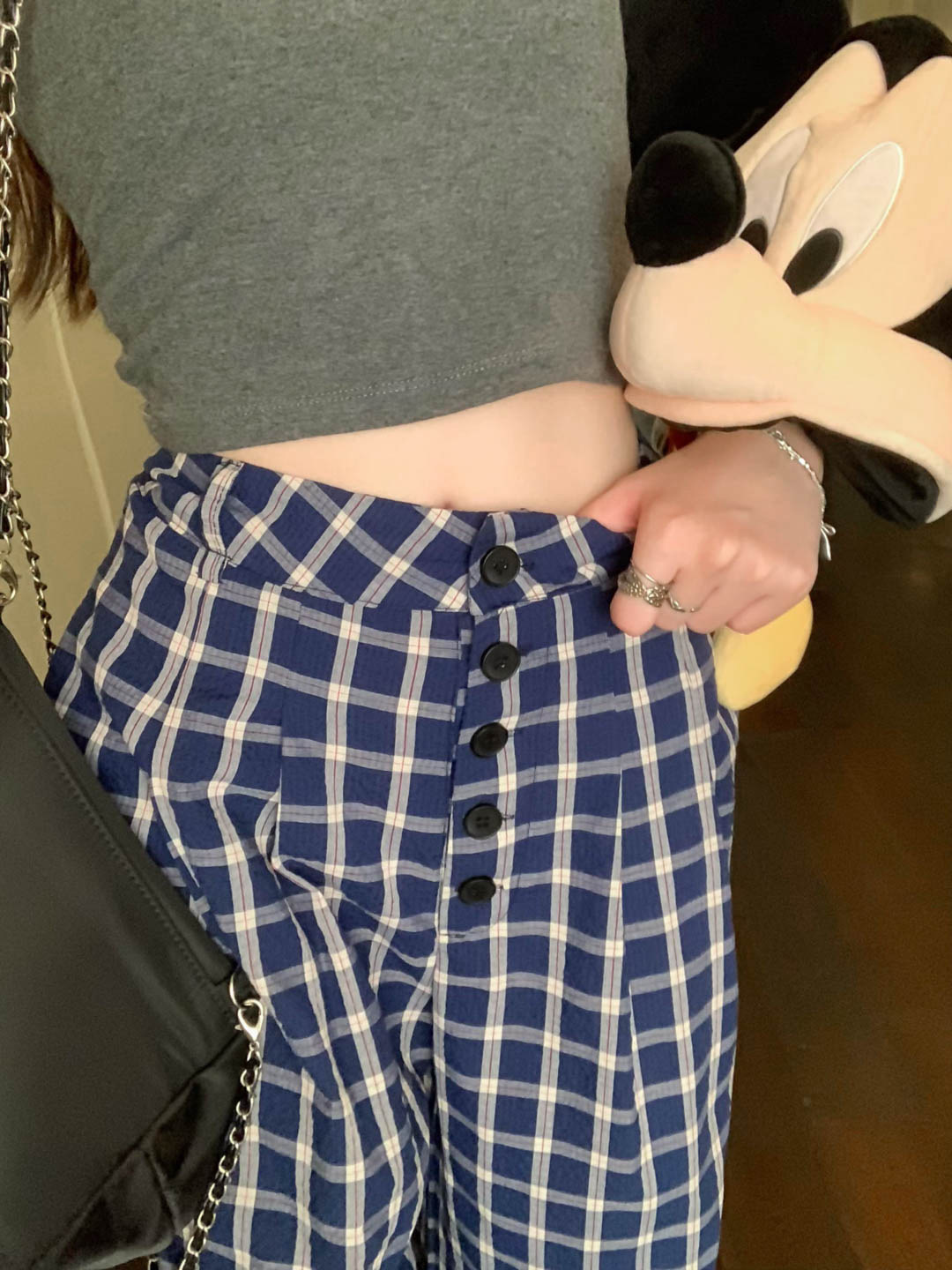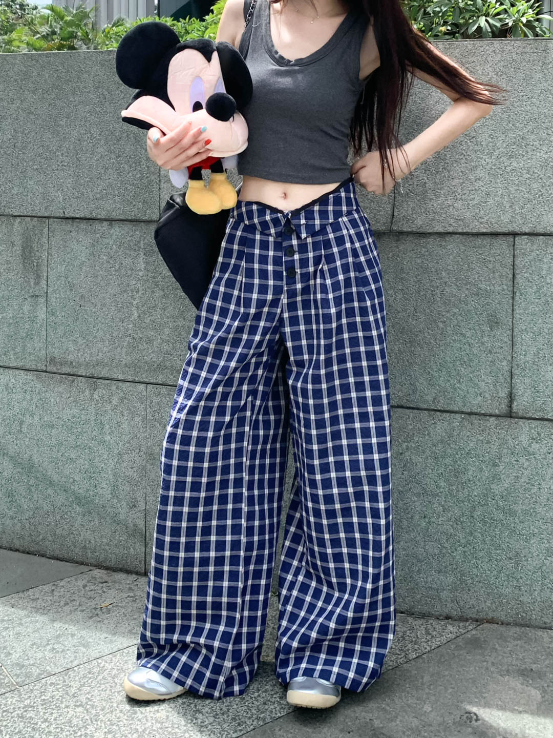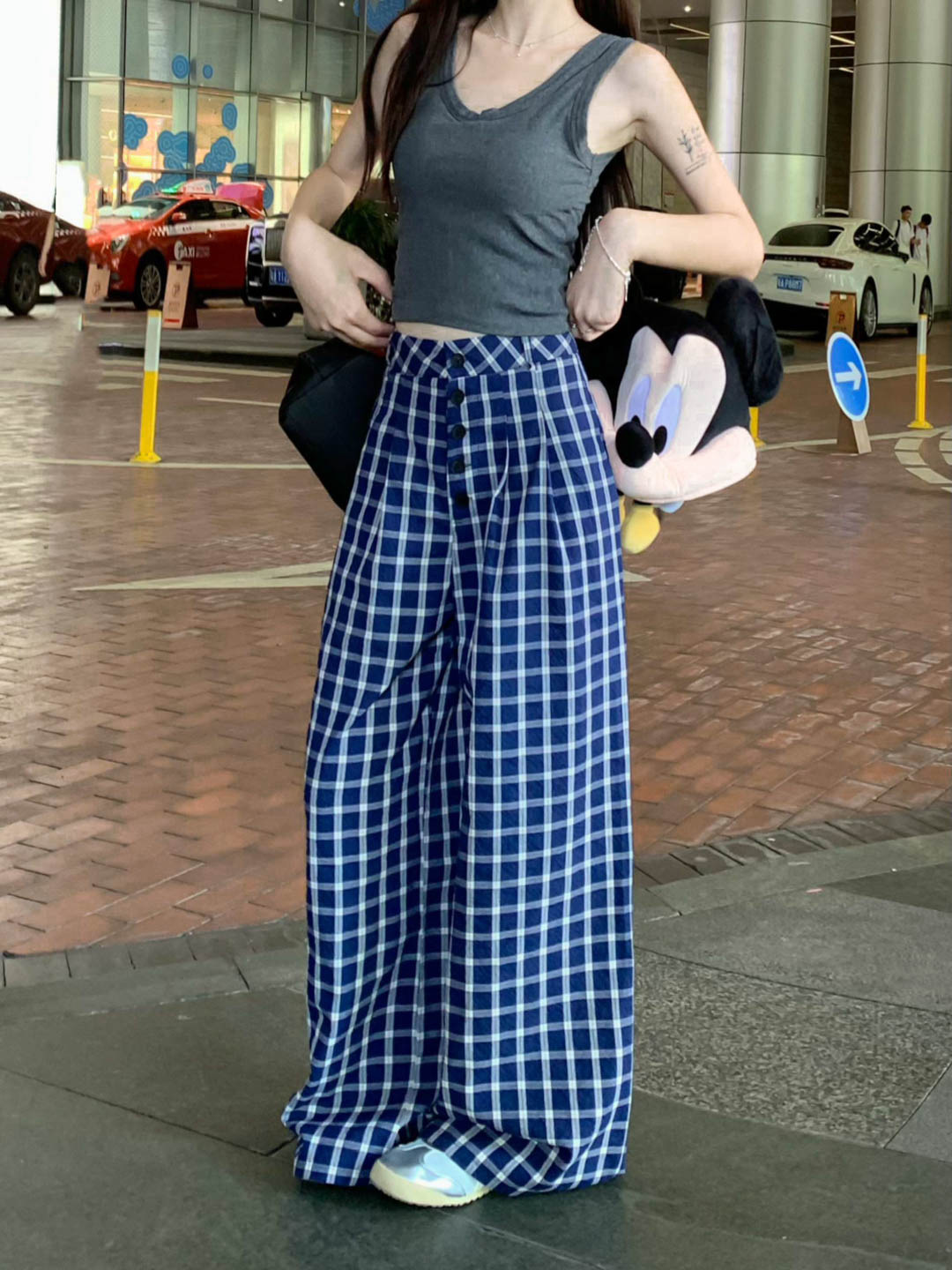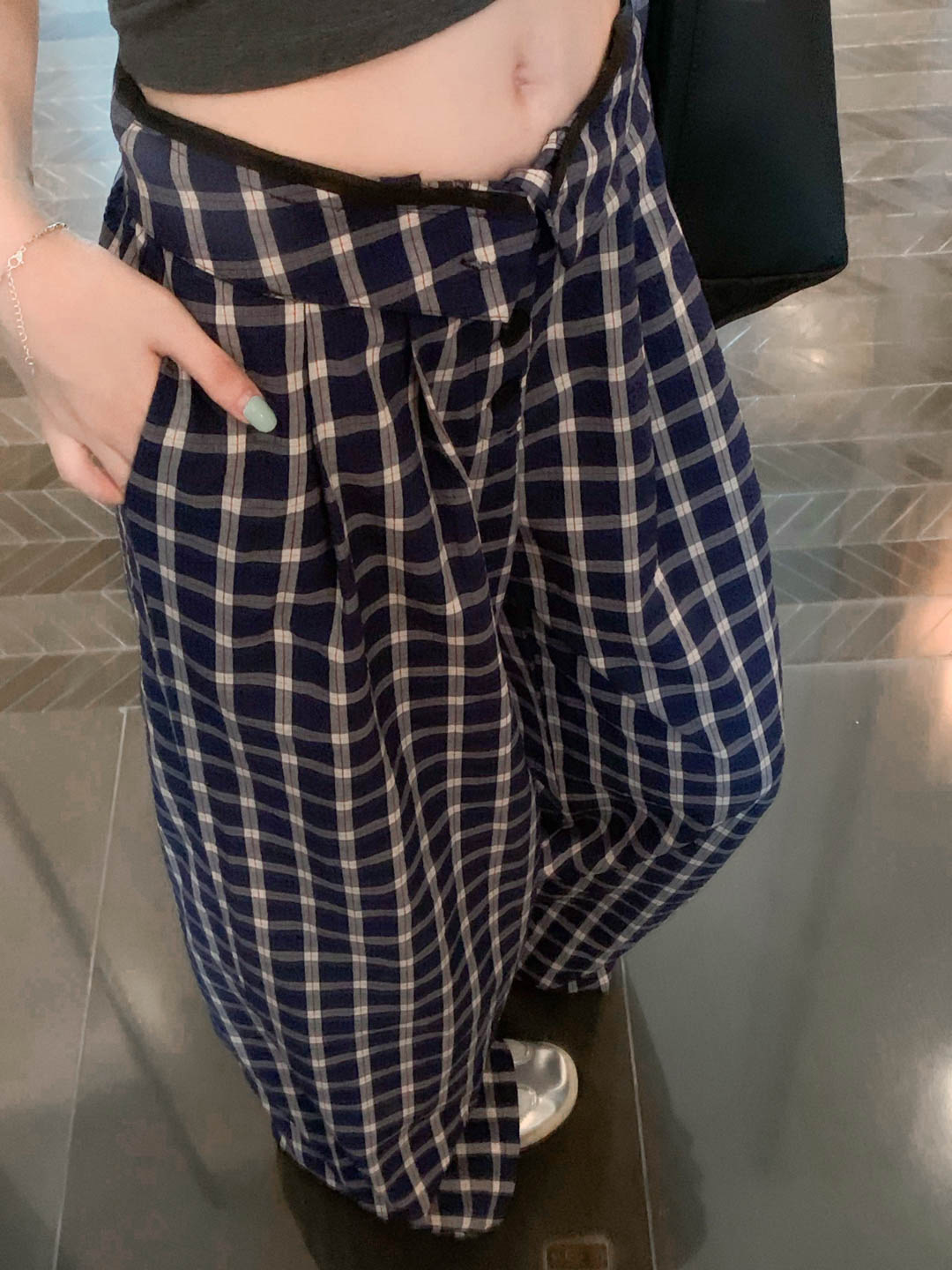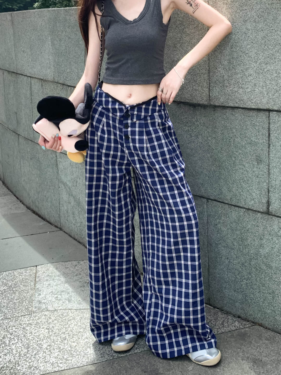 격자 무늬 스트레이트 캐주얼 바지 여성의 이른 가을 새로운 복고풍 높은 허리 느슨한 넓은 다리 뒤로 스타일 긴 바지스토어 가기
