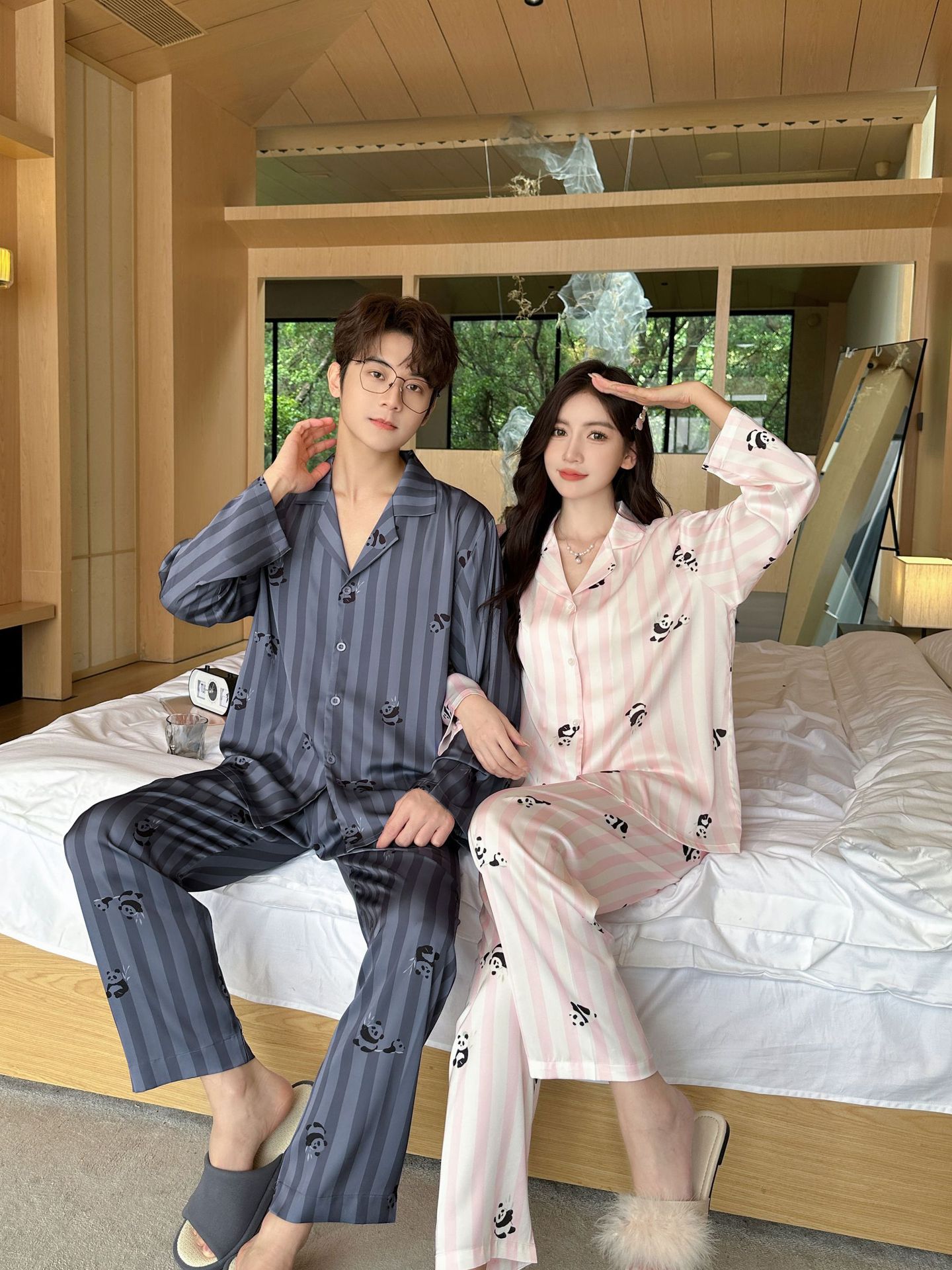 커플 잠옷 여성의 봄과 가을 아이스 실크 긴 소매 귀여운 팬더 홈 옷 가을 캐주얼 세트 남성 1177