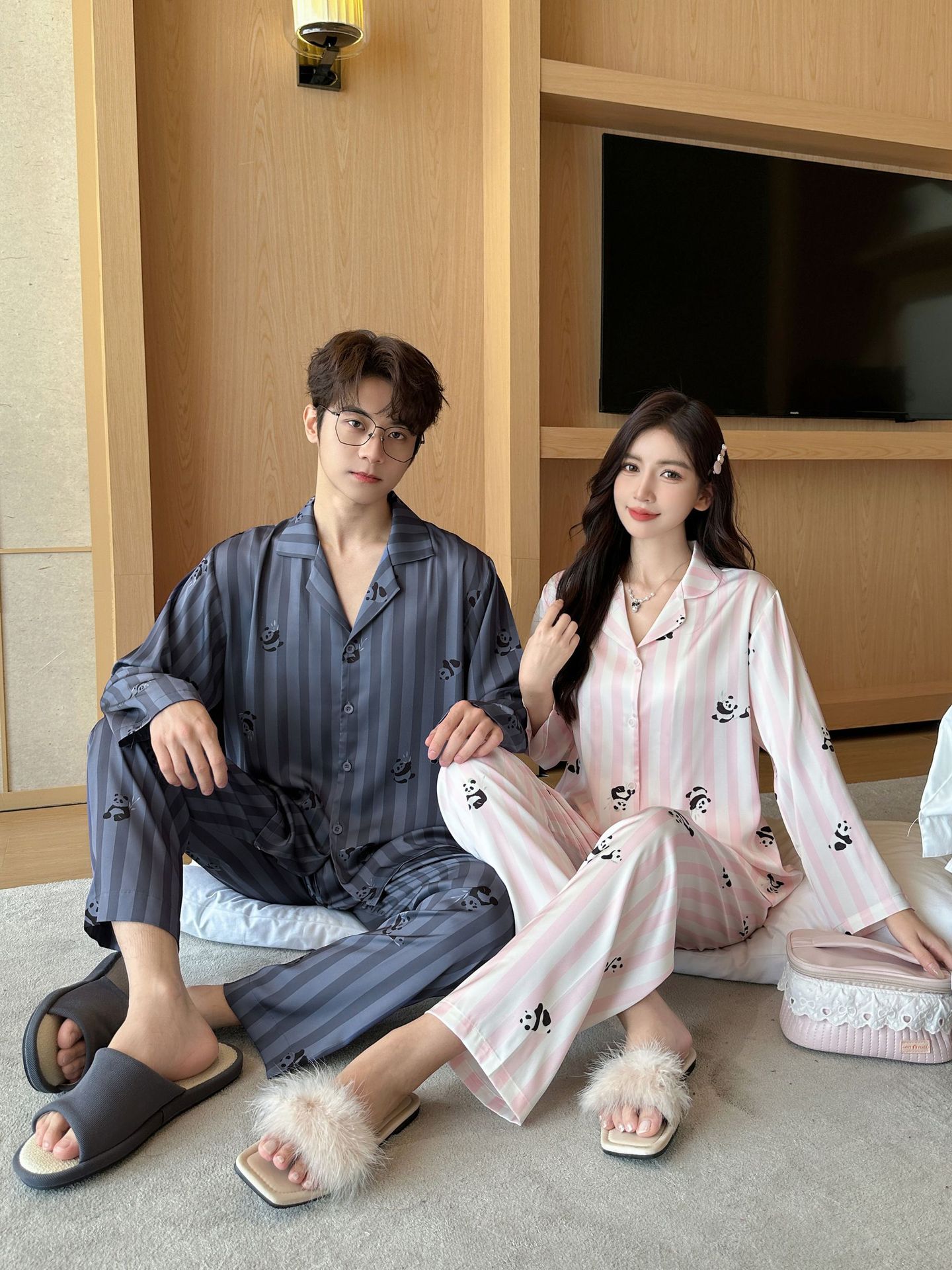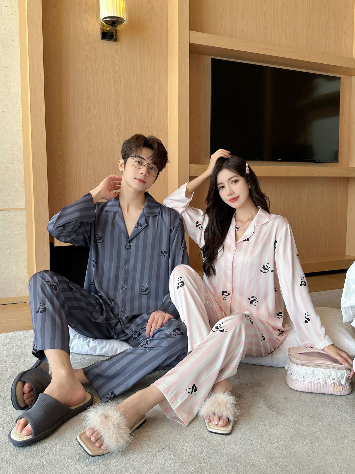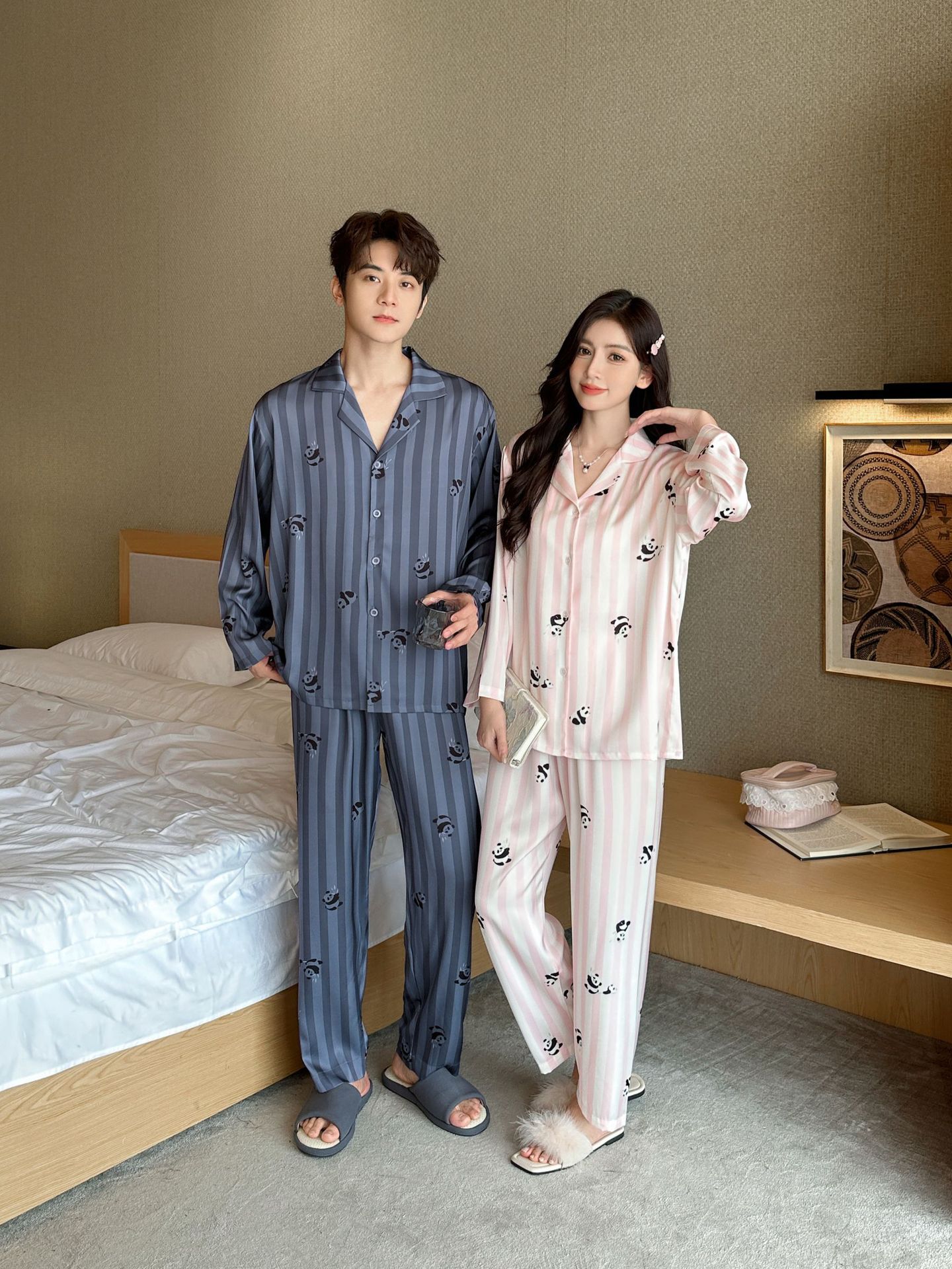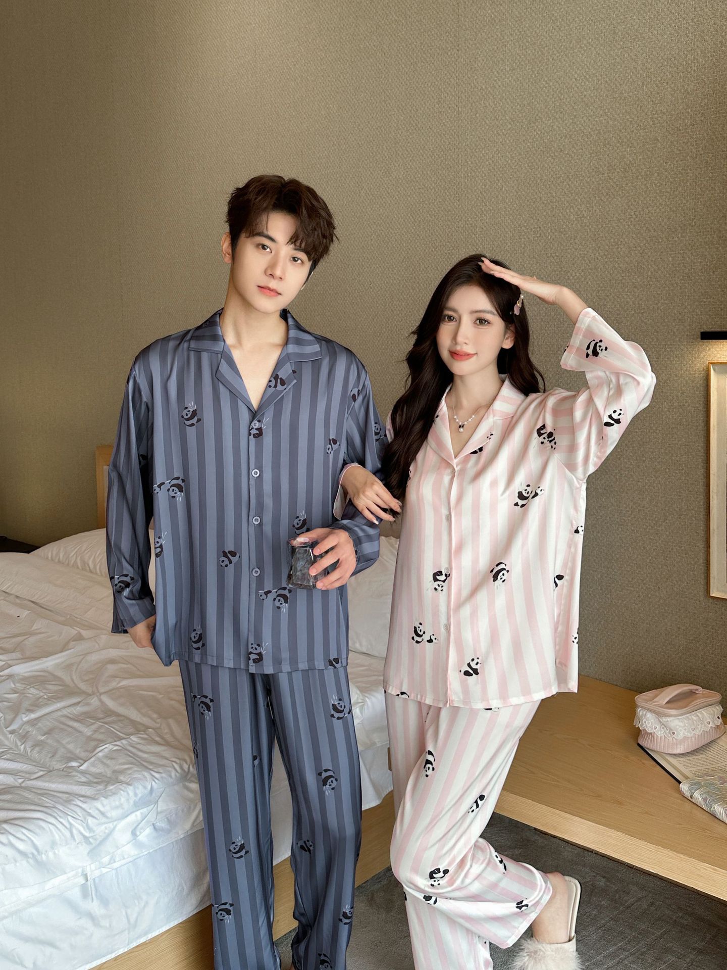 커플 잠옷 여성의 봄과 가을 아이스 실크 긴 소매 귀여운 팬더 홈 옷 가을 캐주얼 세트 남성 1177스토어 가기