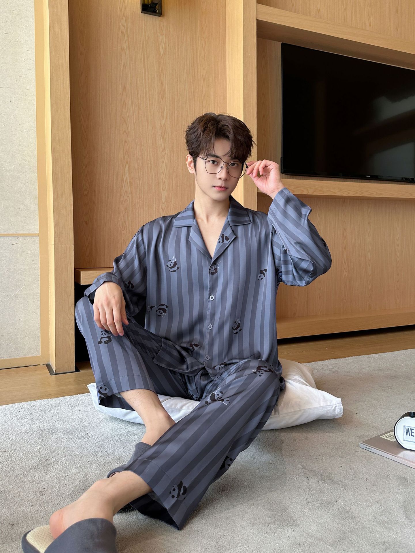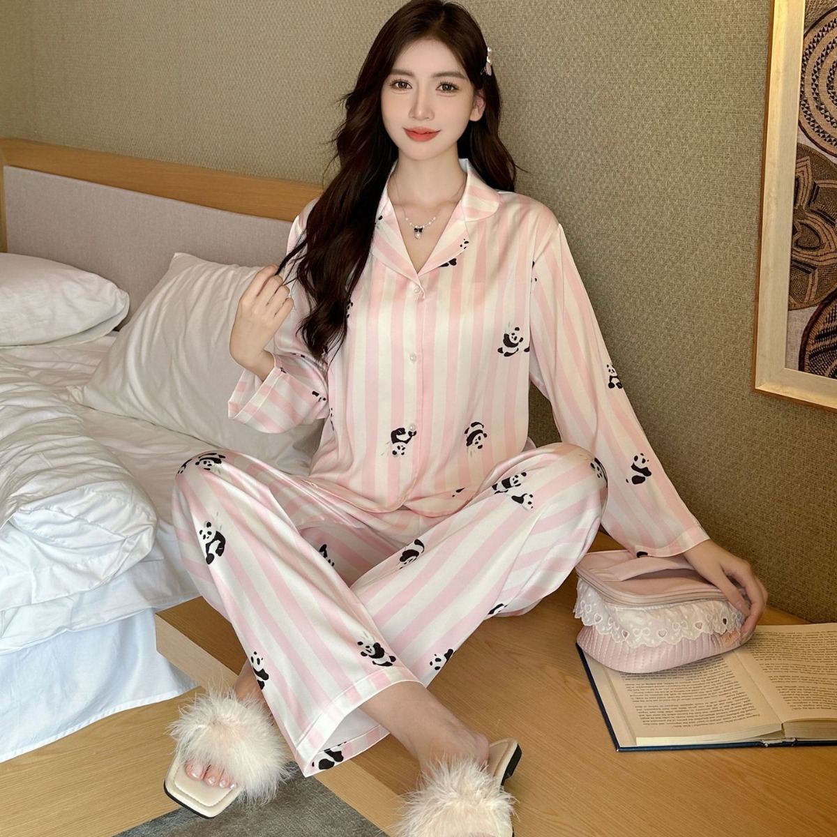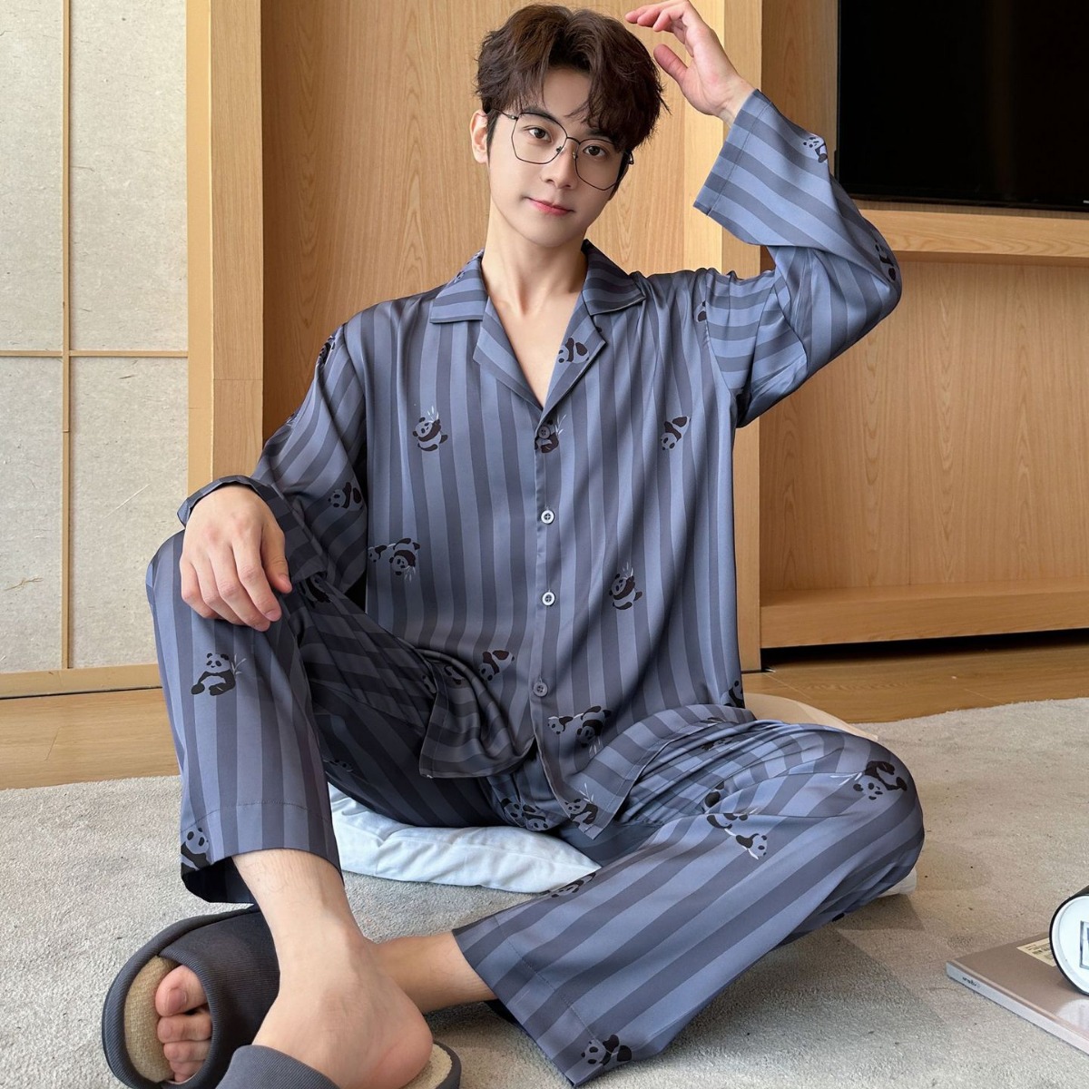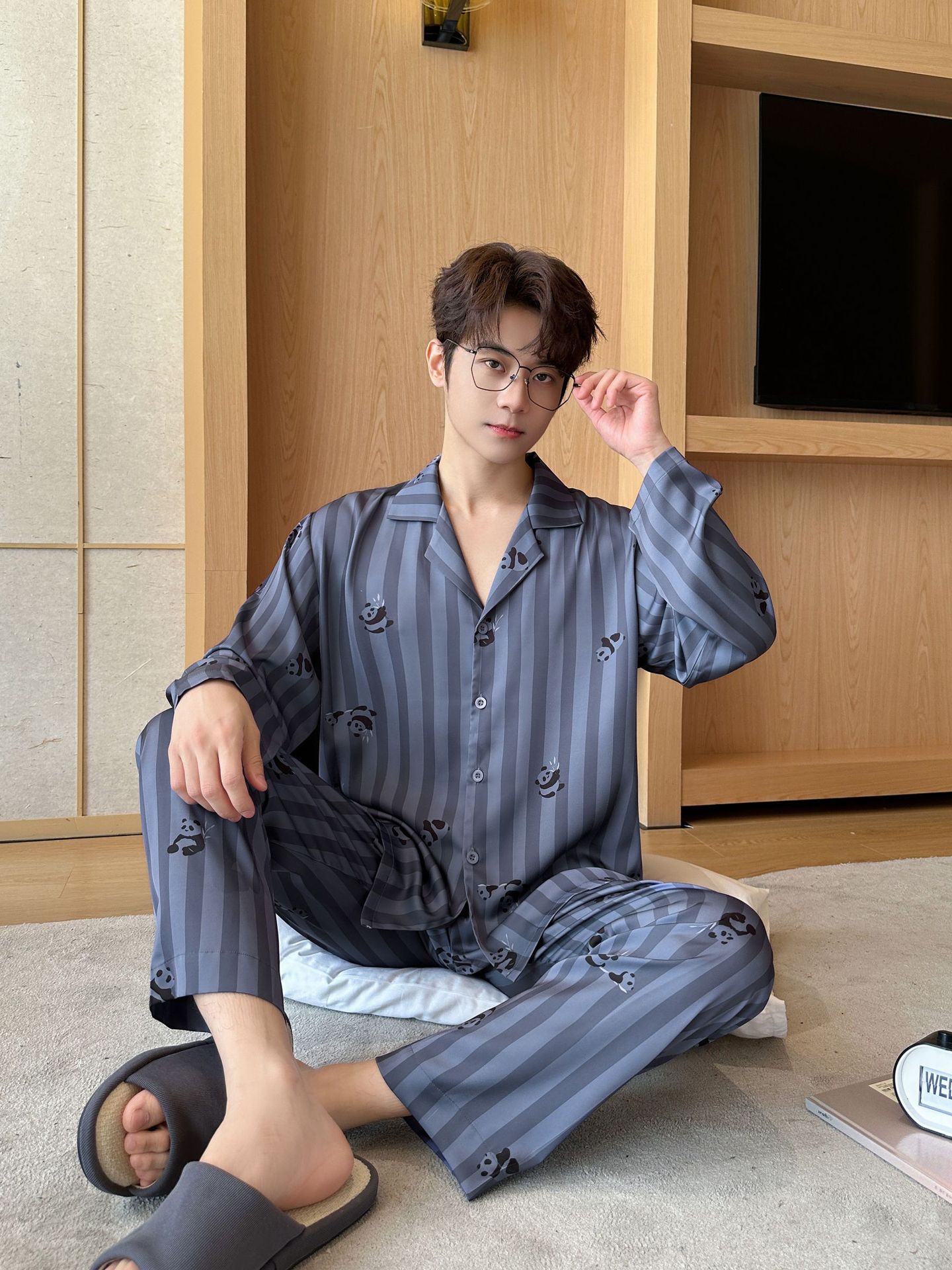 커플 잠옷 여성의 봄과 가을 아이스 실크 긴 소매 귀여운 팬더 홈 옷 가을 캐주얼 세트 남성 1177스토어 가기