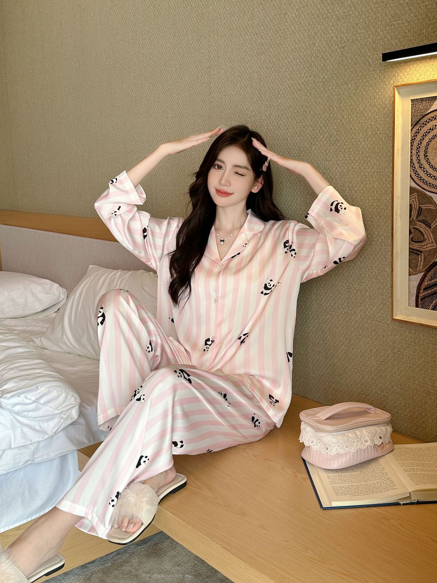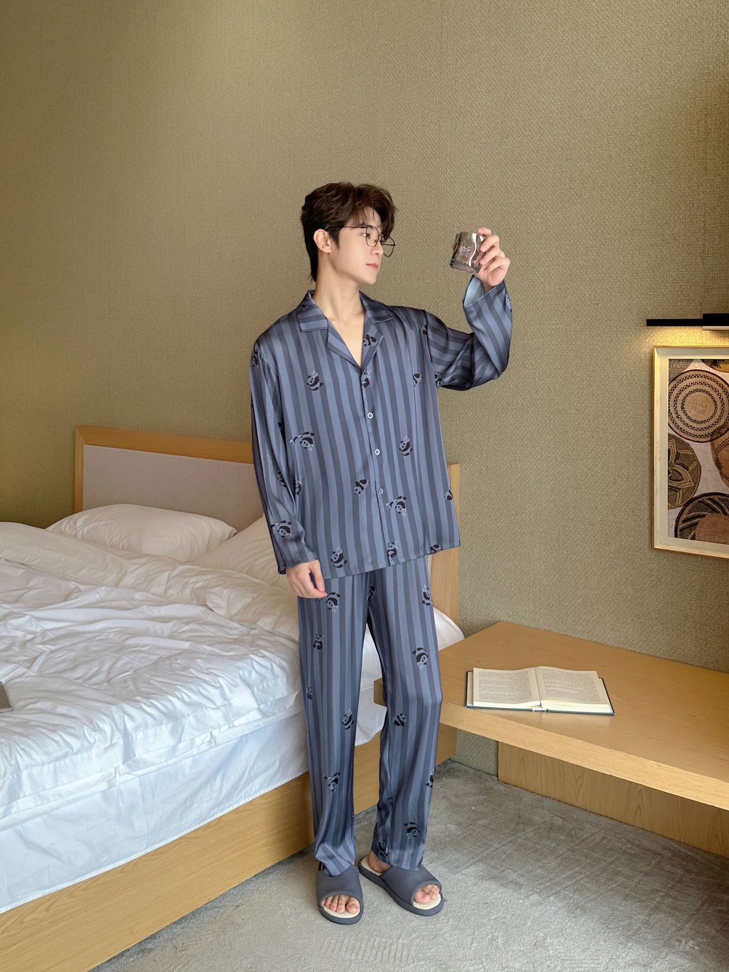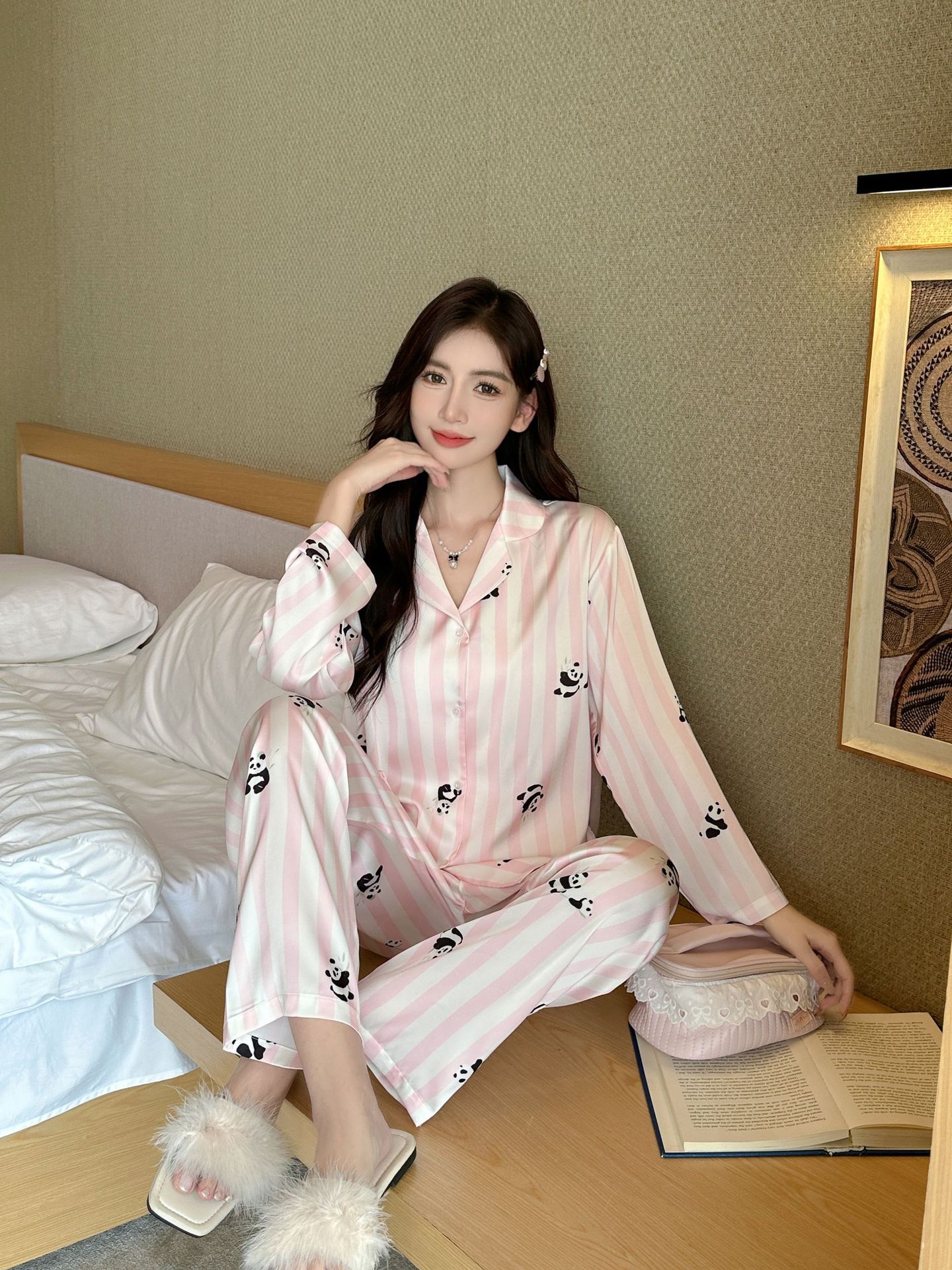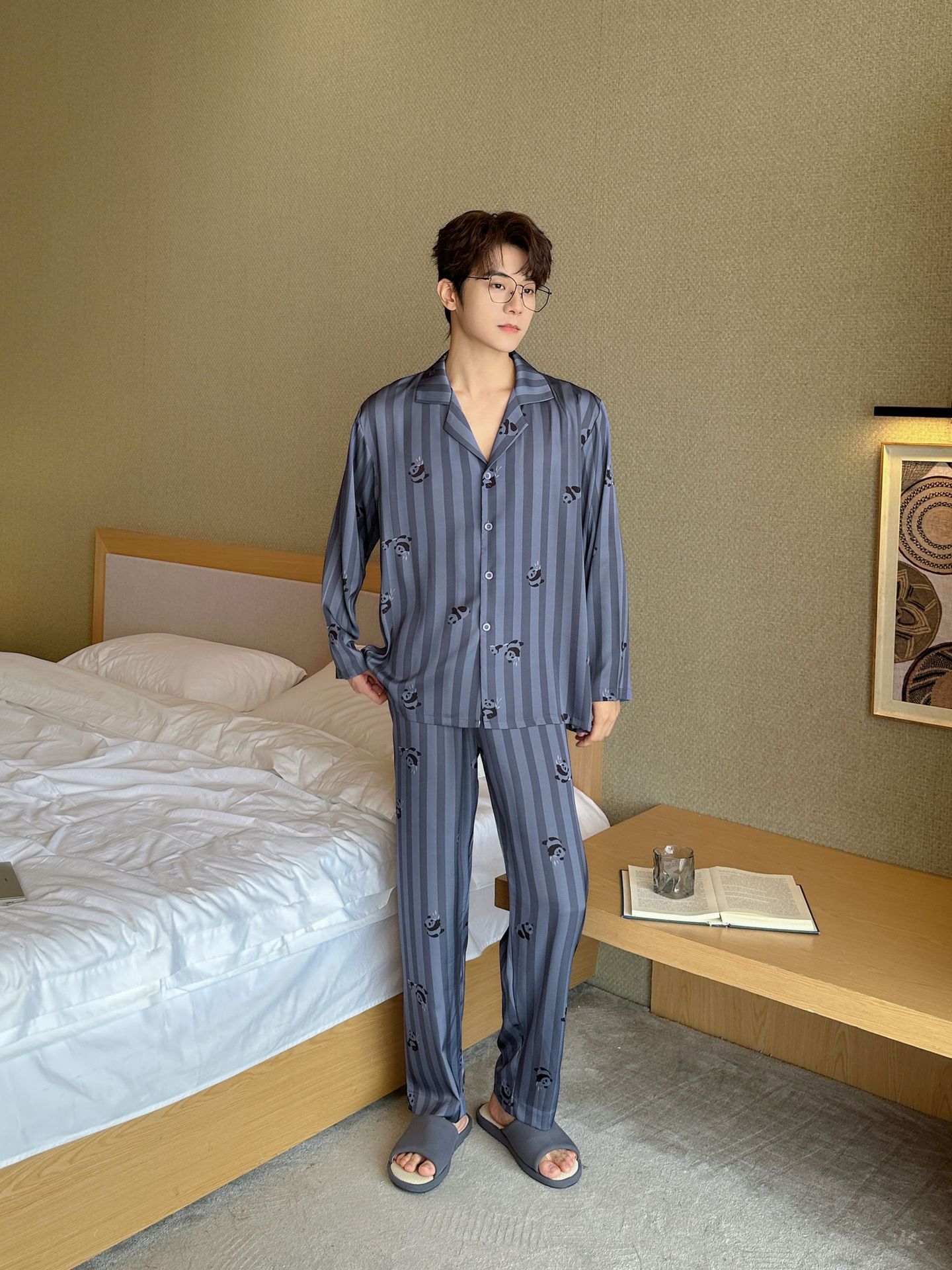 커플 잠옷 여성의 봄과 가을 아이스 실크 긴 소매 귀여운 팬더 홈 옷 가을 캐주얼 세트 남성 1177스토어 가기