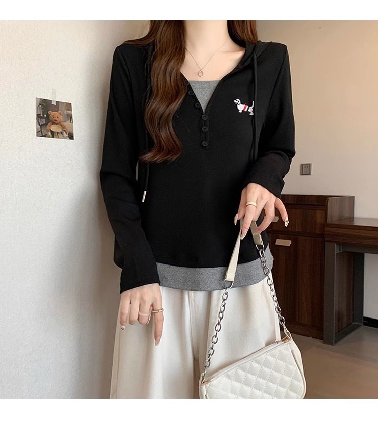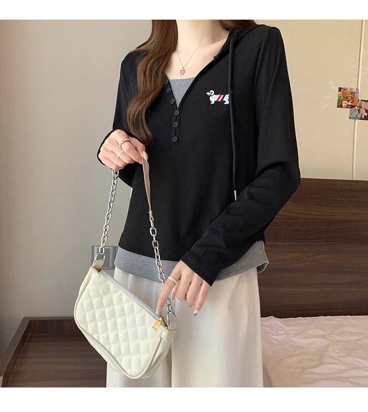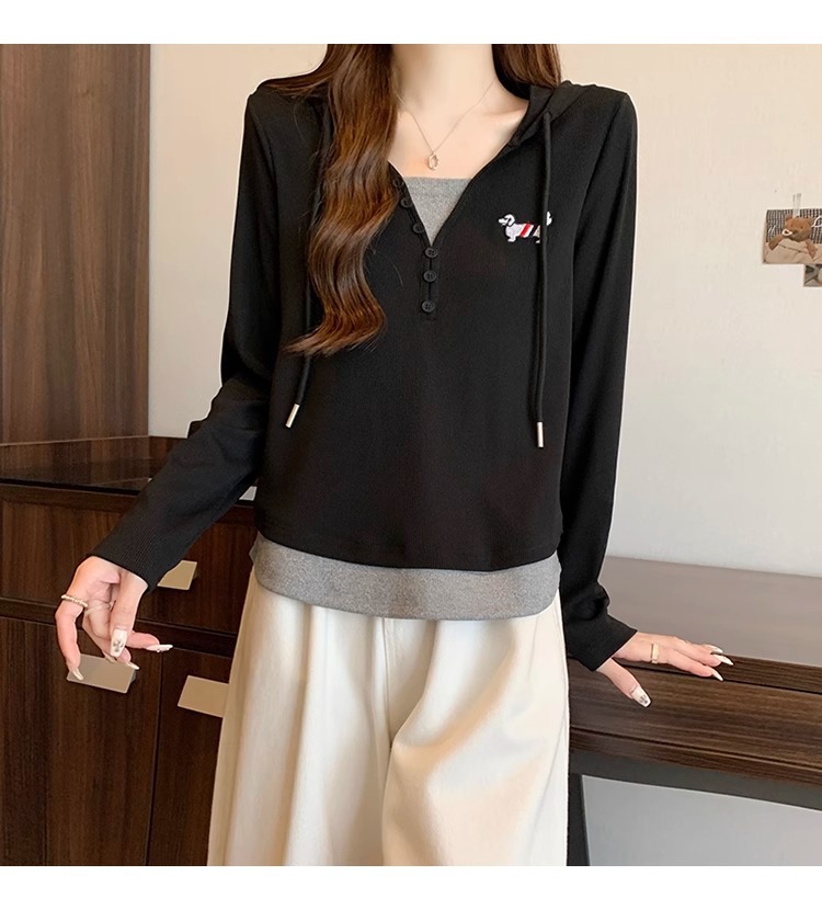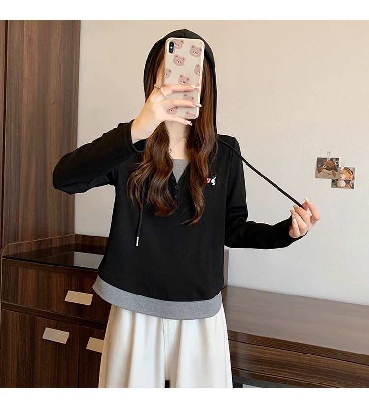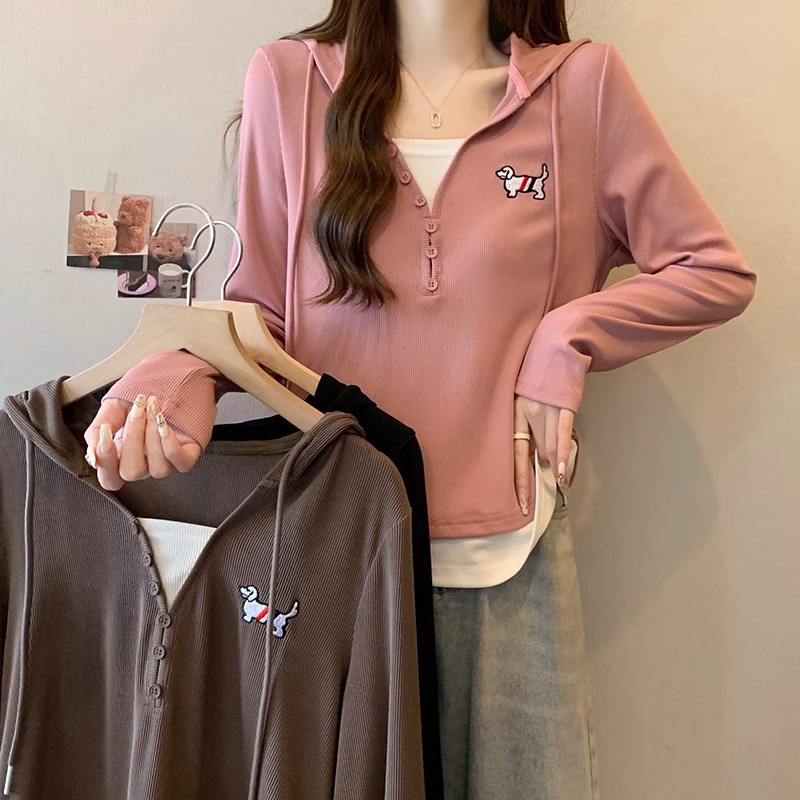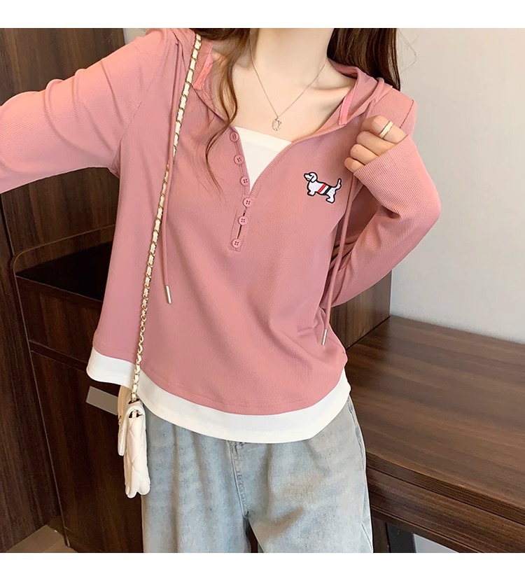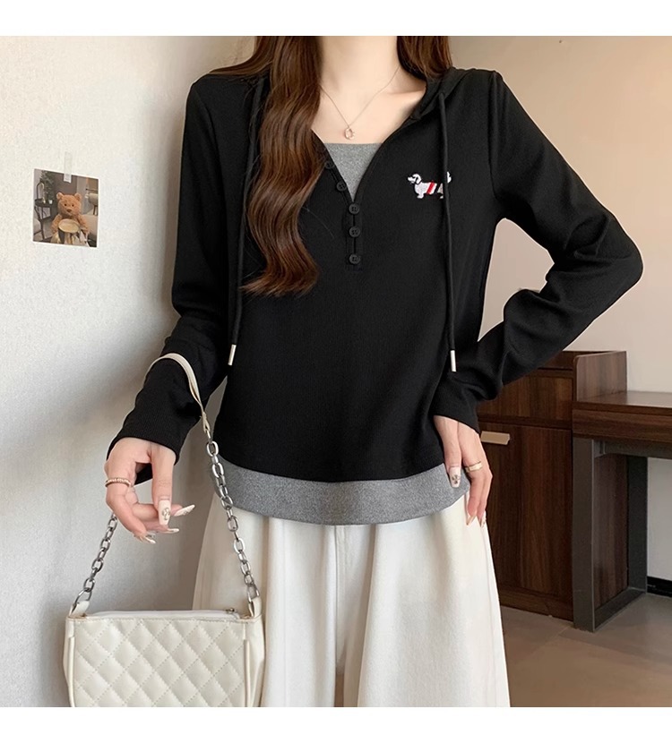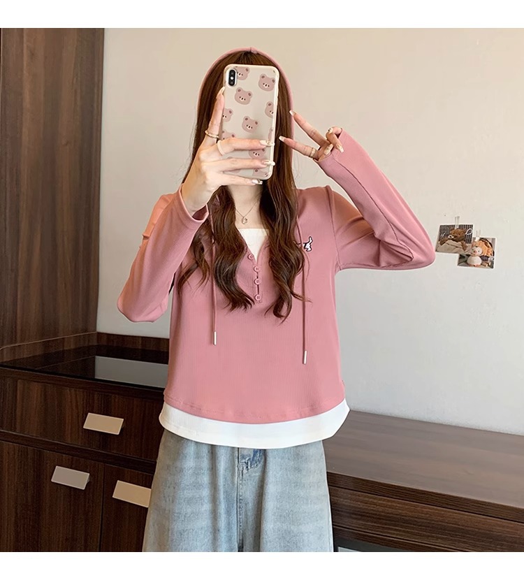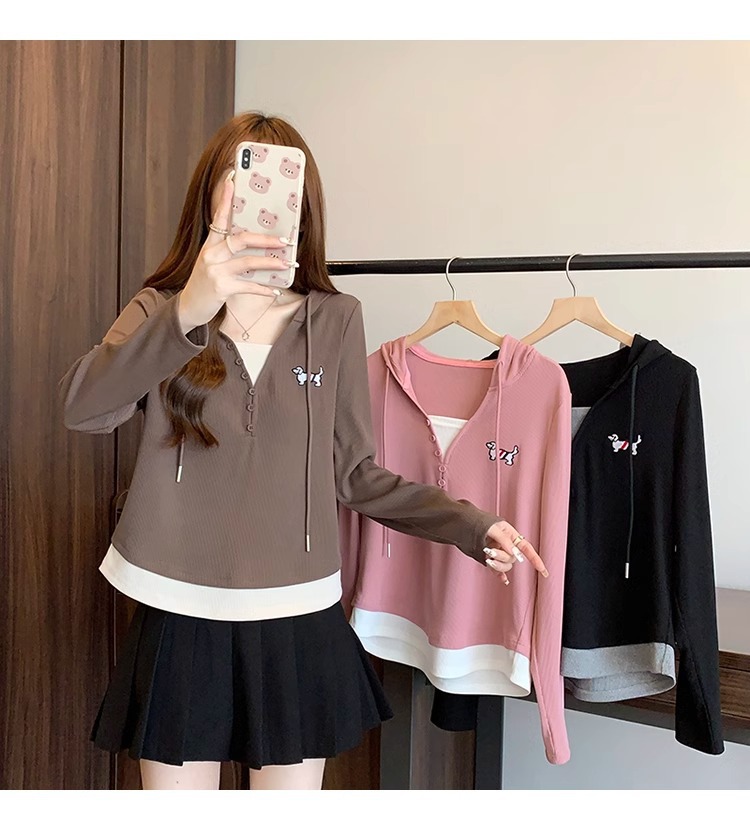 가짜 투피스 후드 긴팔 티셔츠 여성용 가을 플러스 사이즈 통통녀 세련된 작은 셔츠 슬림 불규칙한 스웨터 1.00 kg-150.00 kg스토어 가기