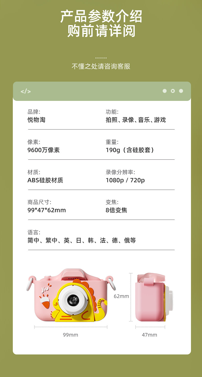 어린이 카메라 아이스크림 공룡 사진 비디오 슈퍼 클리어 듀얼 카메라 장난감 소녀의 작은 카메라