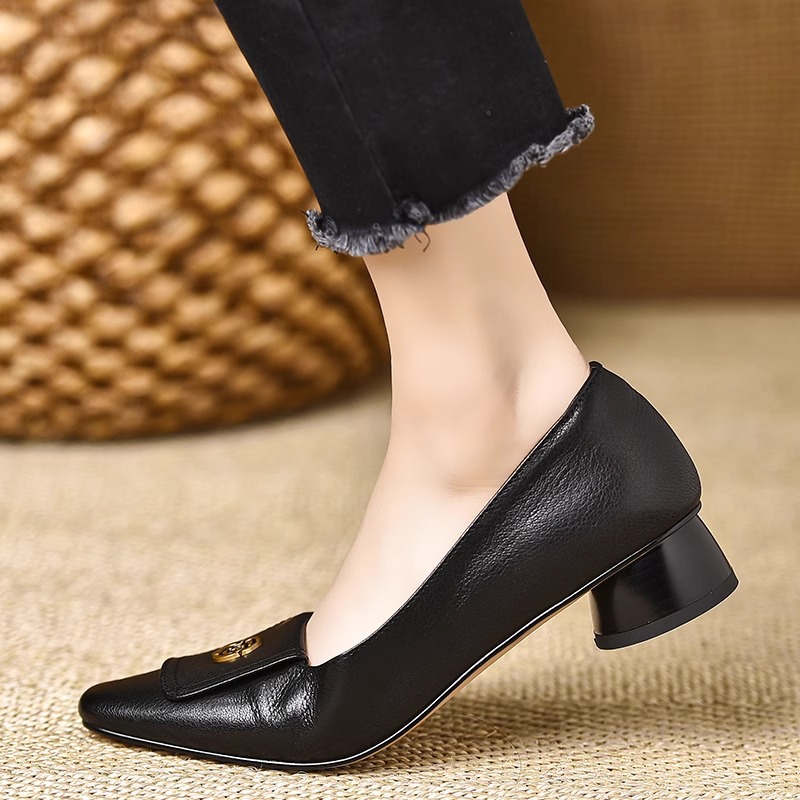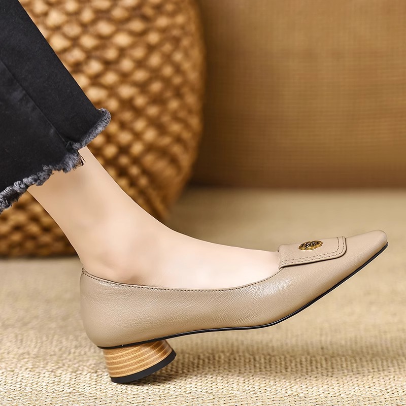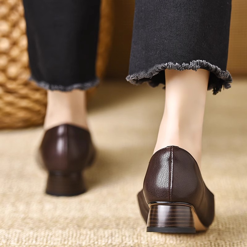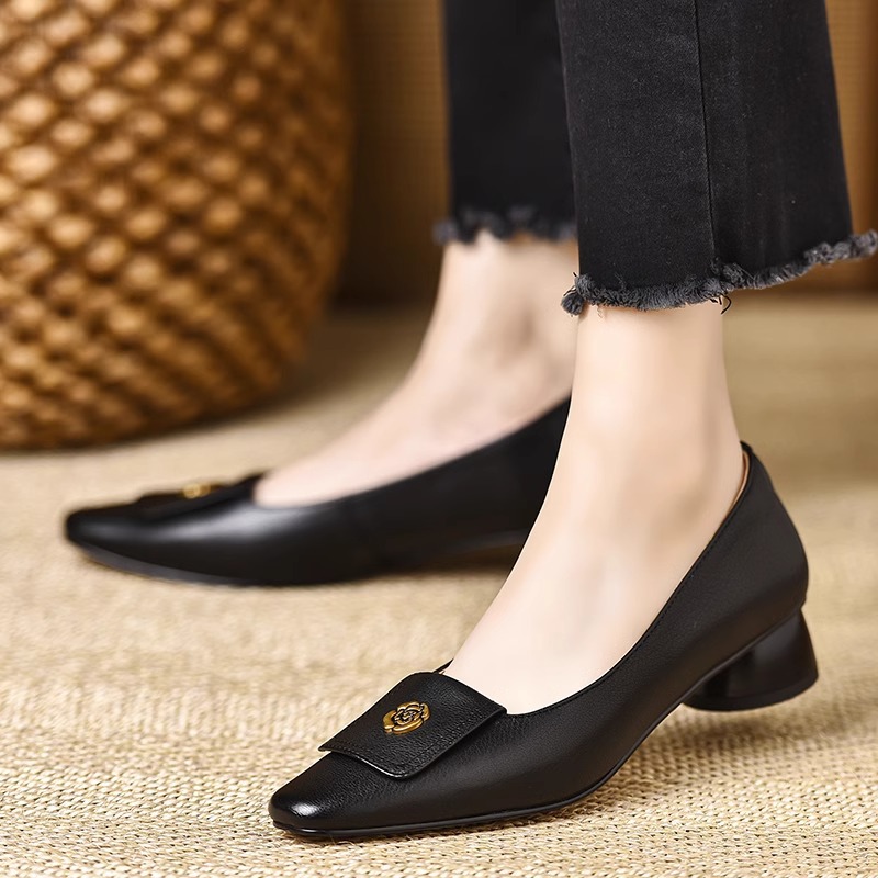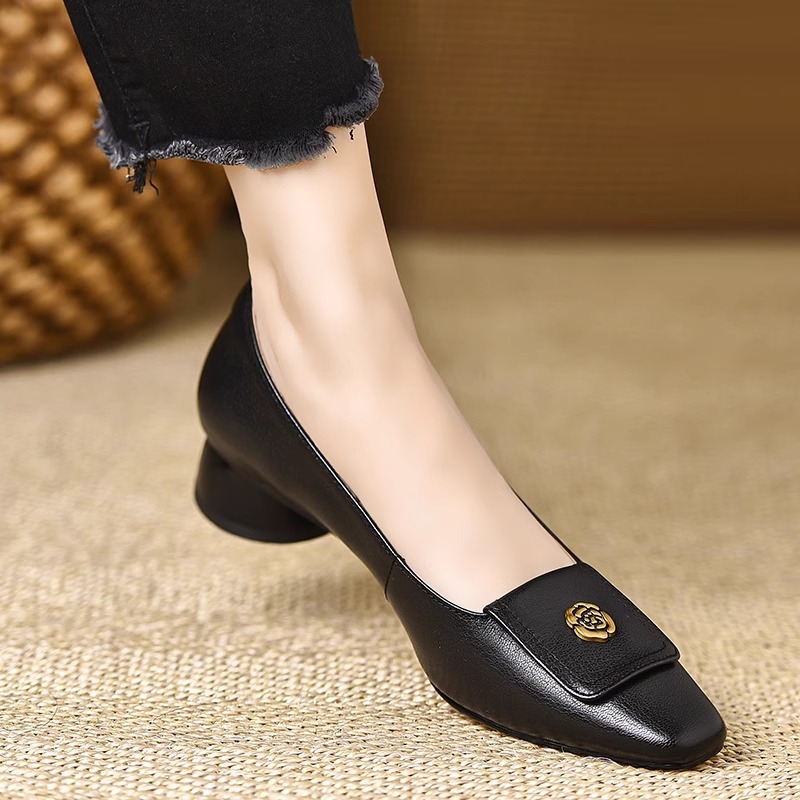 Qi Yan ~ 3cm 첫 번째 레이어 부드러운 동백 사각형 머리 얕은 입 두꺼운 발 뒤꿈치 신발 여성의 편안한 낮은 발 뒤꿈치 부드러운 가죽 신발
