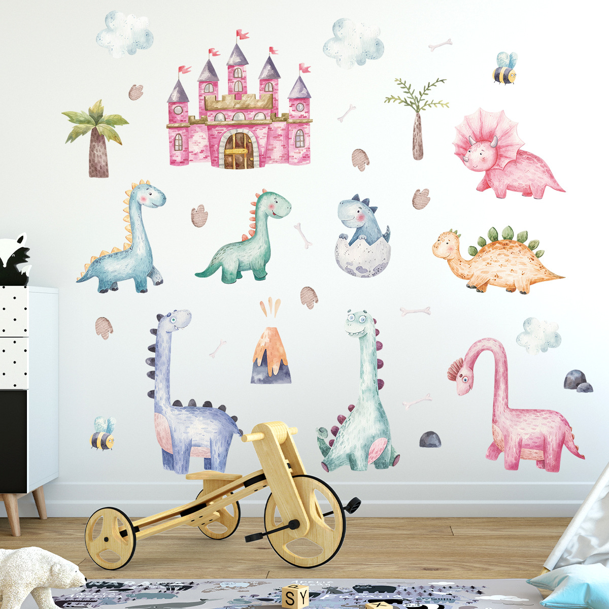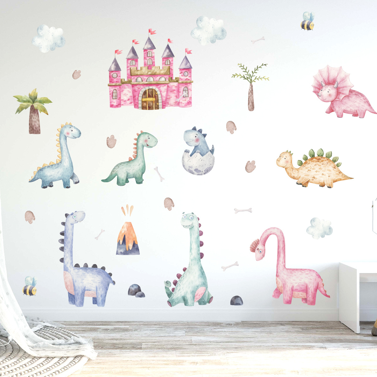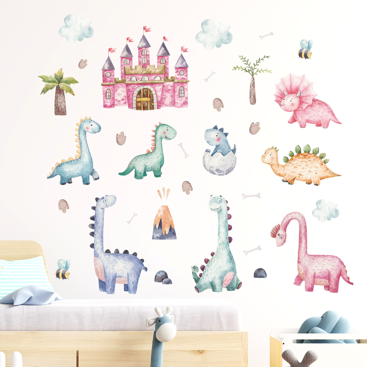 만화 핑크 성 귀여운 작은 공룡 자기 접착 벽 스티커 Ins 어린이 방 침실 장식 스티커 BR0926H스토어 가기