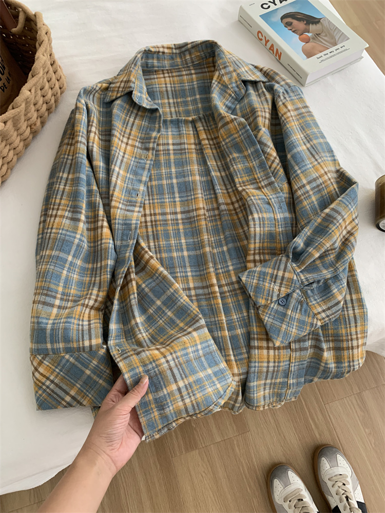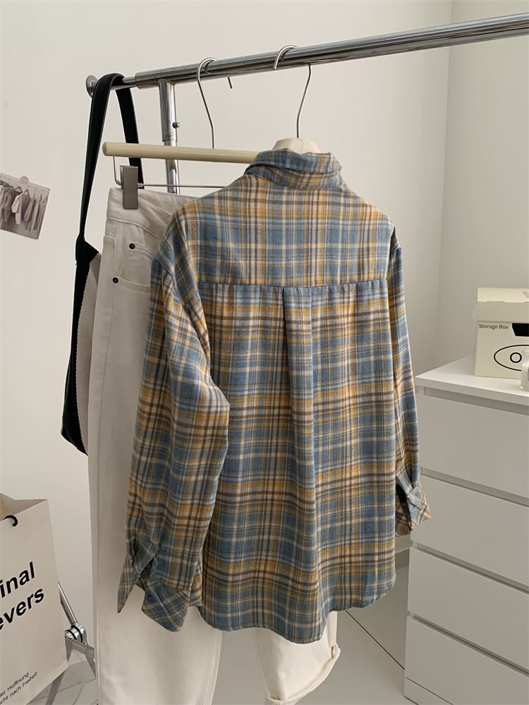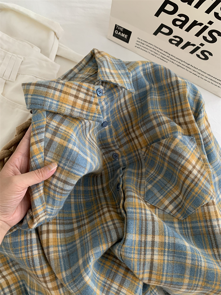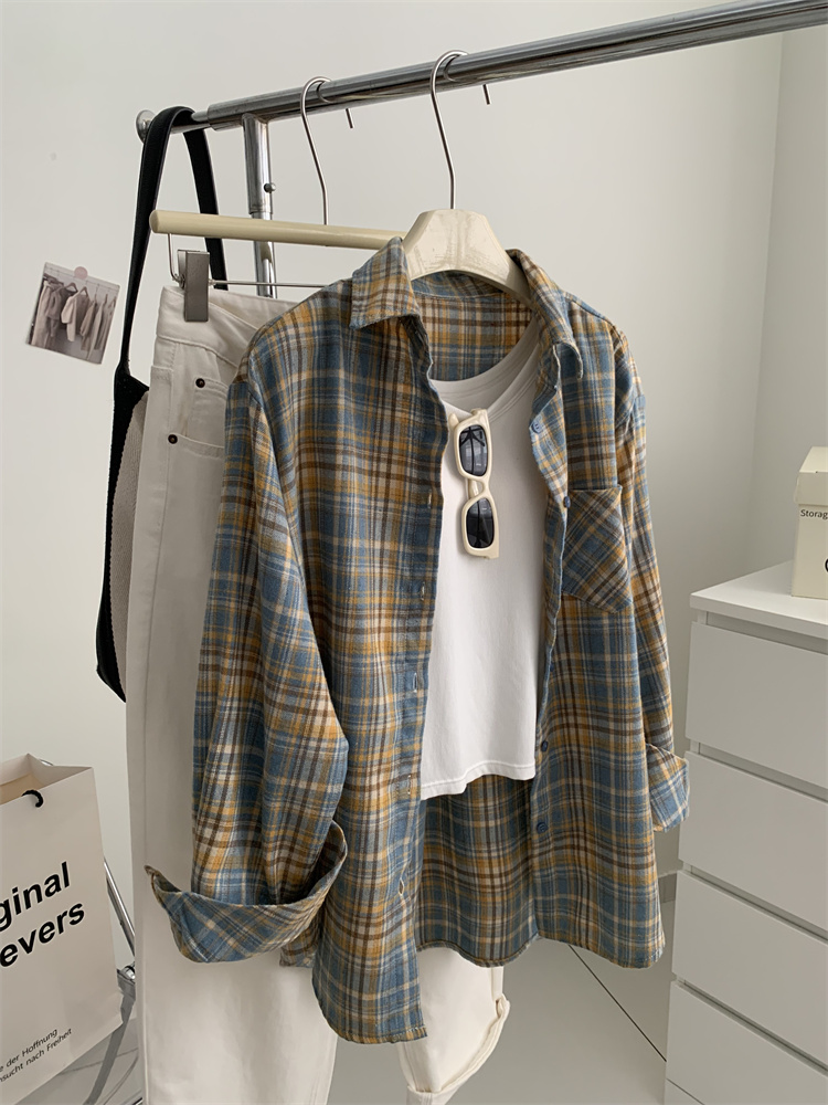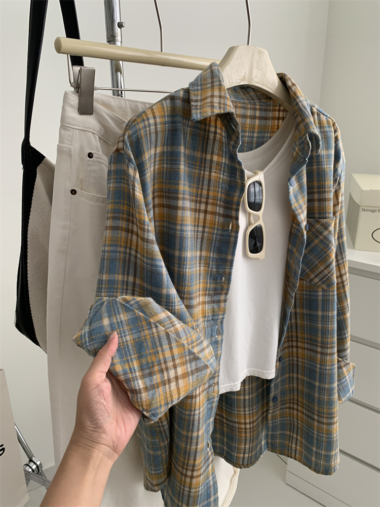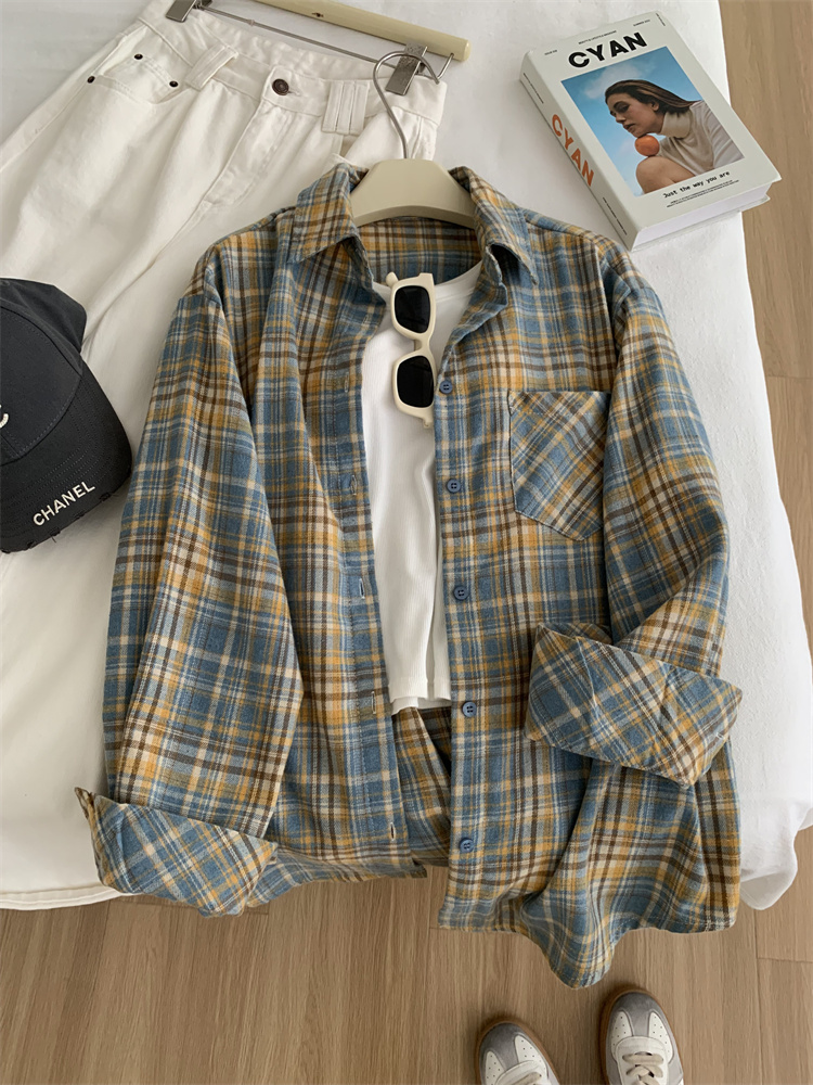 예술적 복고풍 흰색 노란색 파란색 격자 무늬 셔츠 여성의 봄과 가을 느슨한 캐주얼 중립 샌딩 셔츠 카디건 재킷
