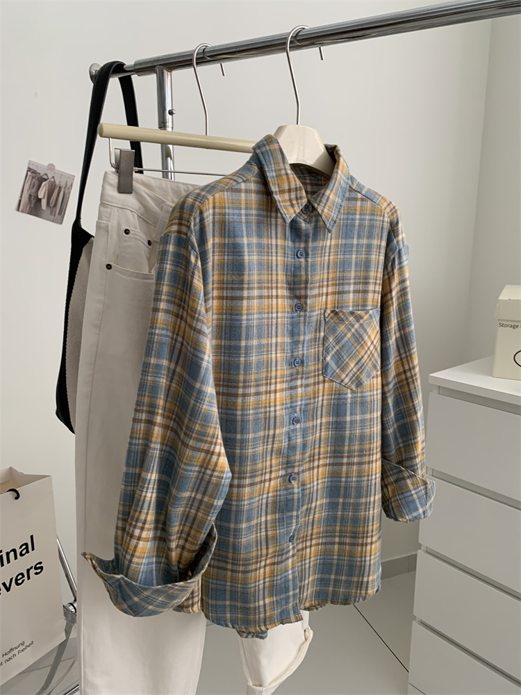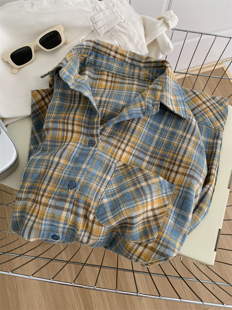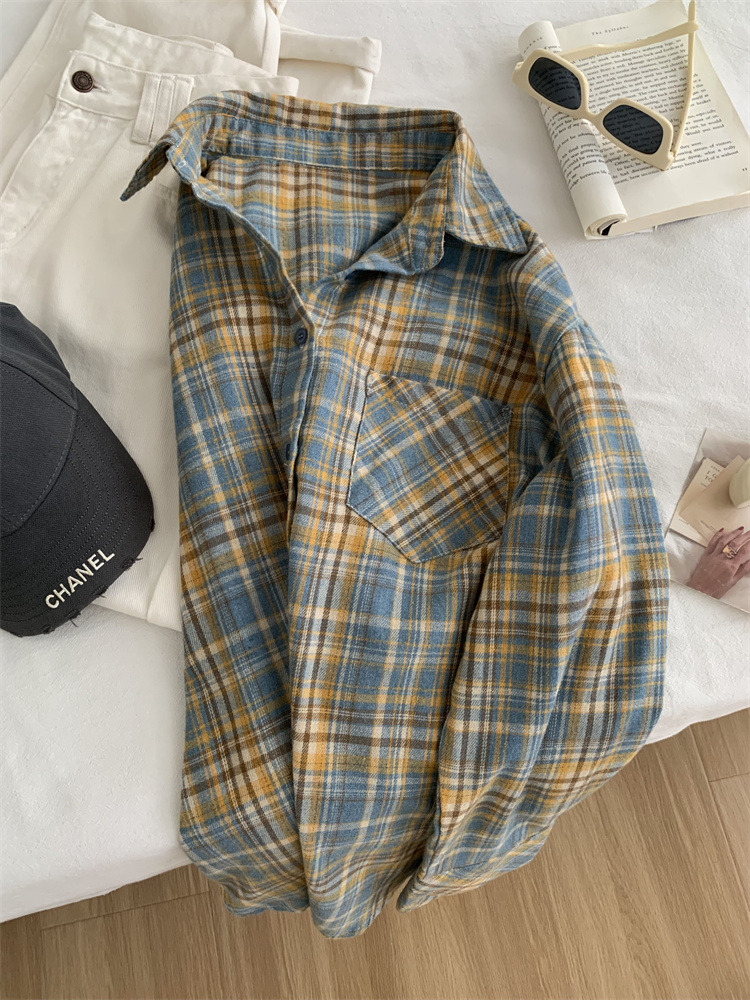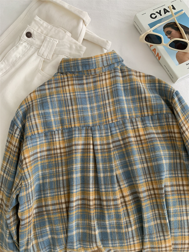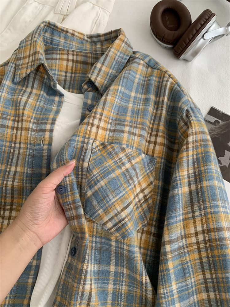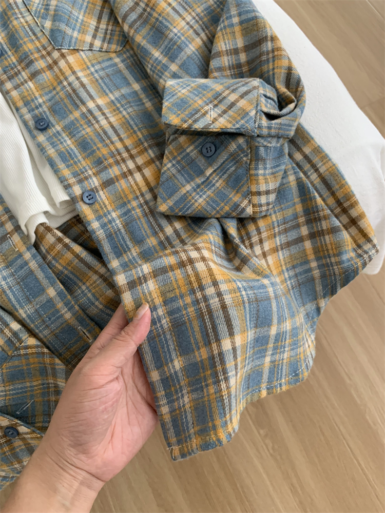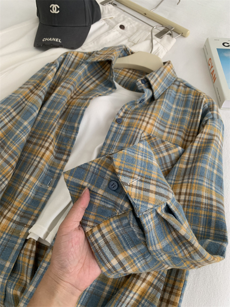 예술적 복고풍 흰색 노란색 파란색 격자 무늬 셔츠 여성의 봄과 가을 느슨한 캐주얼 중립 샌딩 셔츠 카디건 재킷