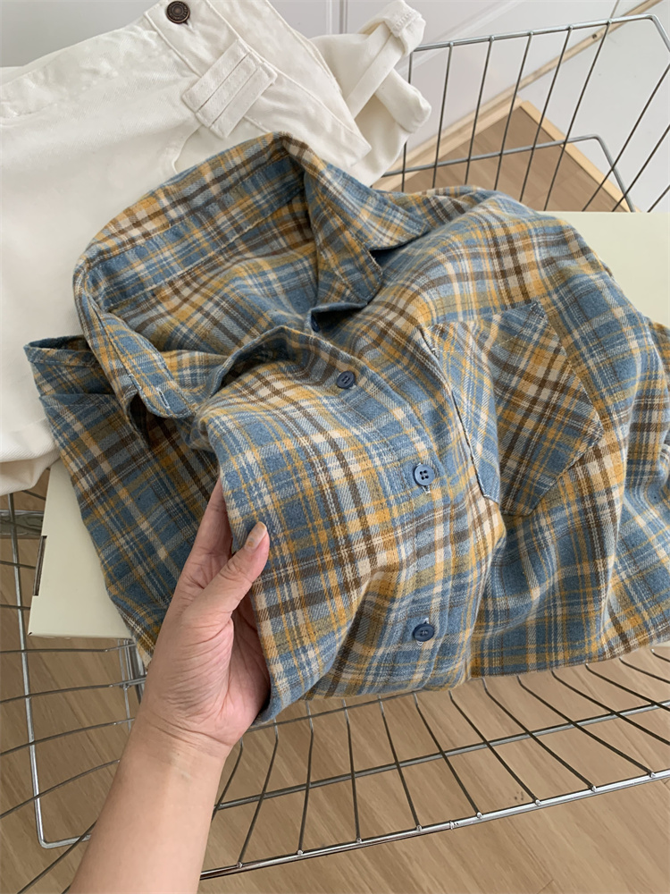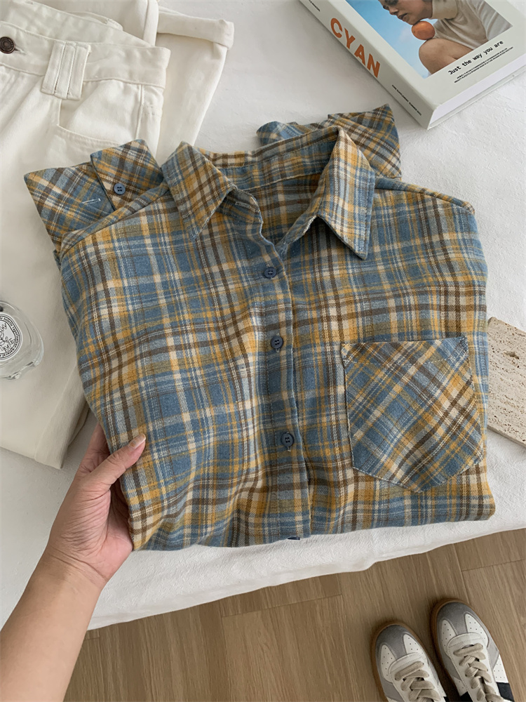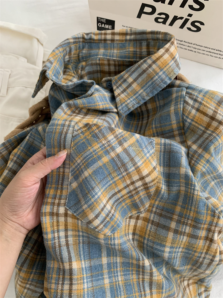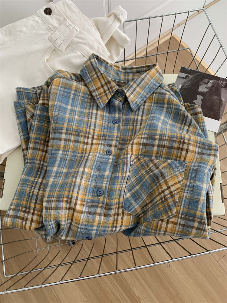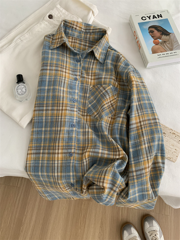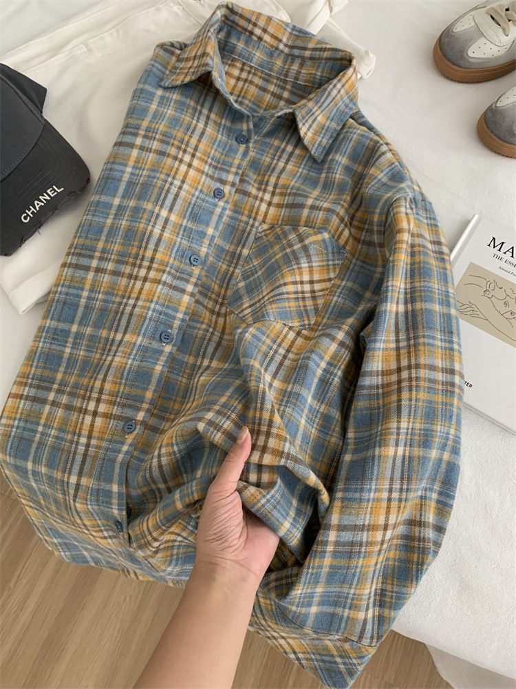 예술적 복고풍 흰색 노란색 파란색 격자 무늬 셔츠 여성의 봄과 가을 느슨한 캐주얼 중립 샌딩 셔츠 카디건 재킷