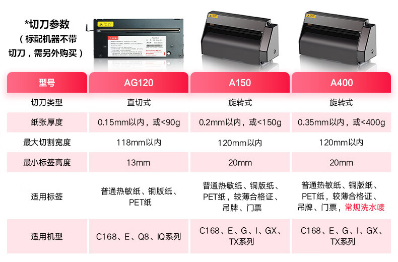 • E200i+AG120 커터(라벨 용지를 절단할 수 있지만 라벨을 절단하고 세척하는 것은 권장하지 않음)