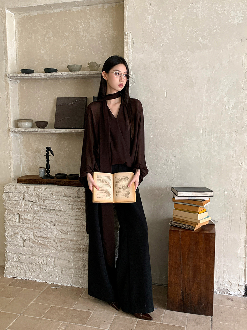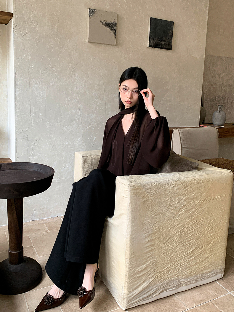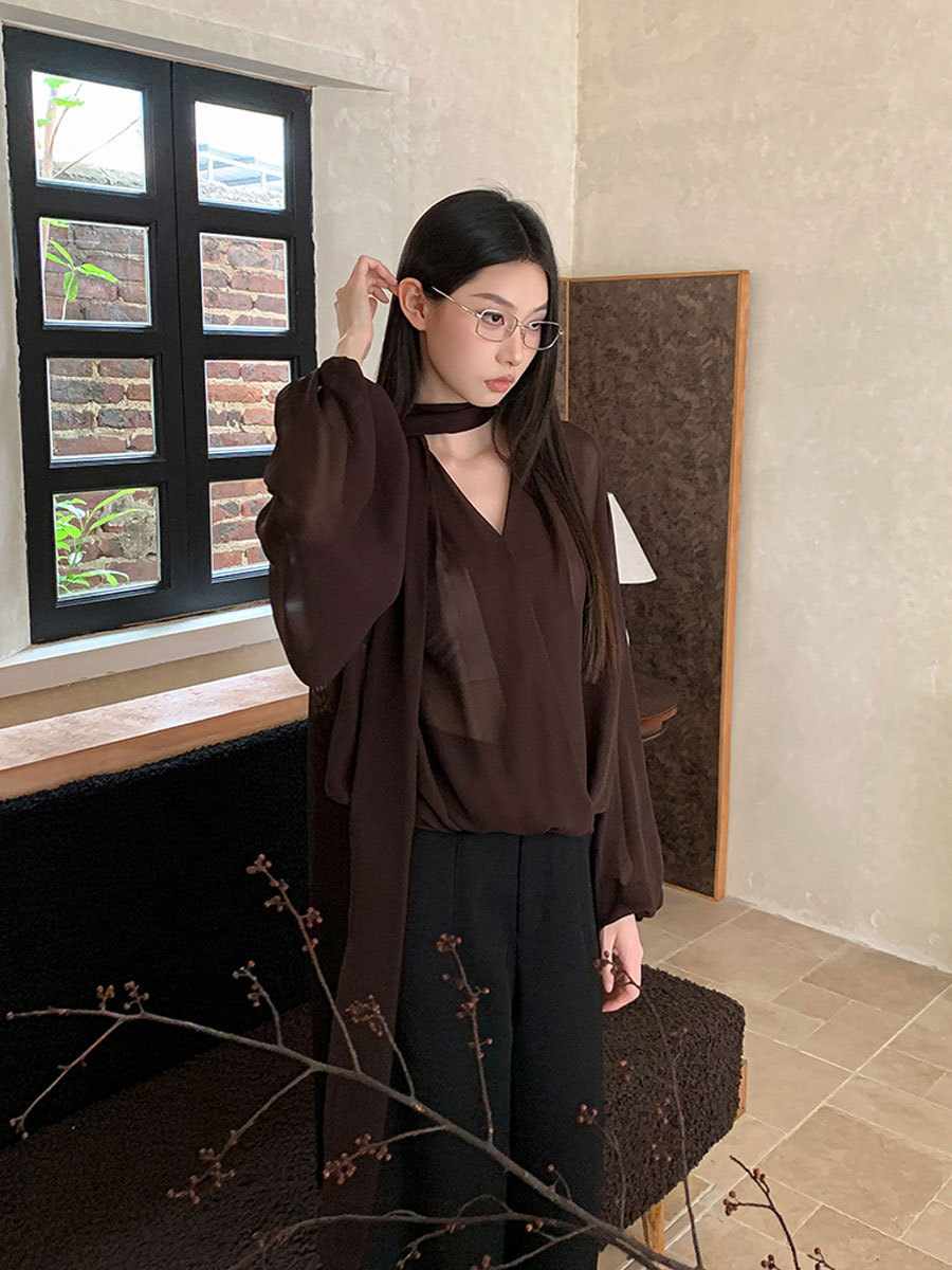 시폰 셔츠 여성 디자인 센스 틈새 V-넥 스트랩 긴 소매 느슨한 슬리밍 선 스크린 풀오버 프랑스 시대 감소 탑스토어 가기