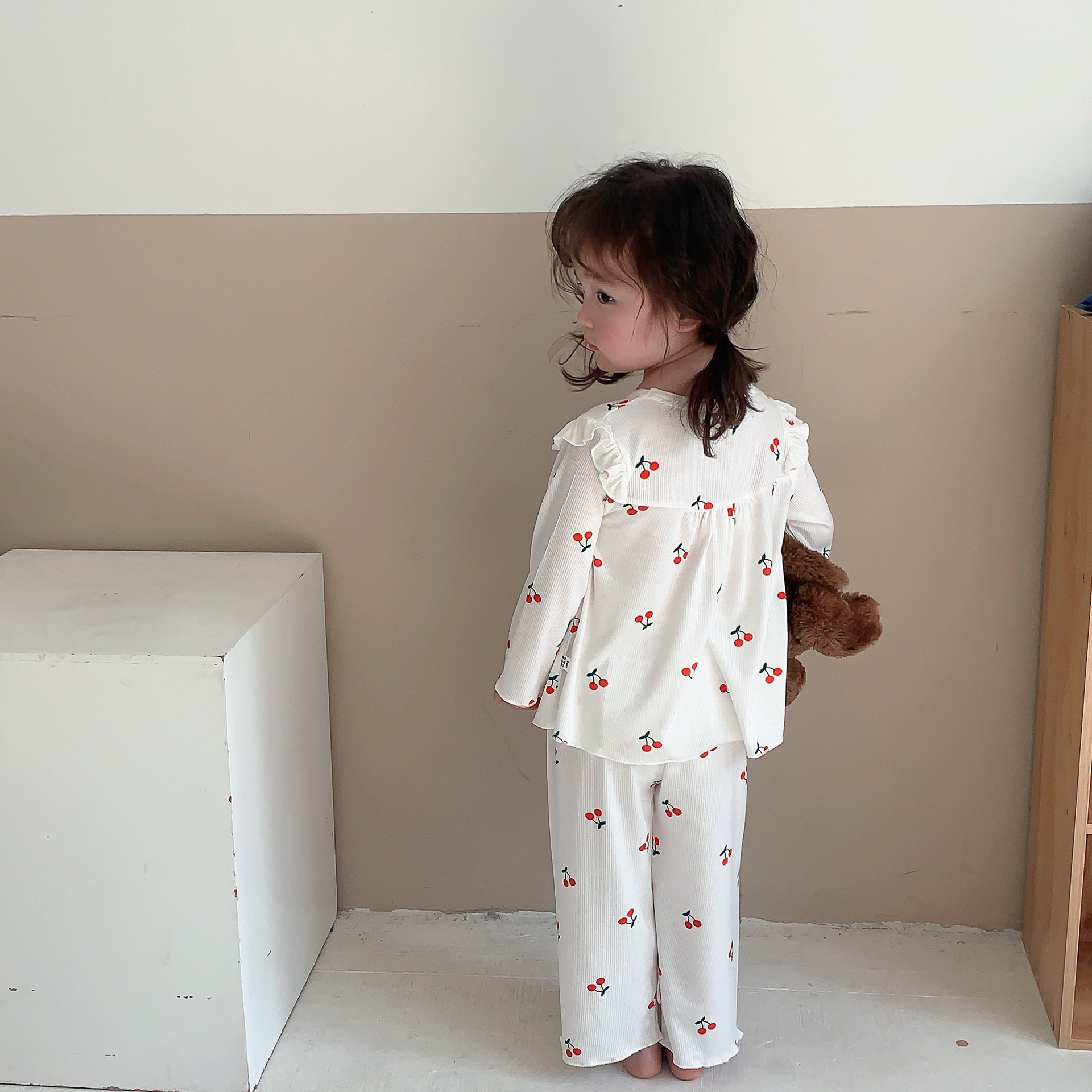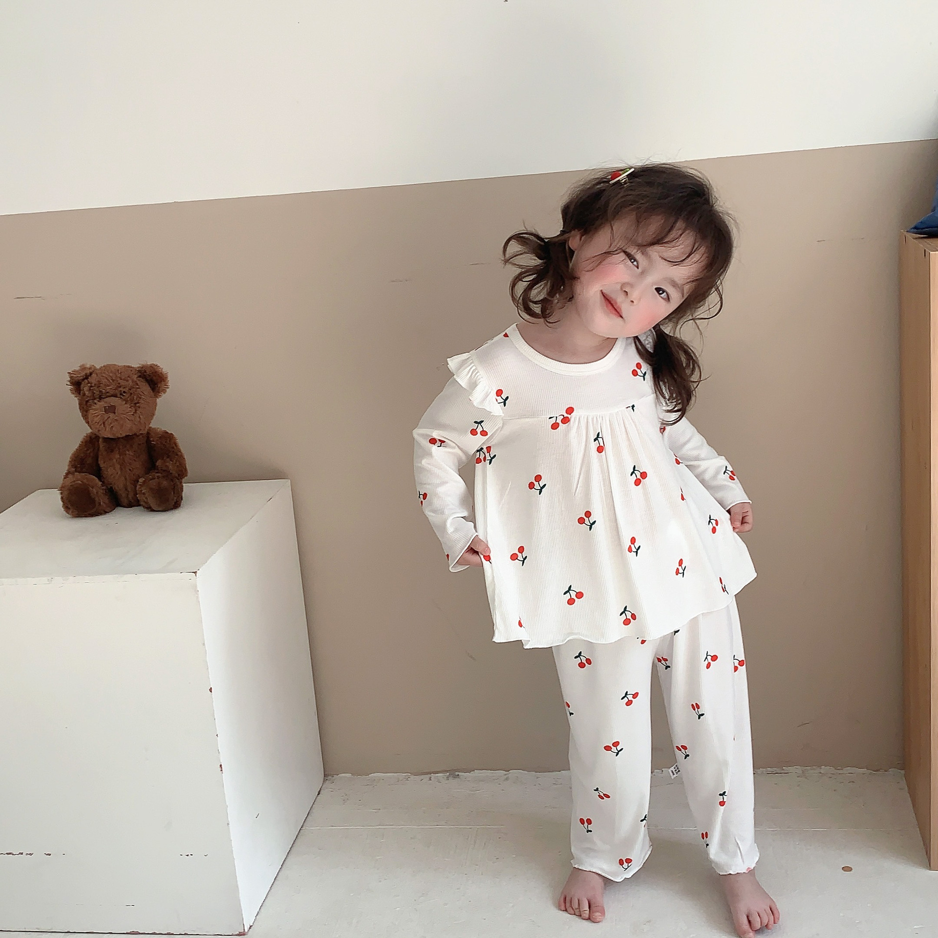 • 아이스 실크 잠옷 정장 흰색 체리