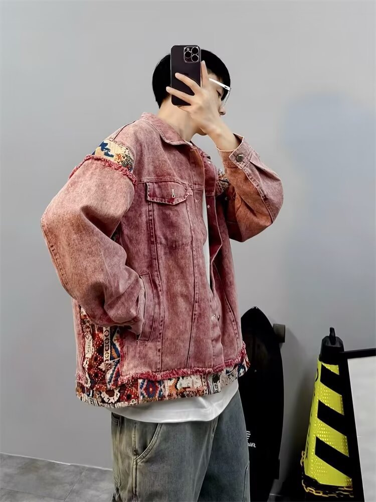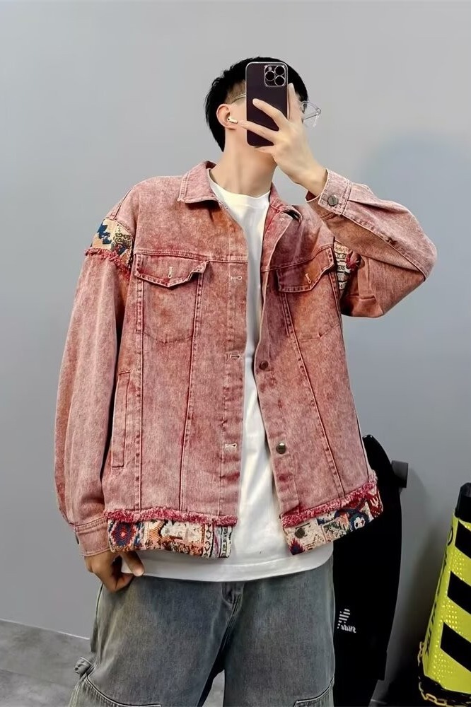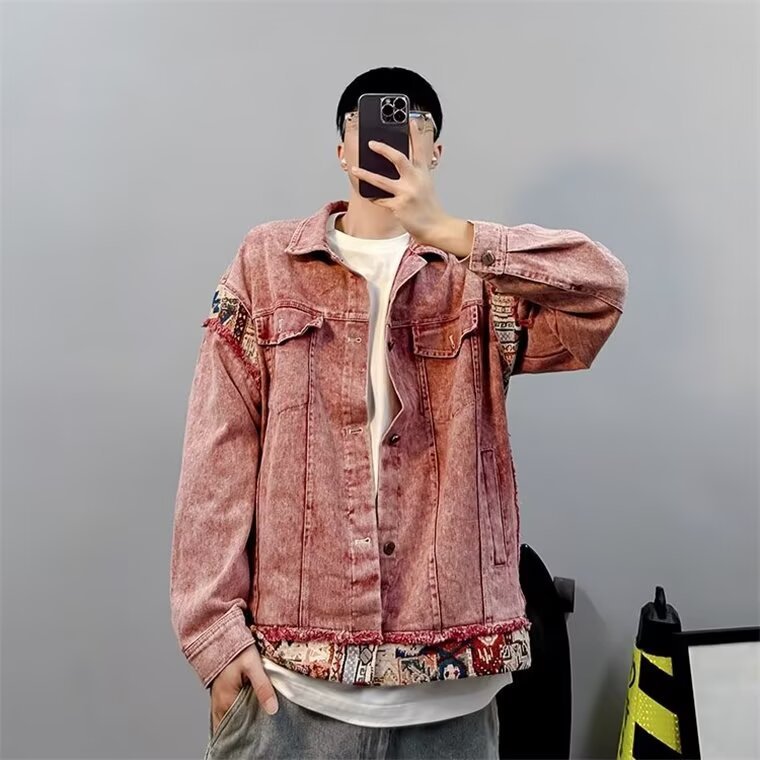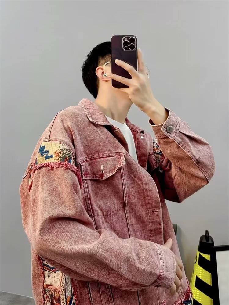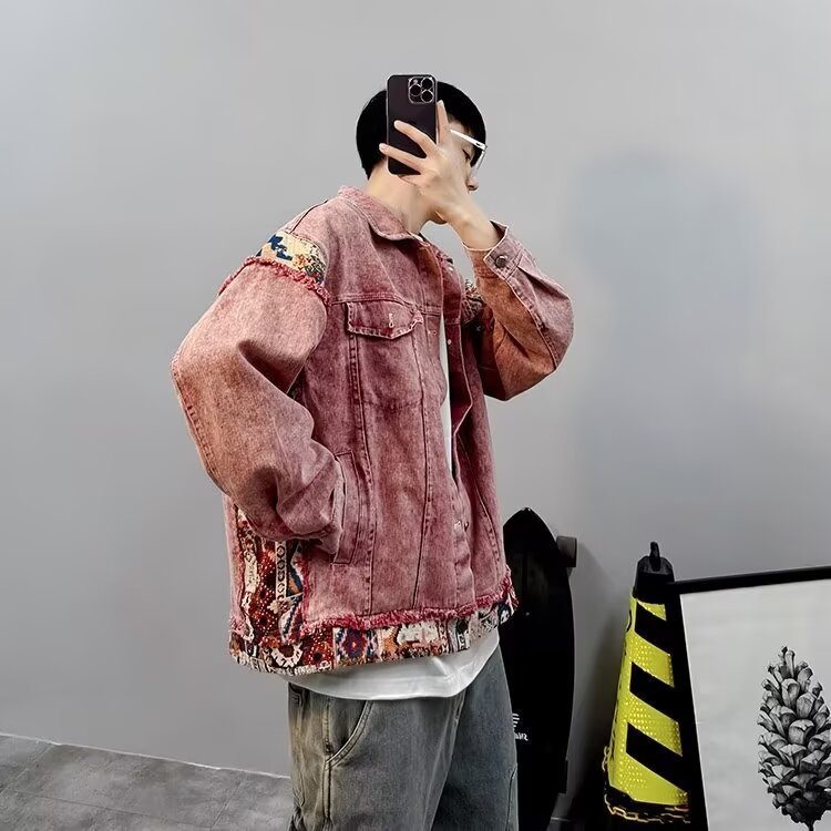 핑크 워싱 스플라이스 데님 재킷 남녀 커플 야구복 패션 트렌드 브랜드 남성 라펠 재킷 캐주얼 다용도스토어 가기