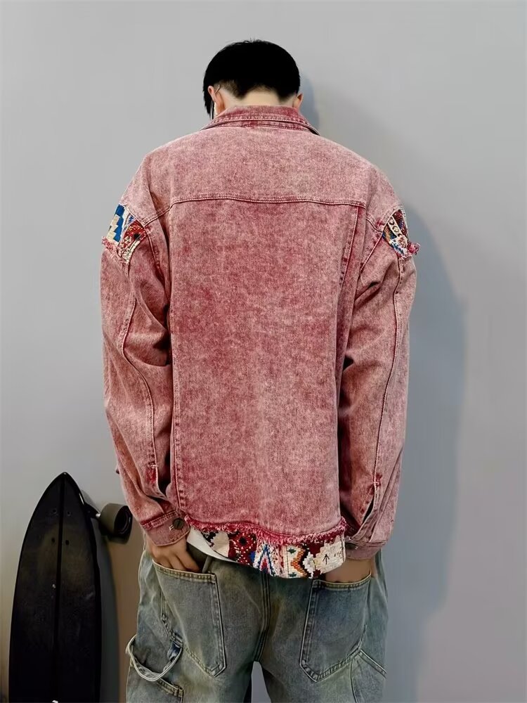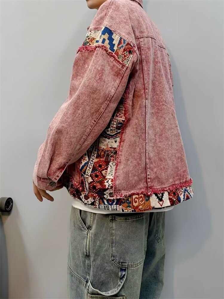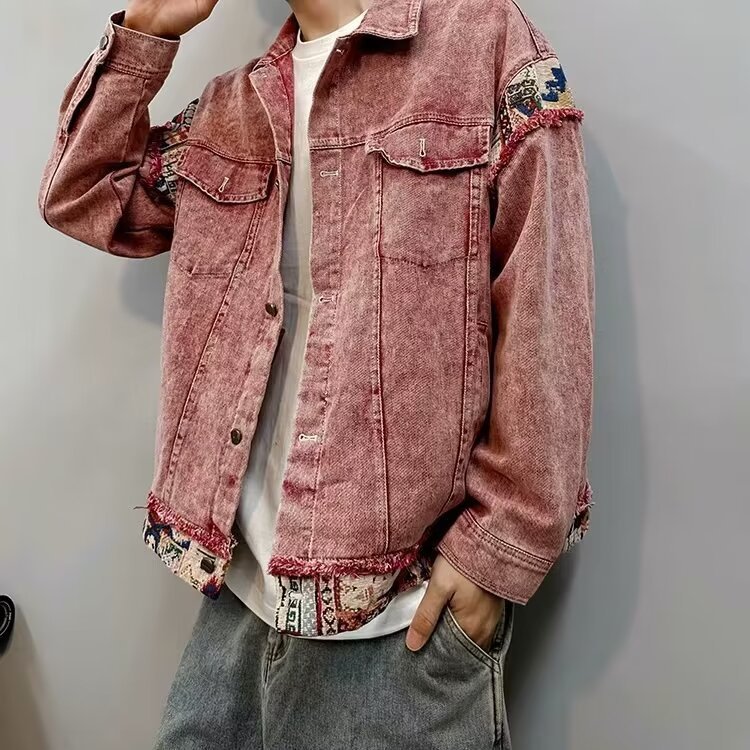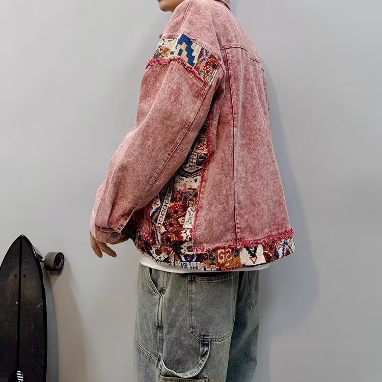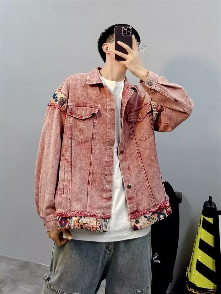 핑크 워싱 스플라이스 데님 재킷 남녀 커플 야구복 패션 트렌드 브랜드 남성 라펠 재킷 캐주얼 다용도스토어 가기
