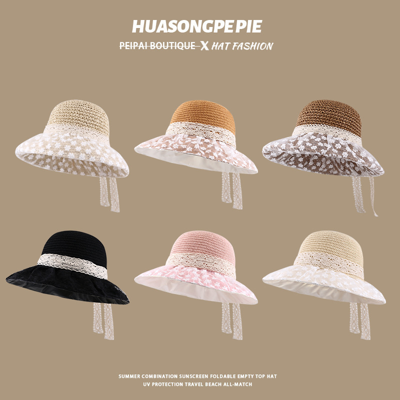 레이스 레이스 스트로우 모자 여름 여성 모자 선 스크린 학생 야외 차양 모자 스트랩 비치 레인보우 태양 모자