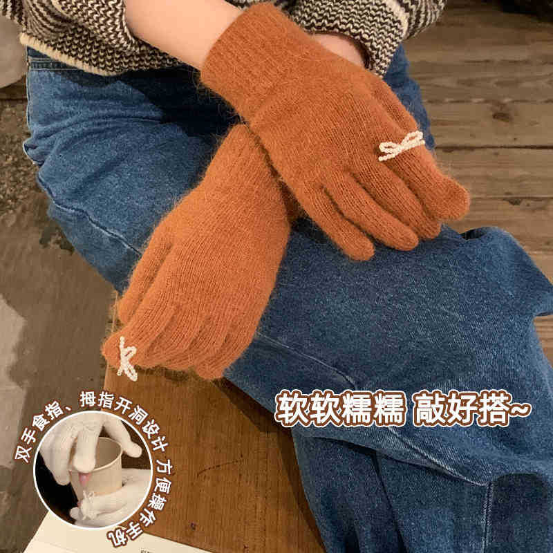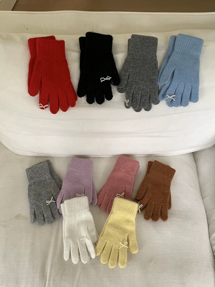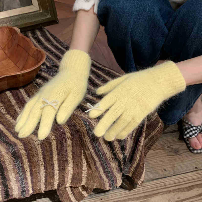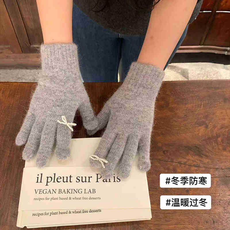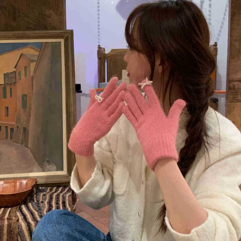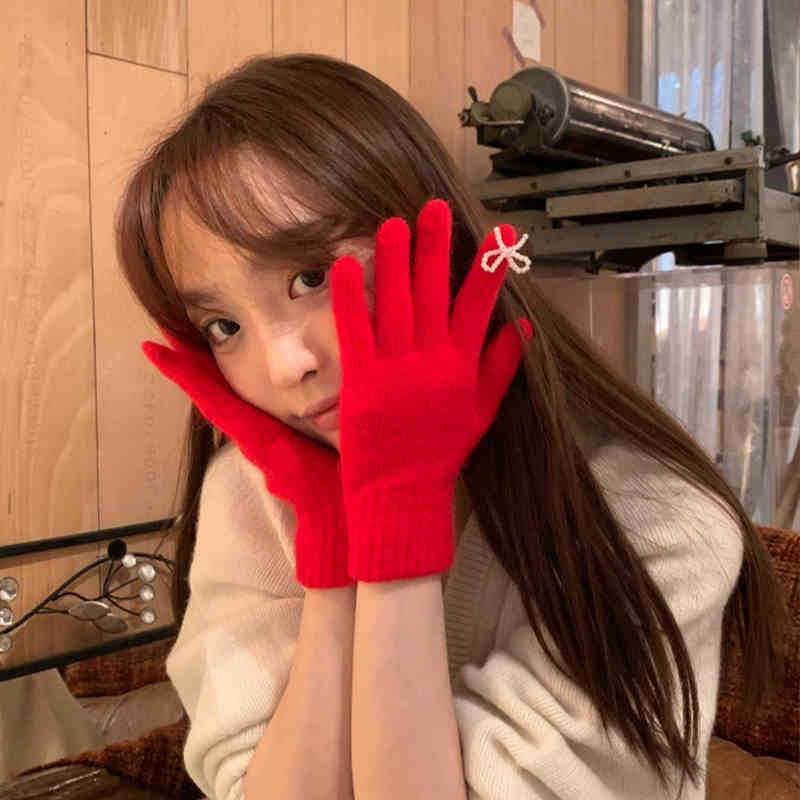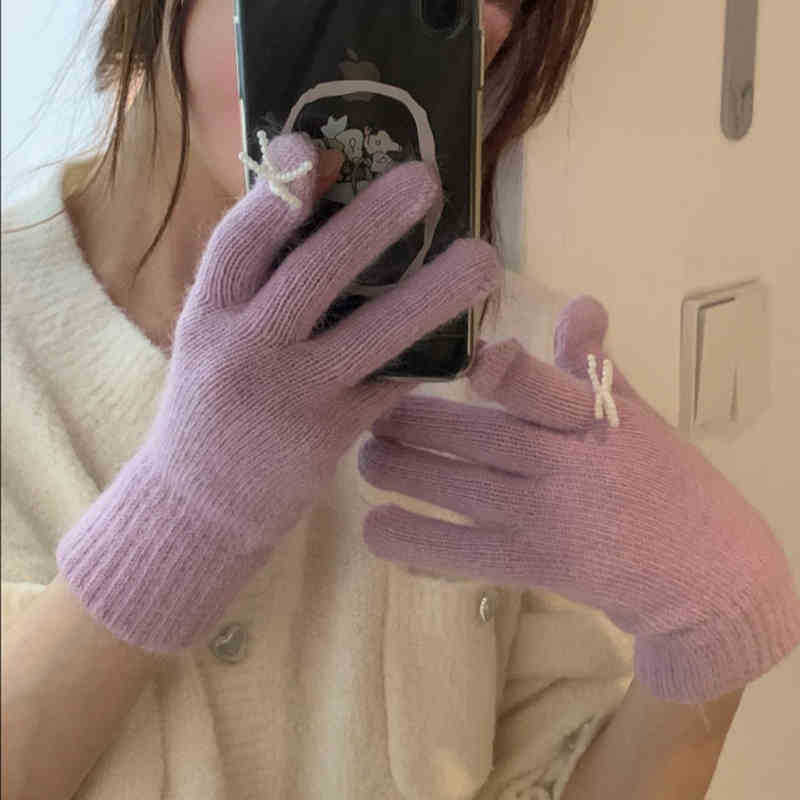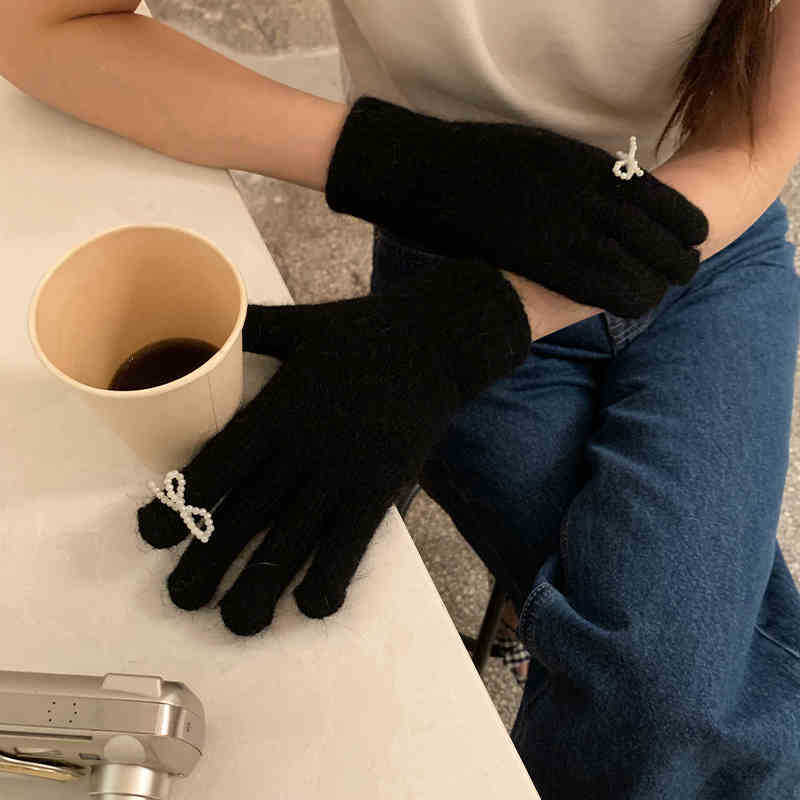 한국 스타일 겨울 진주 활 니트 장갑 승마 여성을위한 따뜻한 양모 5 손가락 장갑