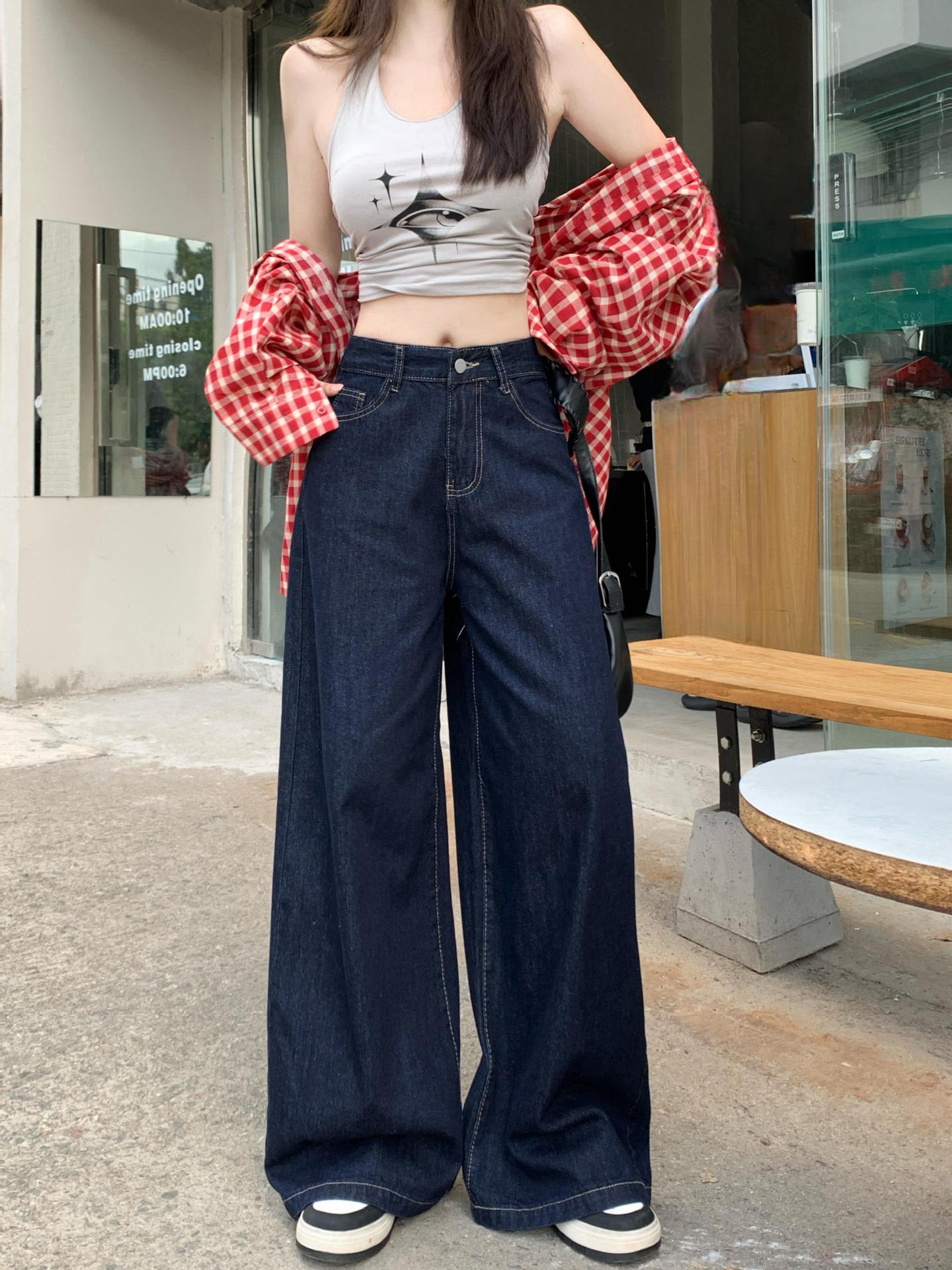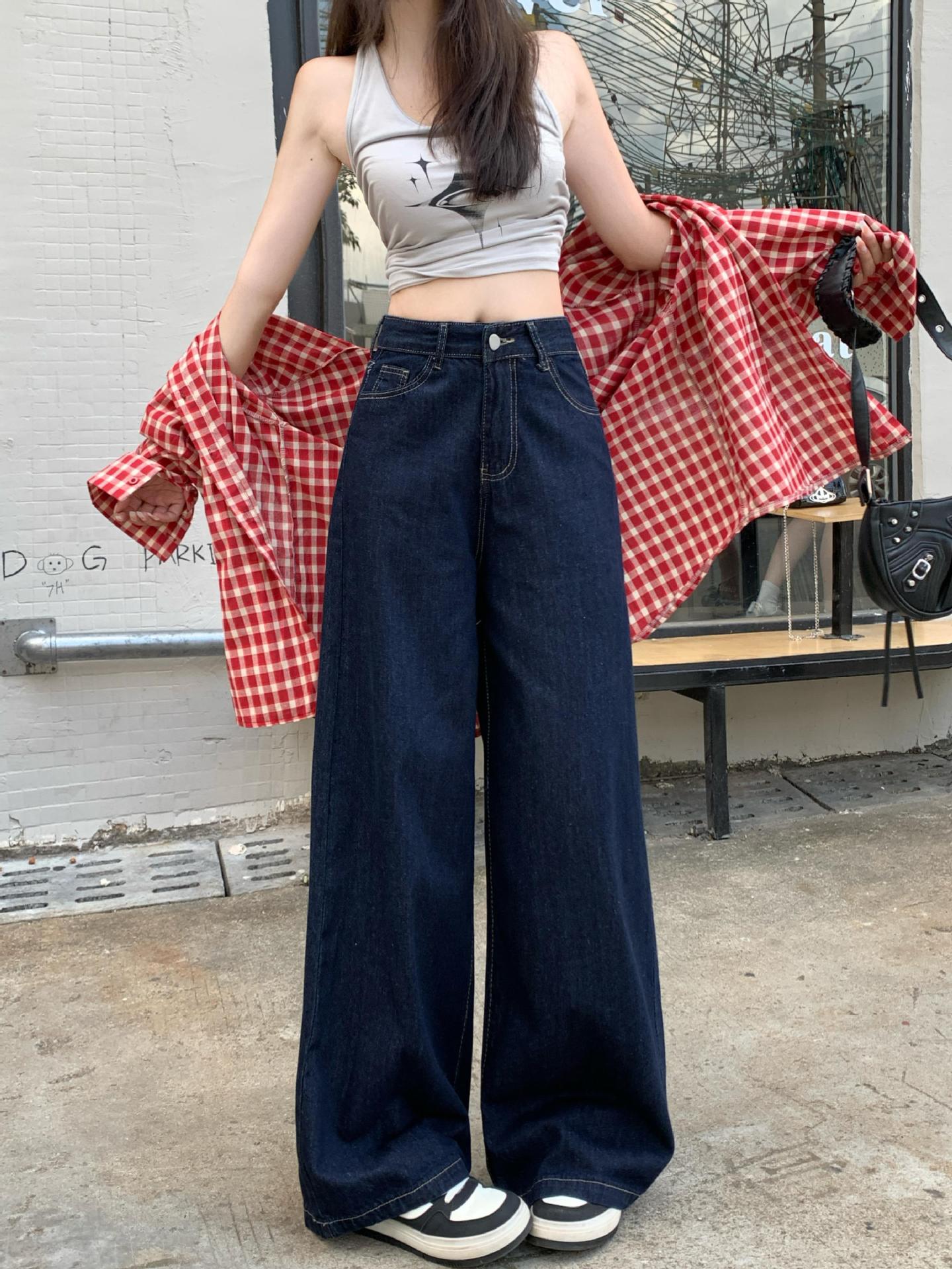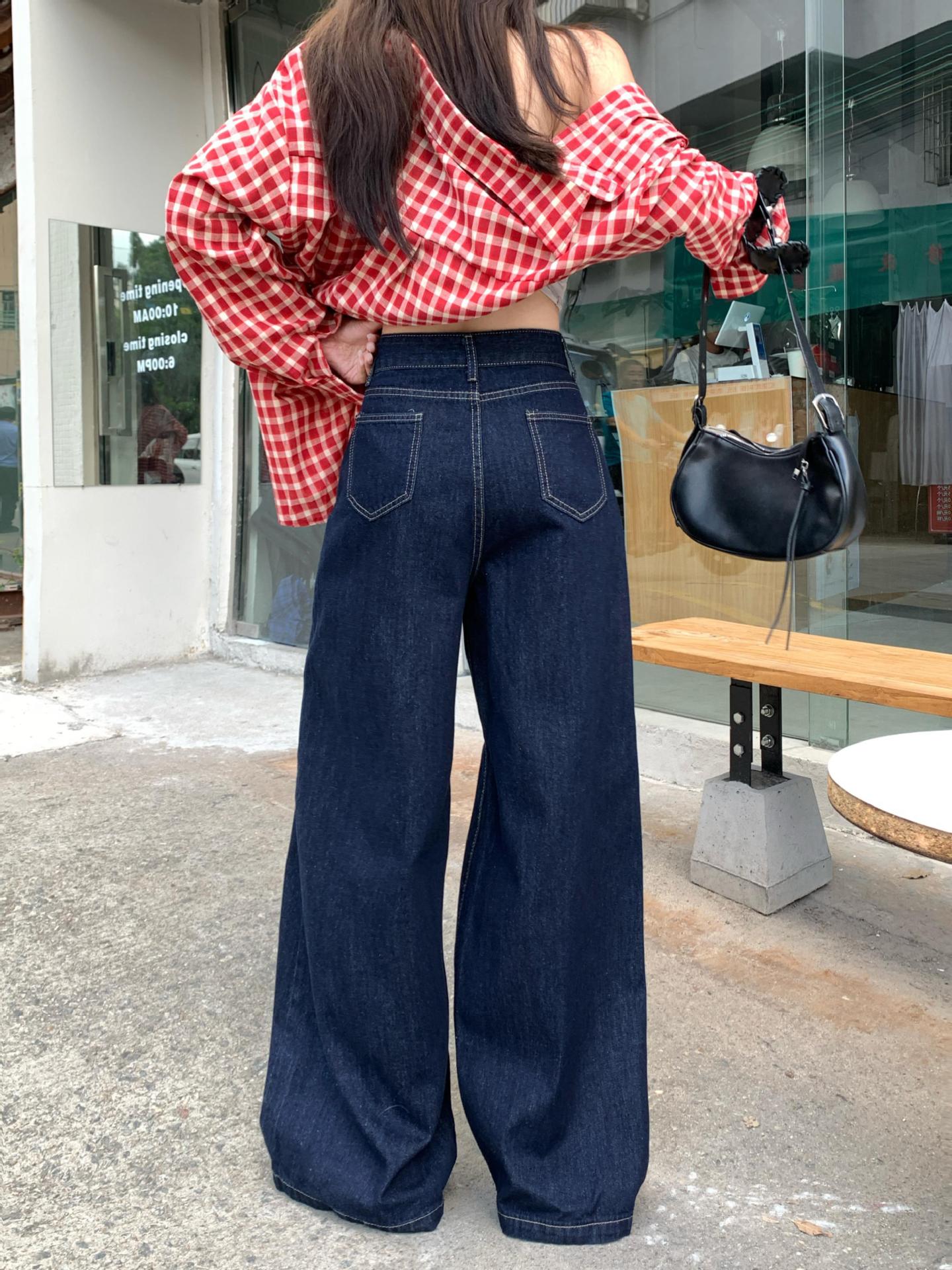 가을 여성용 리얼샷 배형 천채 레트로 다크블루 데님 와이드 팬츠 하이웨이스트 스트레이트 바닥 기장 팬츠스토어 가기