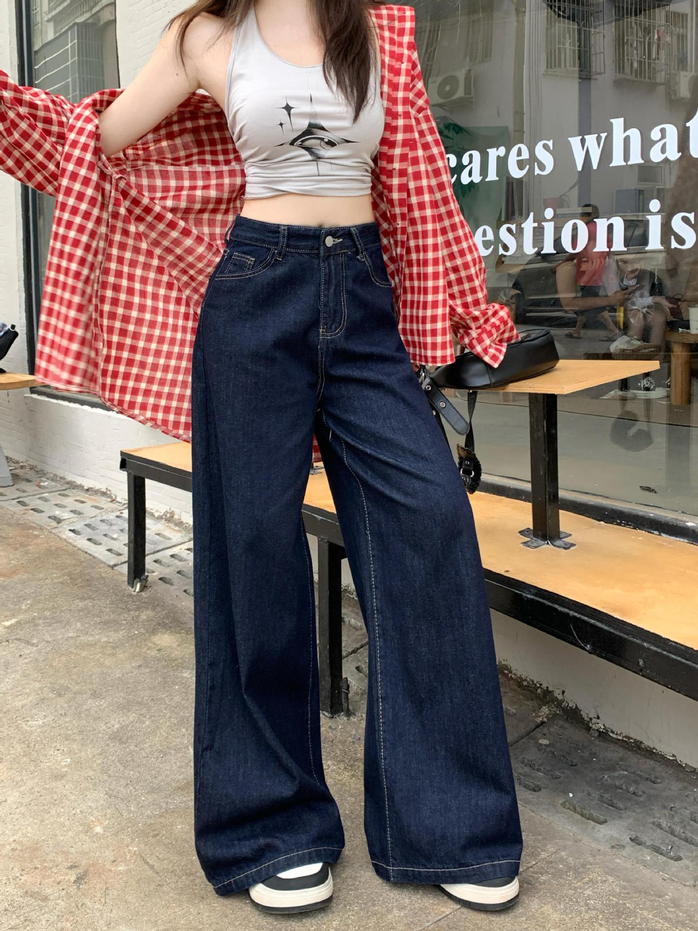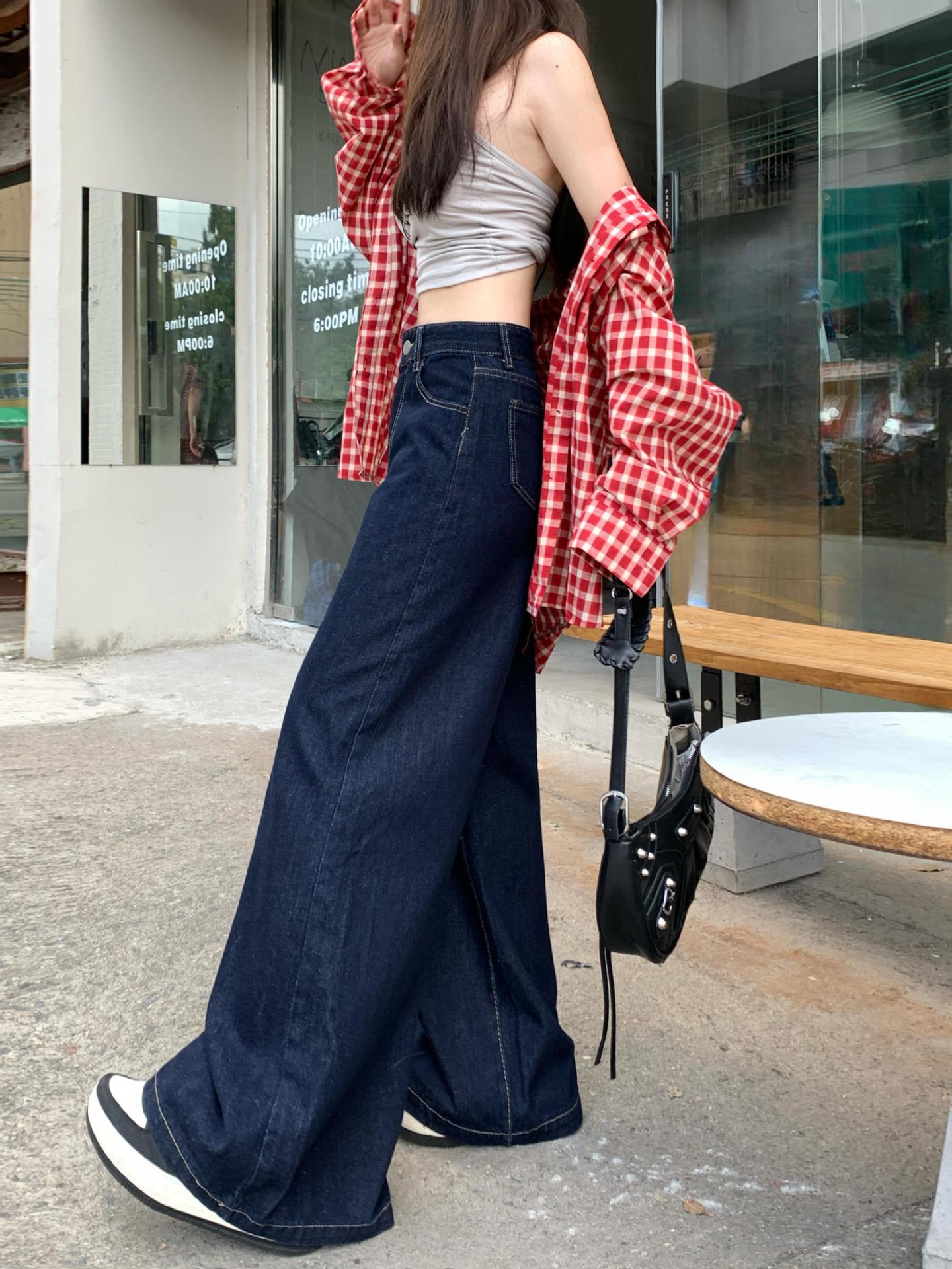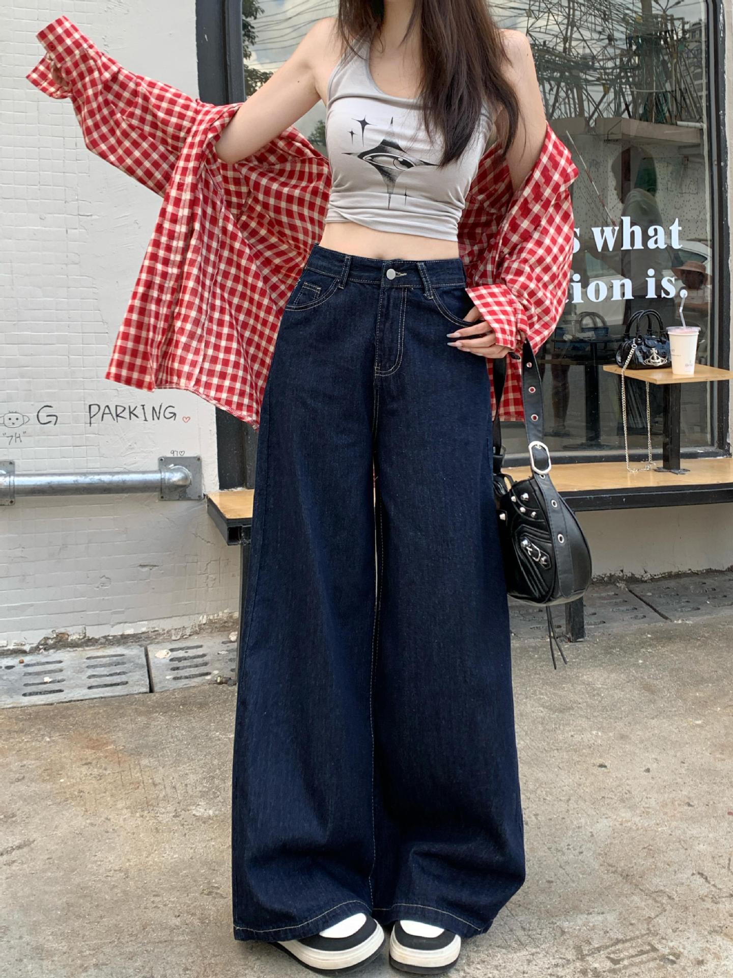 가을 여성용 리얼샷 배형 천채 레트로 다크블루 데님 와이드 팬츠 하이웨이스트 스트레이트 바닥 기장 팬츠스토어 가기