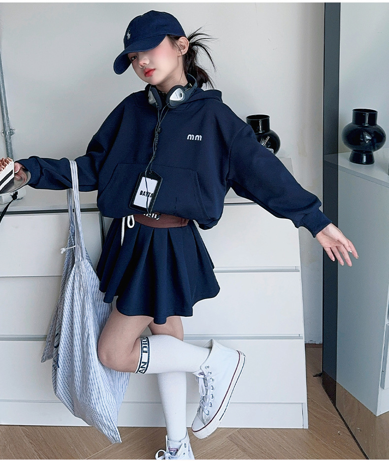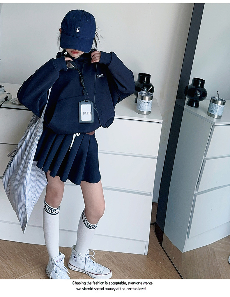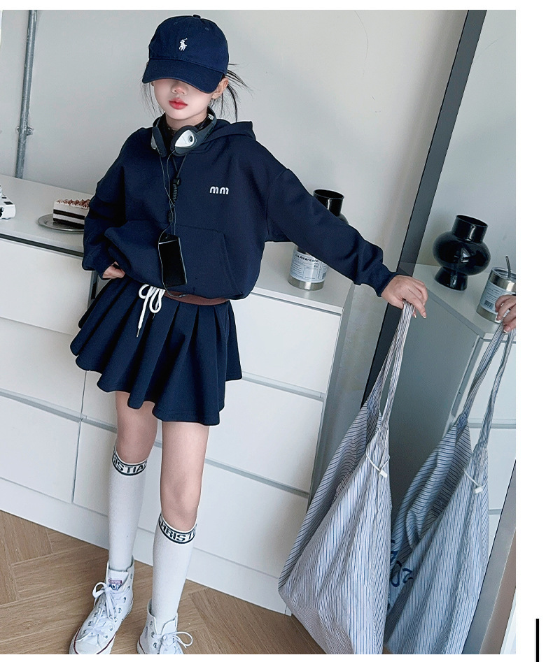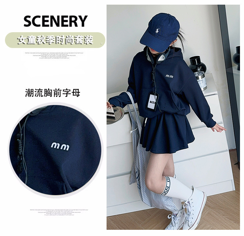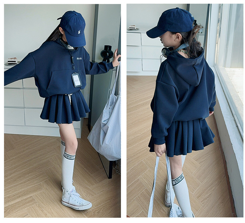 소녀의 봄과 가을 스웨트 셔츠 스커트 세트 2024 새로운 어린이 후드 탑 주름 치마 패션 가을 패션 대학 패션스토어 가기