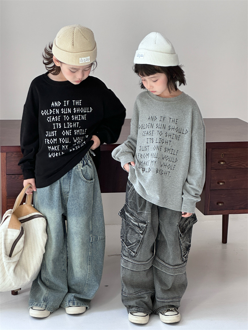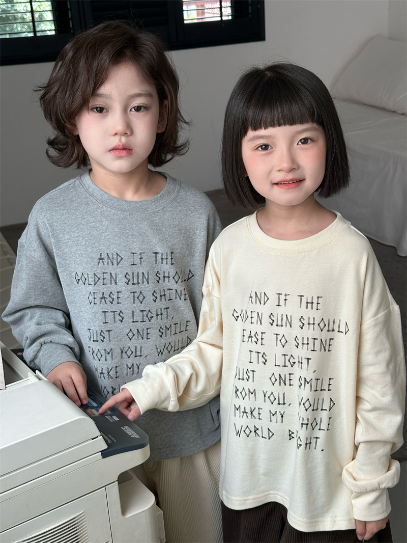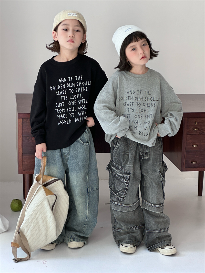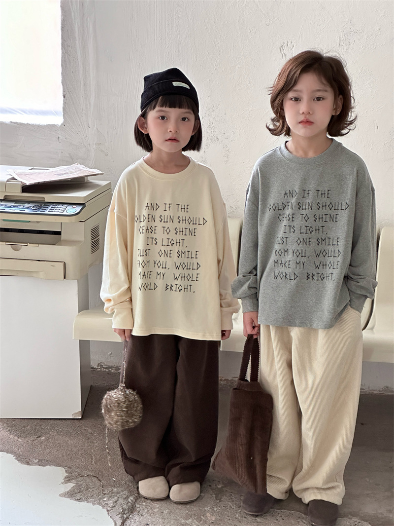 2025 새로운 가을 한국 스타일 소년과 소녀를위한 어린이 느슨한 편지 티셔츠 패션 다목적 캐주얼 라운드 넥 긴 소매 유행