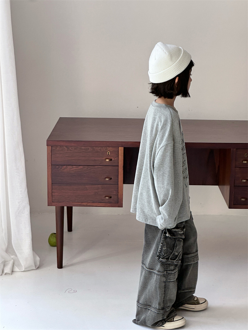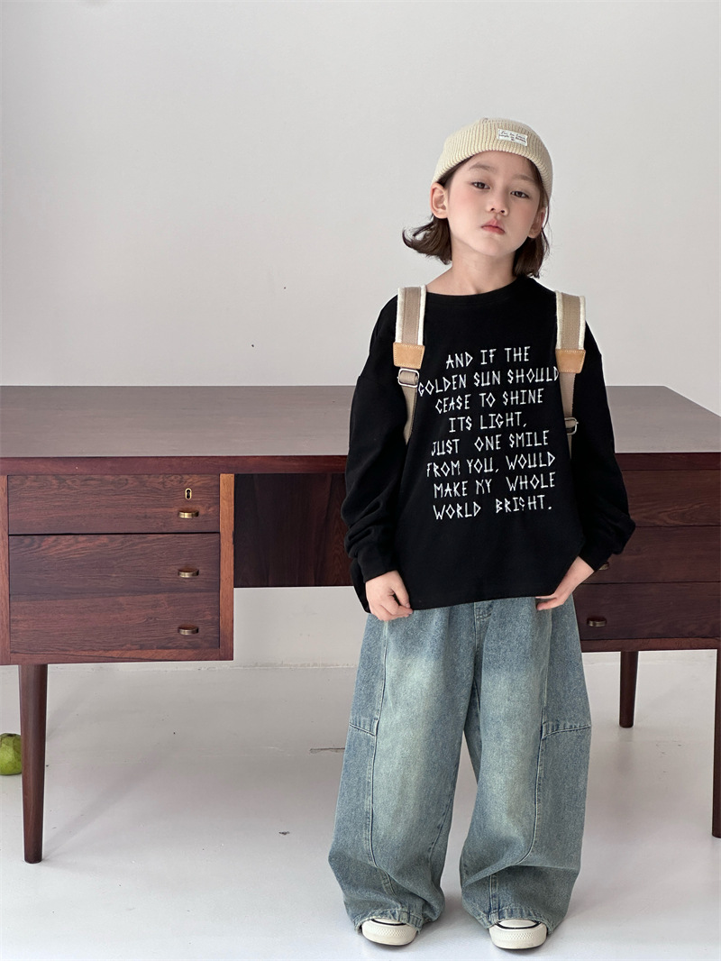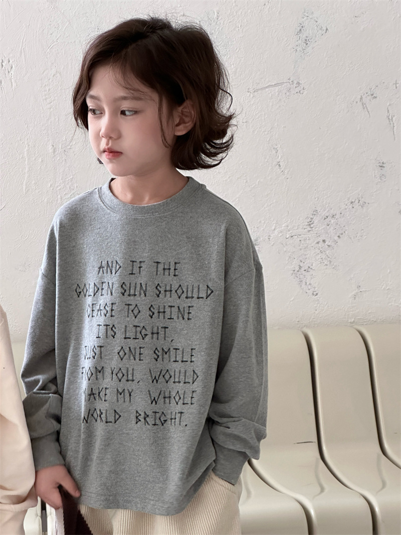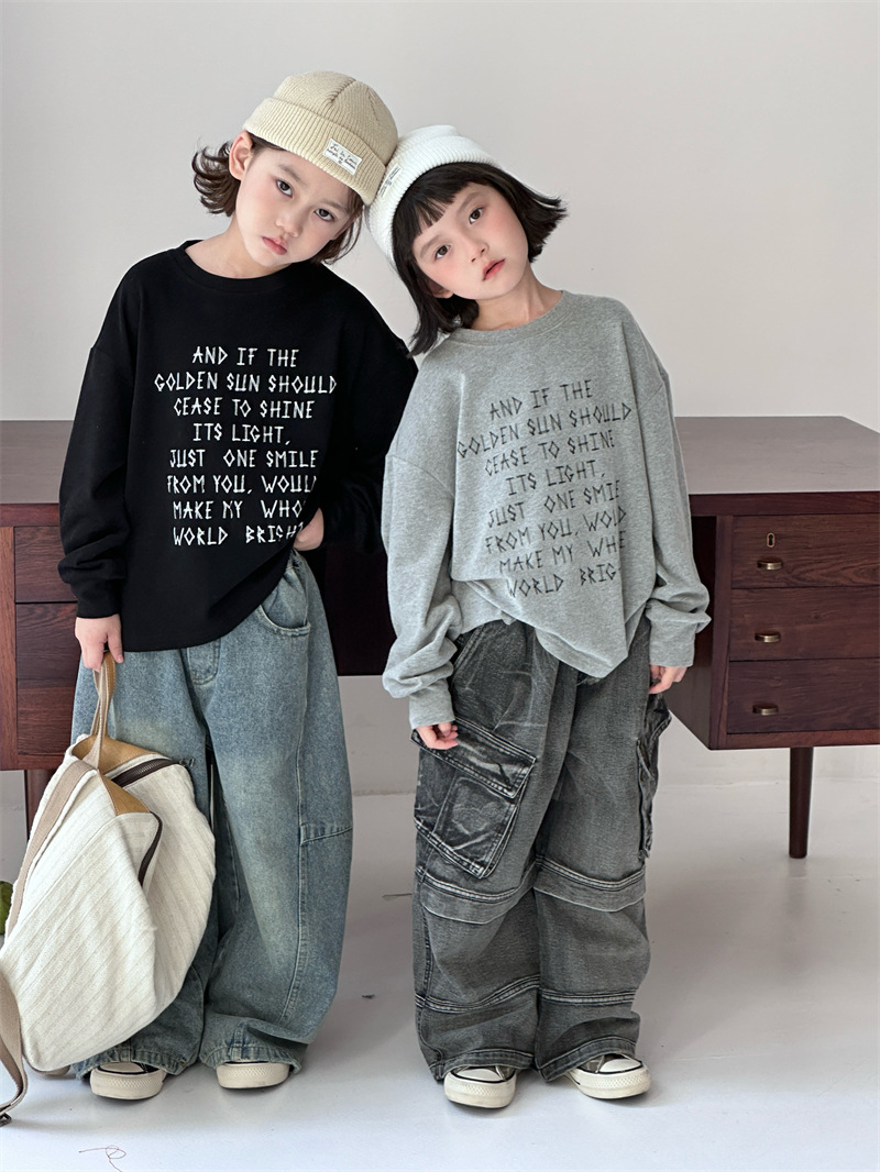 2025 새로운 가을 한국 스타일 소년과 소녀를위한 어린이 느슨한 편지 티셔츠 패션 다목적 캐주얼 라운드 넥 긴 소매 유행스토어 가기