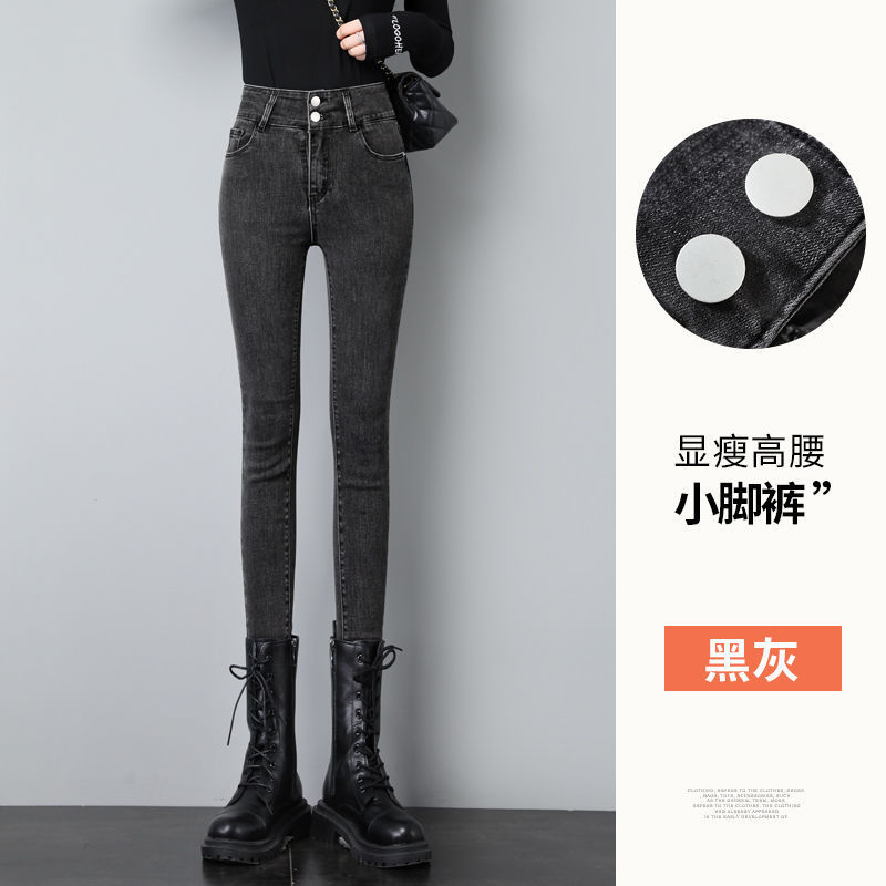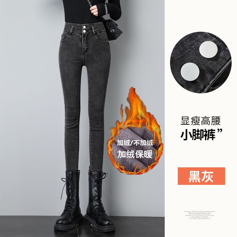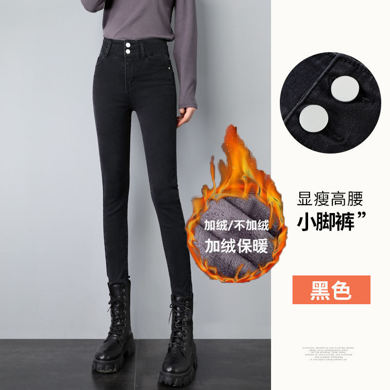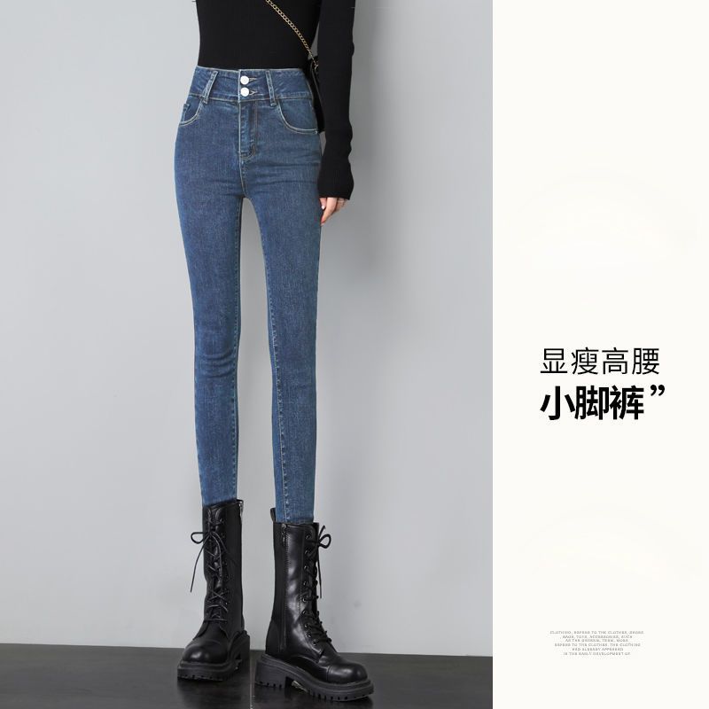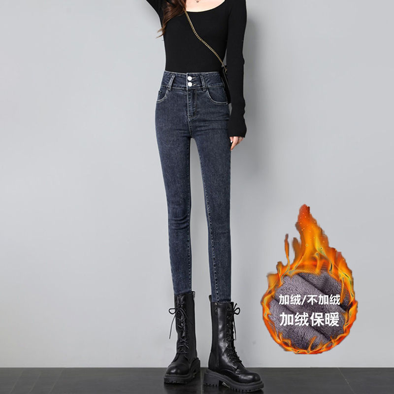 높은 허리 탄성 청바지 여성의 가을과 겨울 2024 새로운 플러스 사이즈 슬림 연필 단단한 발 바지 겨울 기모스토어 가기