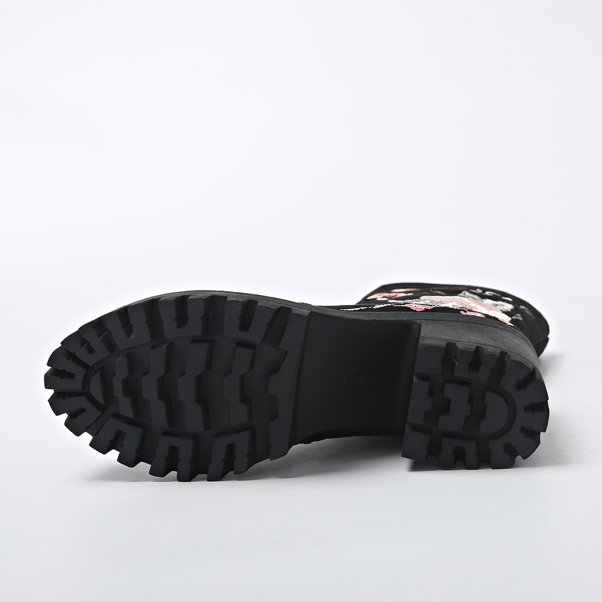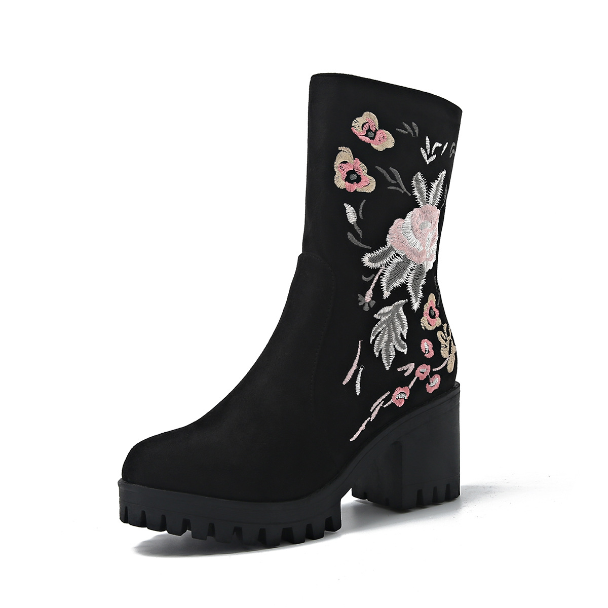 뾰족코 굵은 굽 유럽풍 미드카프 부츠 여성용 2025 가을 자수 꽃무늬 하이힐 패션 부츠 키높이 슬림 효과스토어 가기