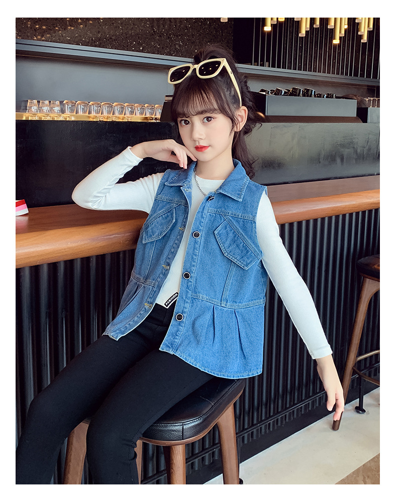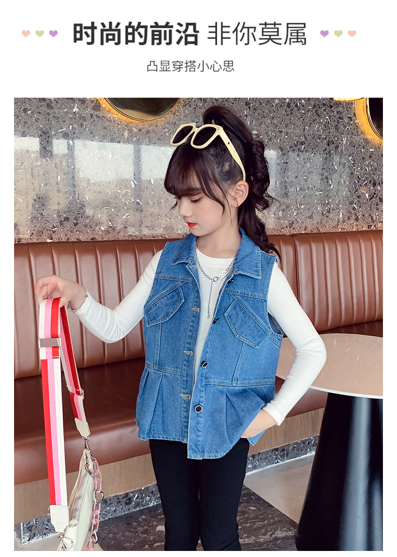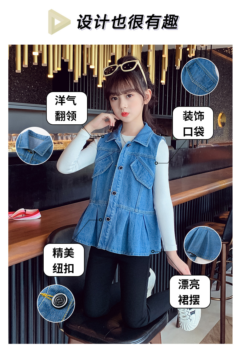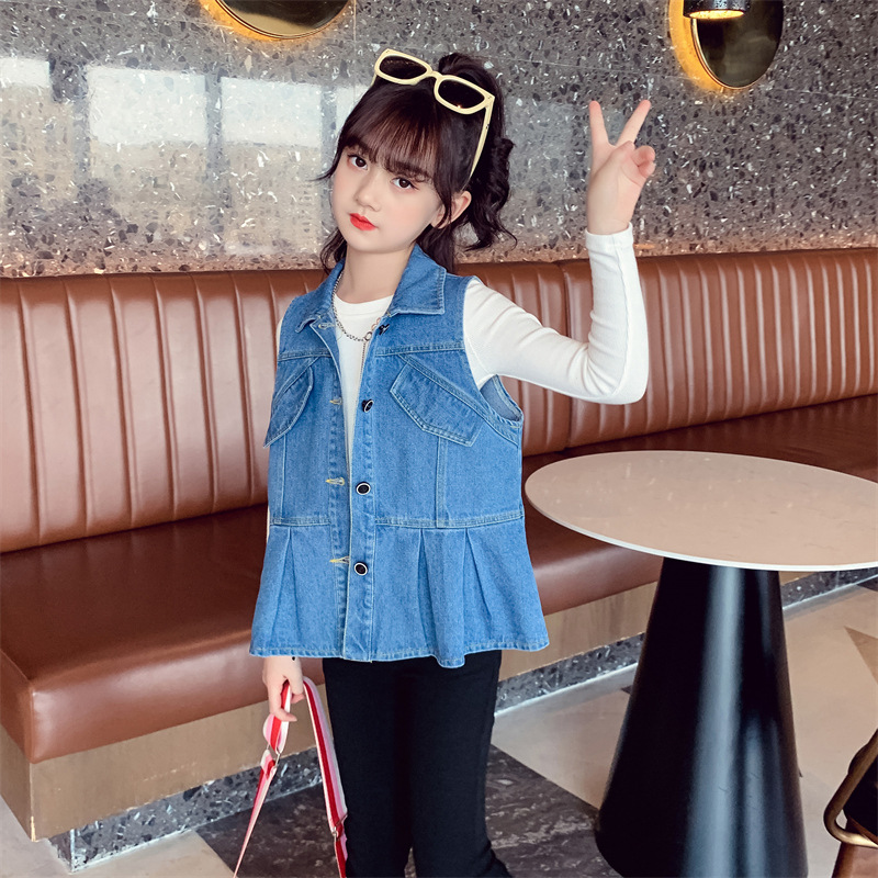 소녀 데님 조끼 2024 년 봄과 가을 세련된 스커트 소매 숄더 탑 미중 및 대형 어린이를위한 새로운 스타일 조끼 재킷스토어 가기