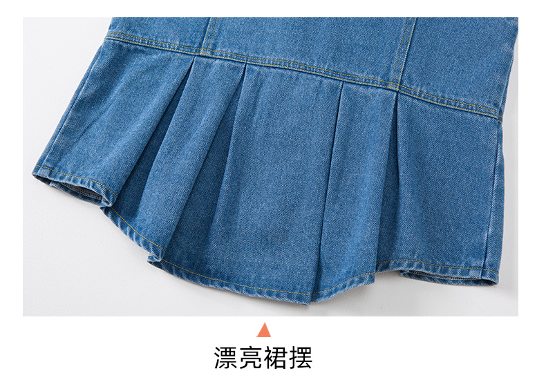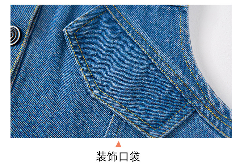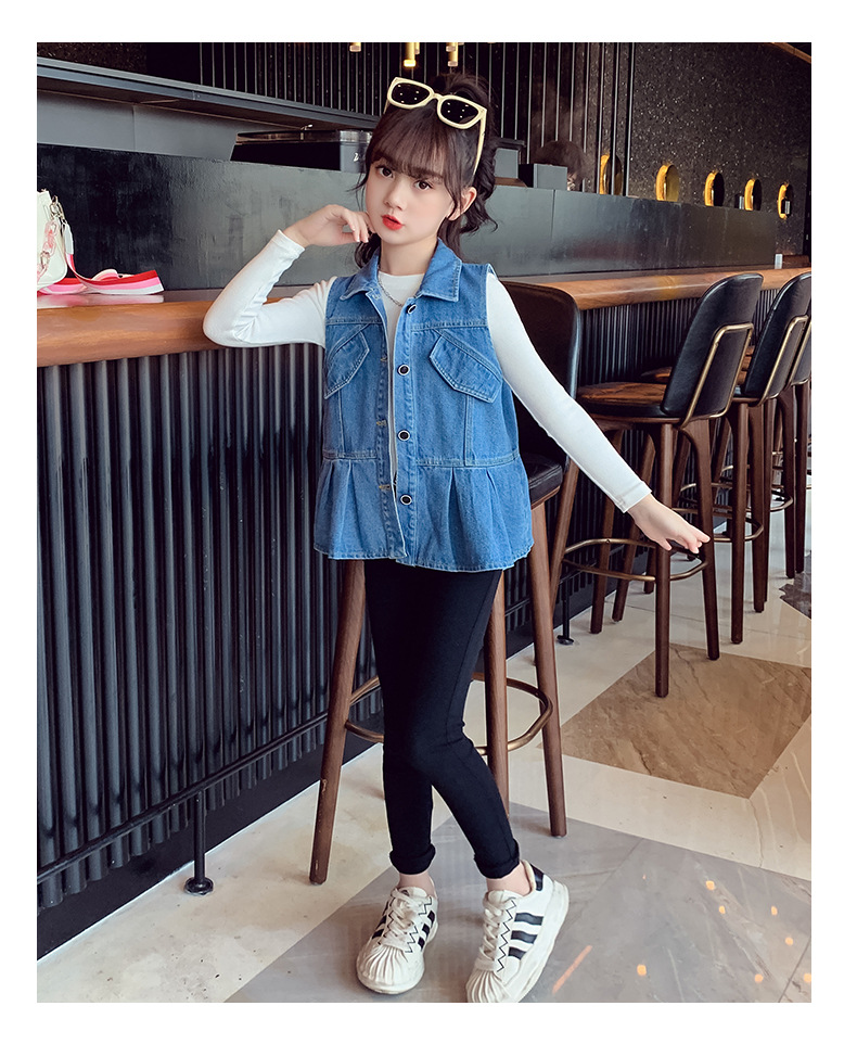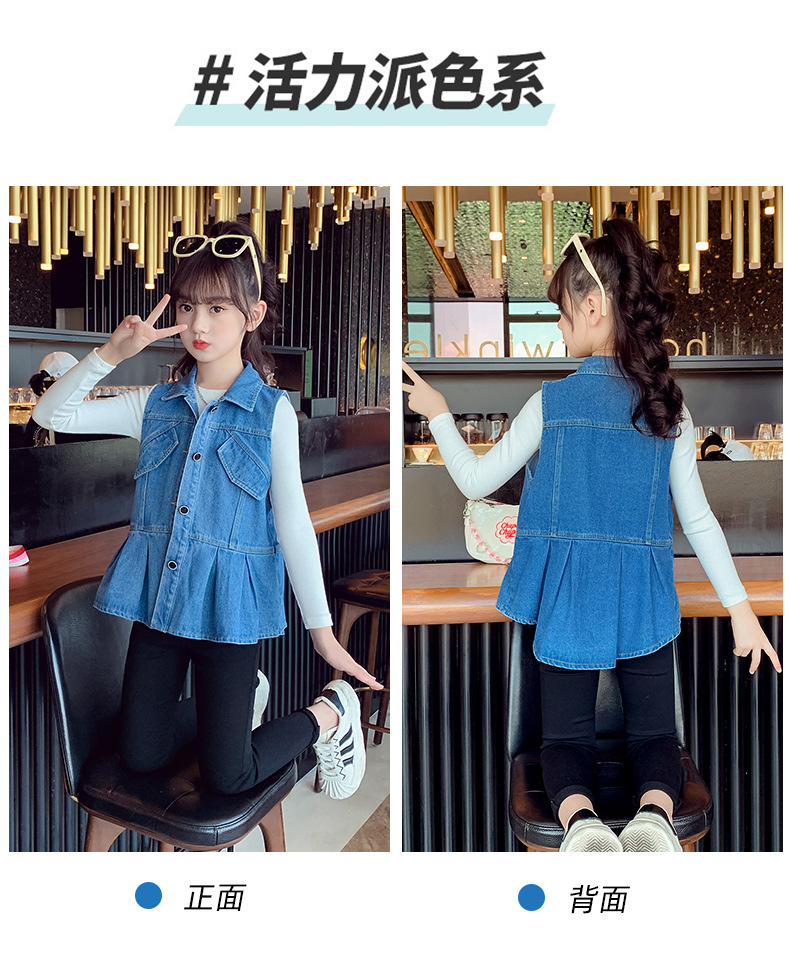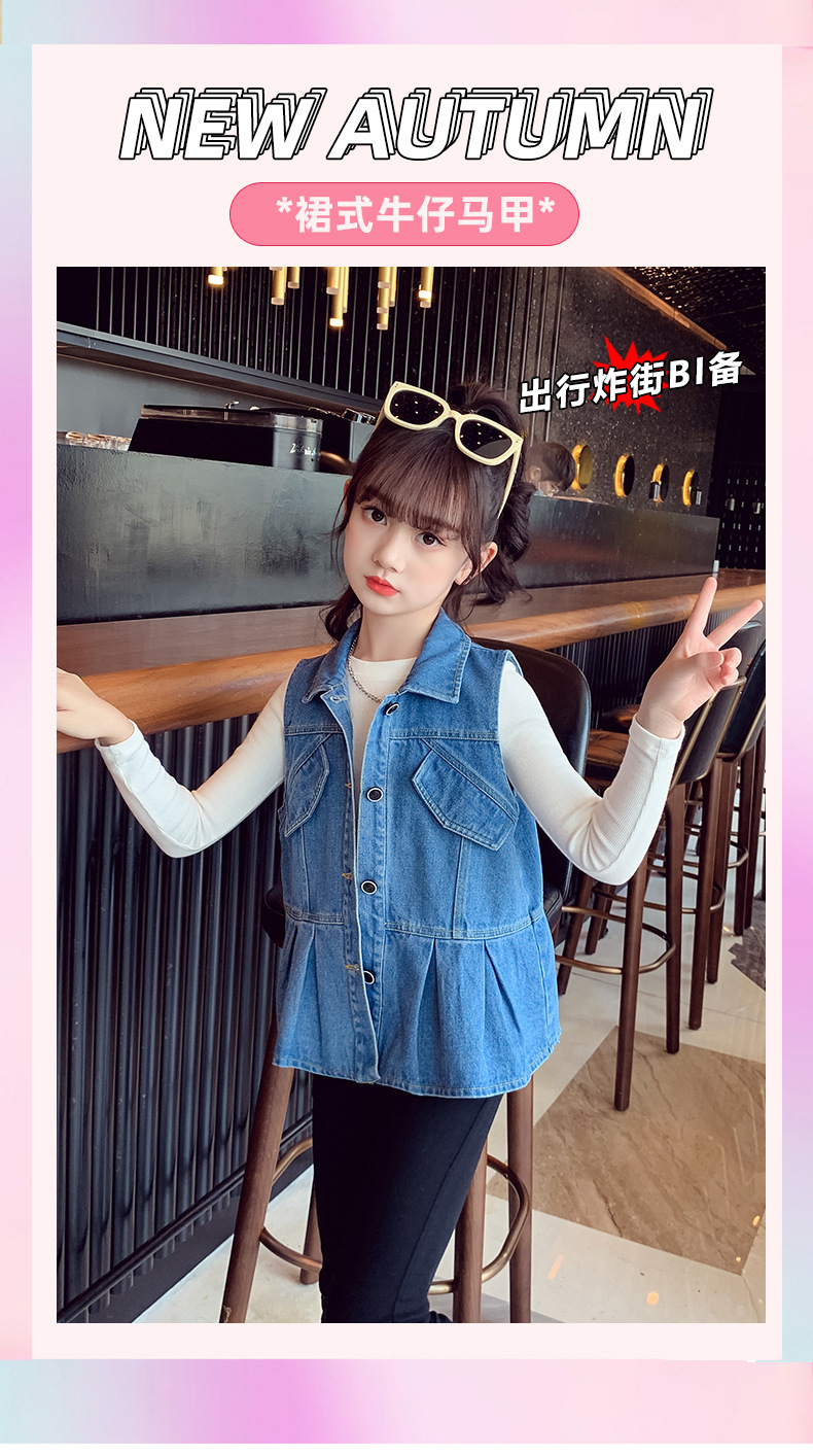 소녀 데님 조끼 2024 년 봄과 가을 세련된 스커트 소매 숄더 탑 미중 및 대형 어린이를위한 새로운 스타일 조끼 재킷스토어 가기