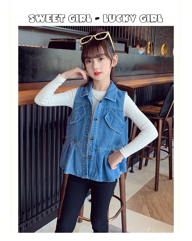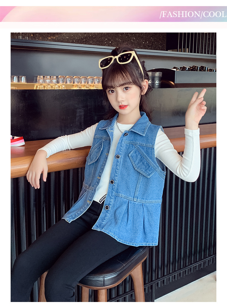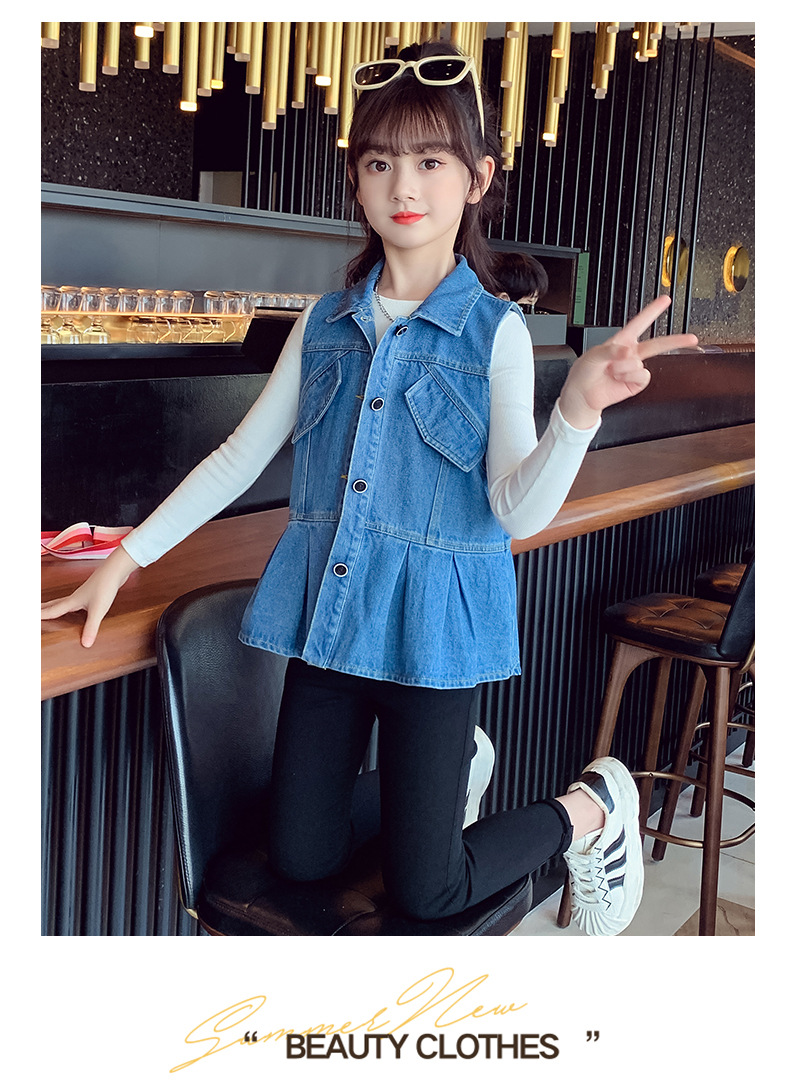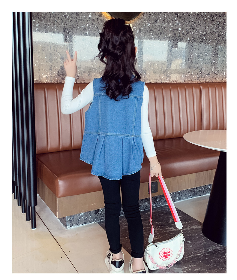 소녀 데님 조끼 2024 년 봄과 가을 세련된 스커트 소매 숄더 탑 미중 및 대형 어린이를위한 새로운 스타일 조끼 재킷