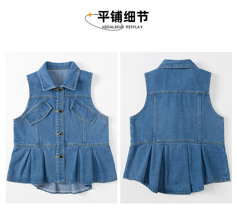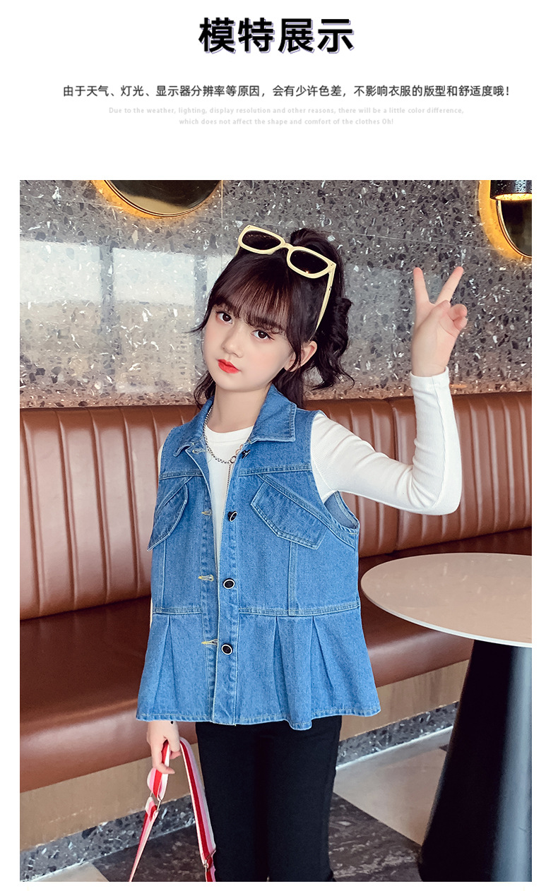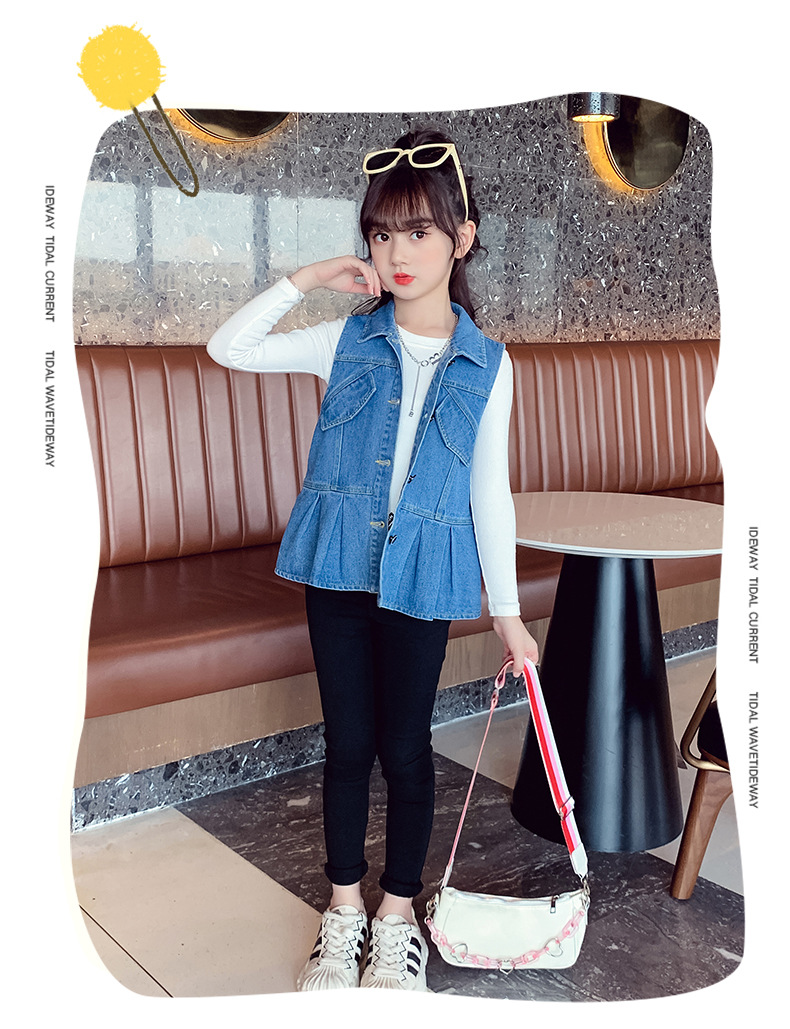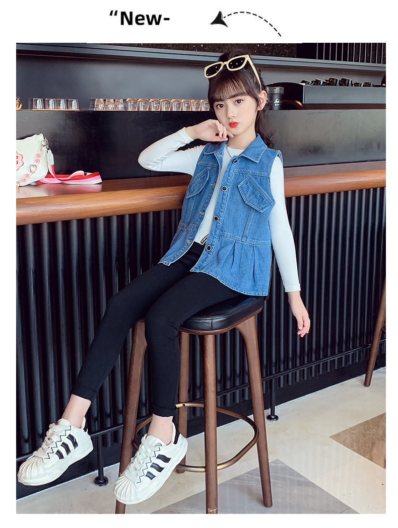 소녀 데님 조끼 2024 년 봄과 가을 세련된 스커트 소매 숄더 탑 미중 및 대형 어린이를위한 새로운 스타일 조끼 재킷