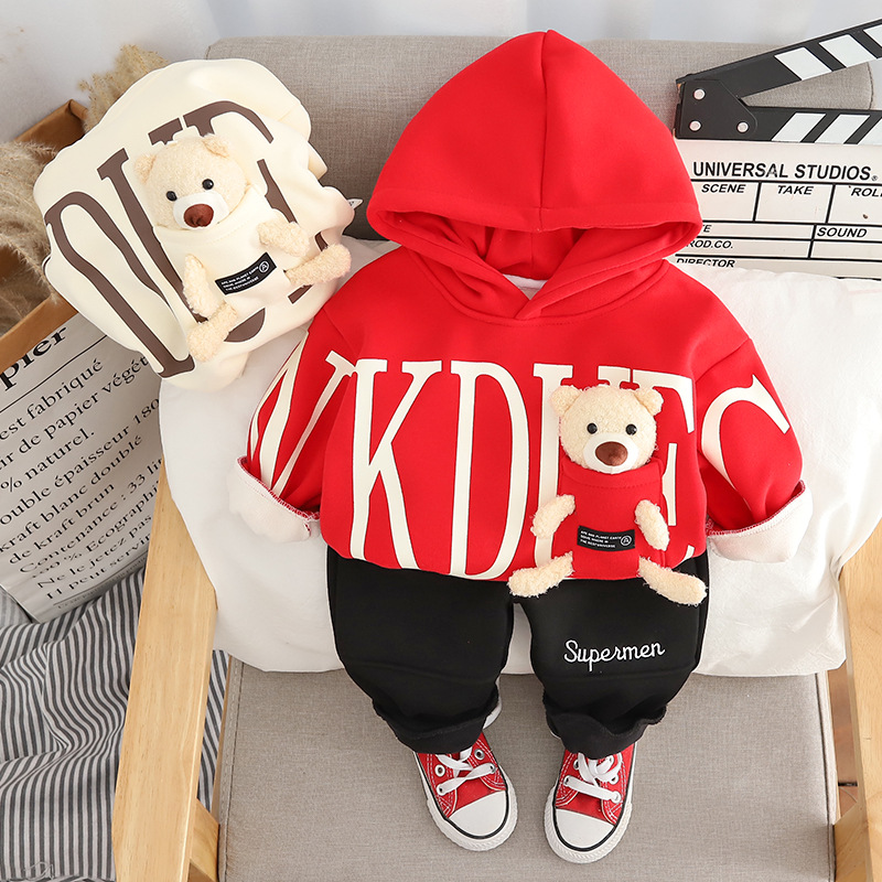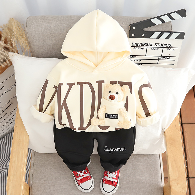 아동복 소년 세트 가을 겨울 기모 2024 새로운 더피 잘생긴 소년 기모 두꺼운 후드 땀 투피스 세트스토어 가기