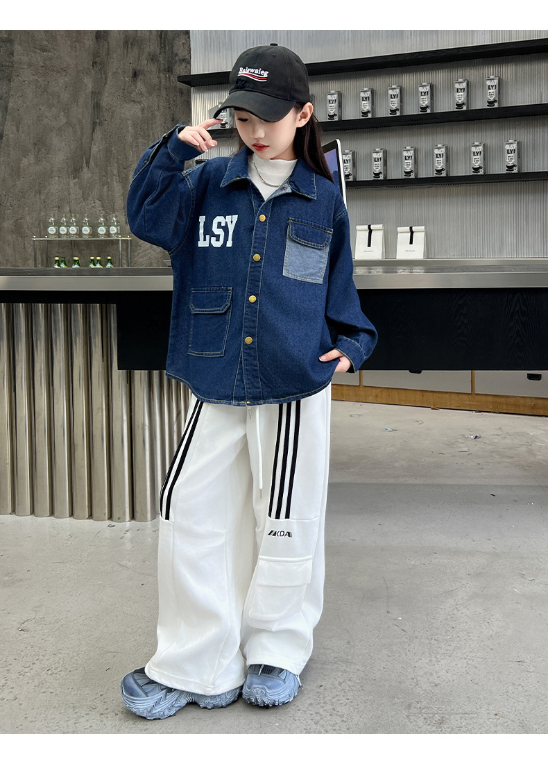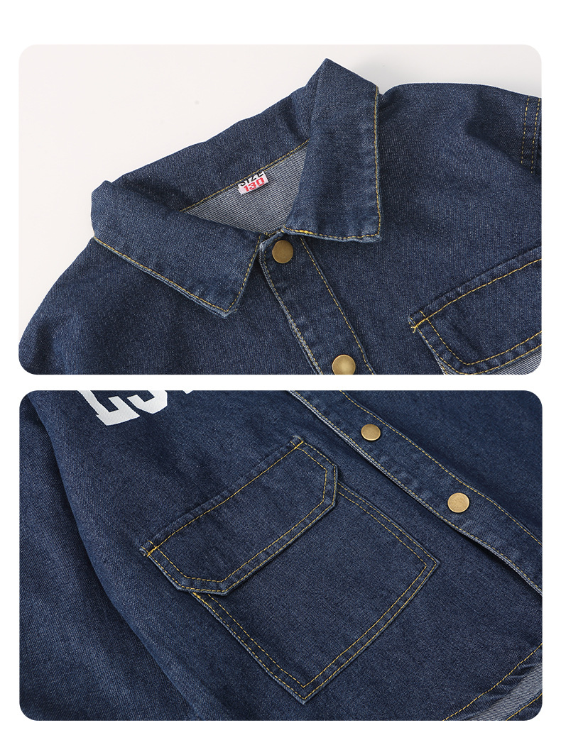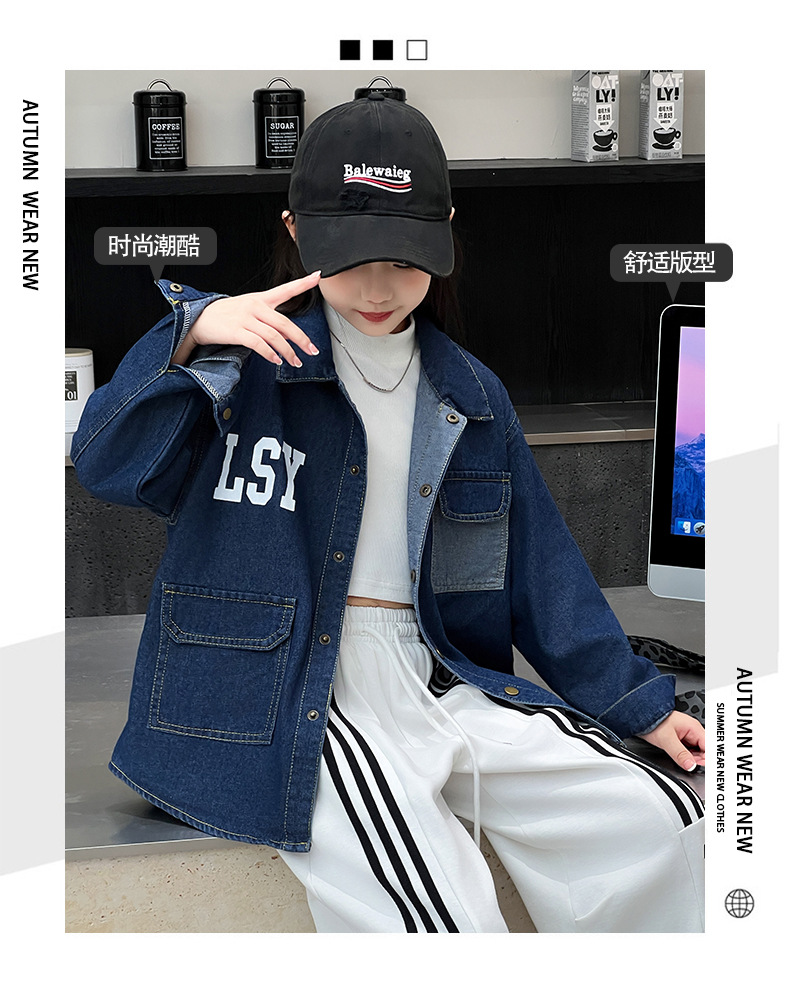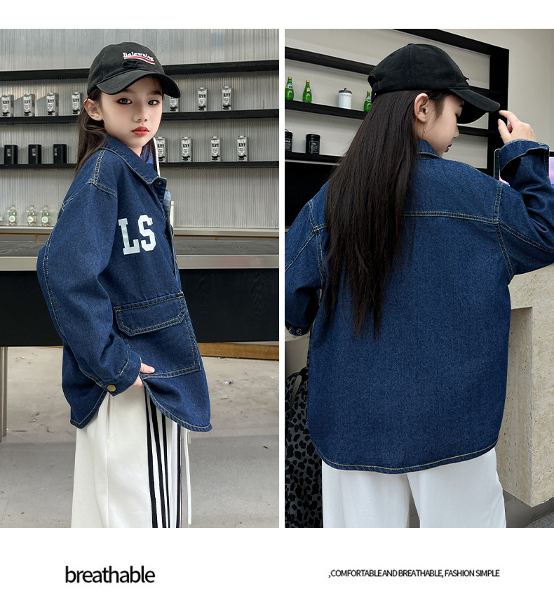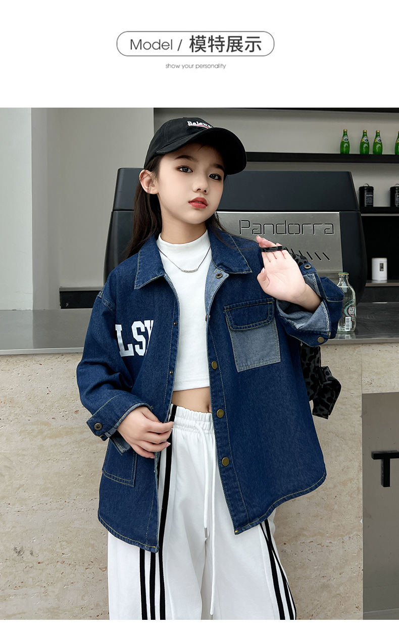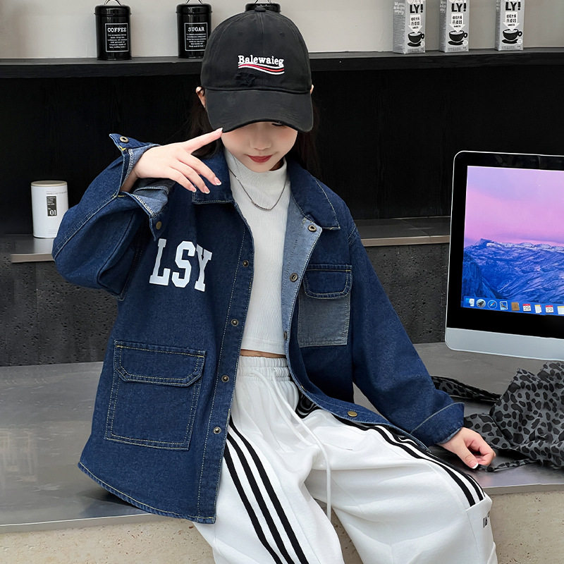 여자 편지 데님 셔츠 봄, 가을 2025 새로운 한국 스타일 서양식 패션 중대형 어린이 긴팔 재킷 탑스토어 가기