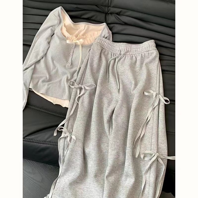 봄 부드러운 착용 여성의 2024 새로운 한국 스타일 디자인 달콤하고 뜨거운 탑 높은 허리 와이드 레그 바지 투피스 유행 세트