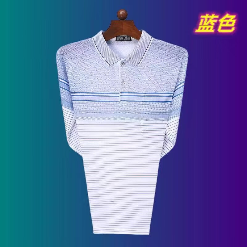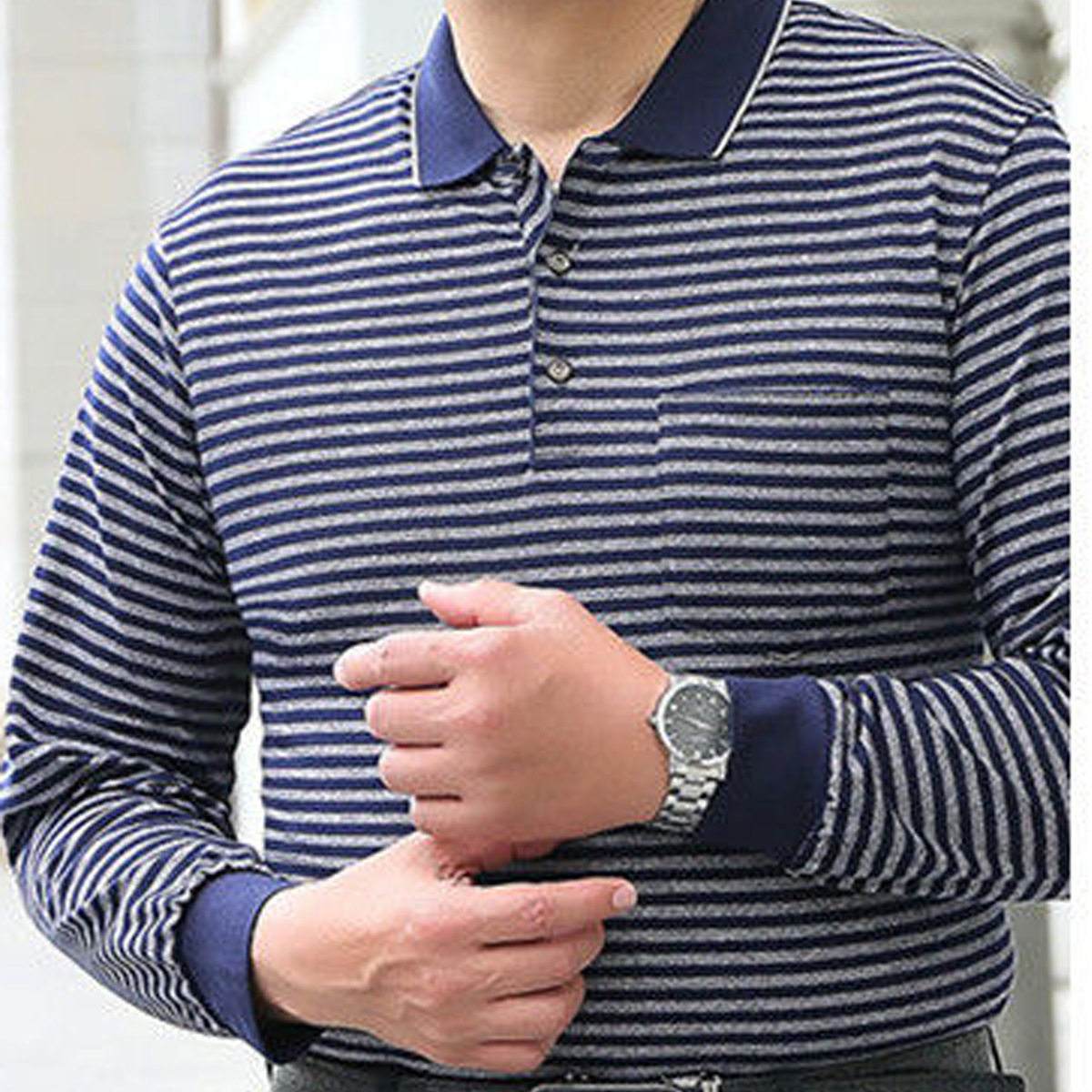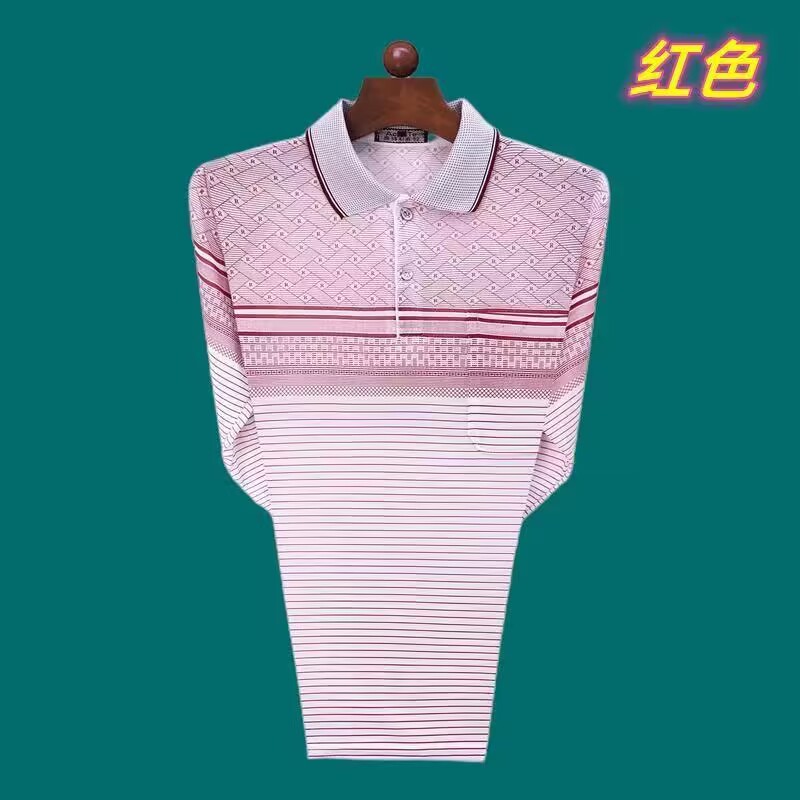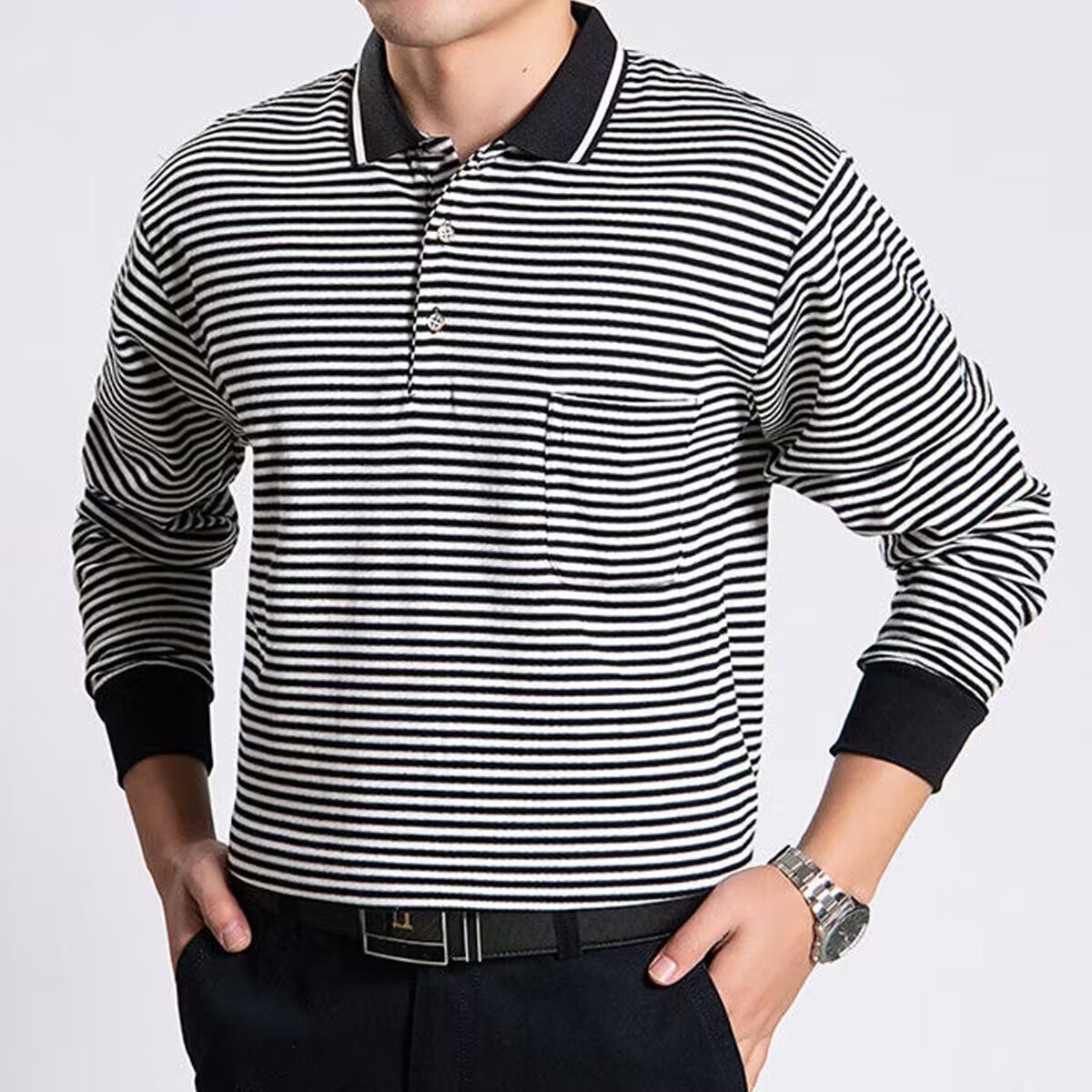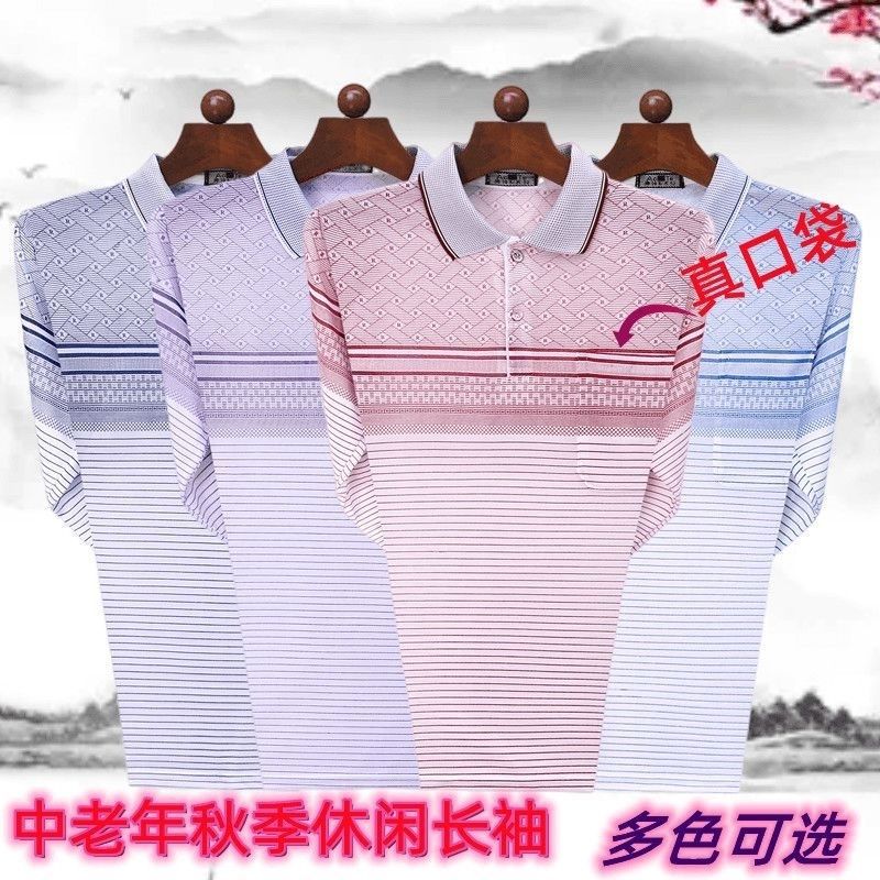 2024 남자 중년 티셔츠 봄과 가을 옷깃 최고 남자 캐주얼 느슨한 긴팔 줄무늬 아빠 탑스토어 가기