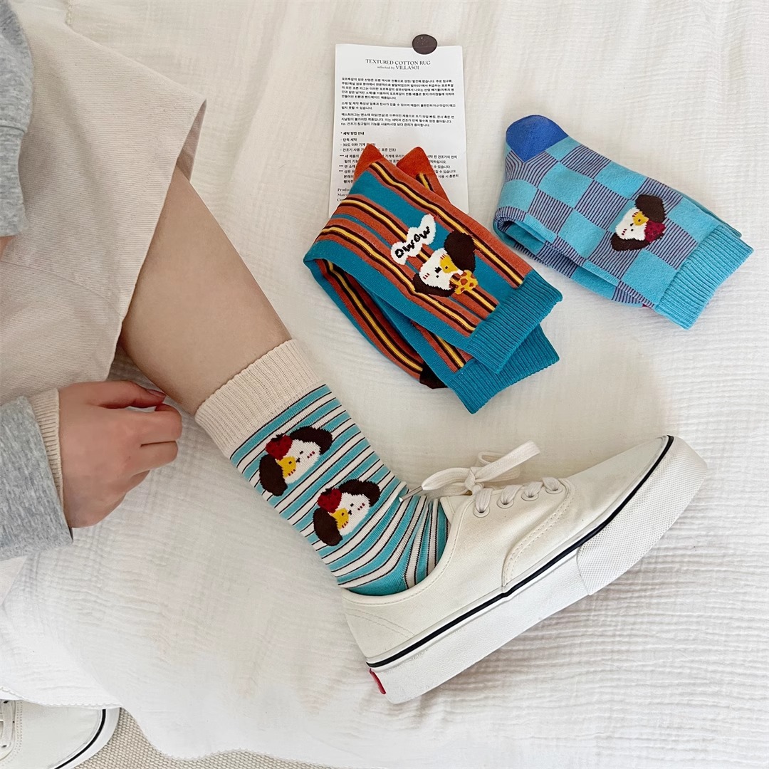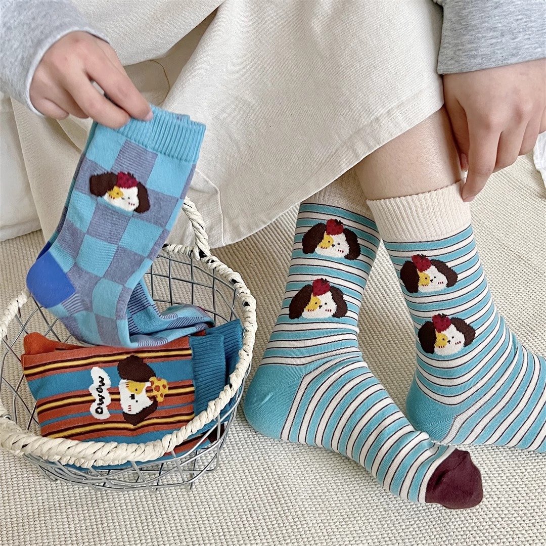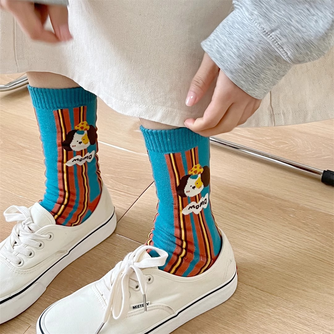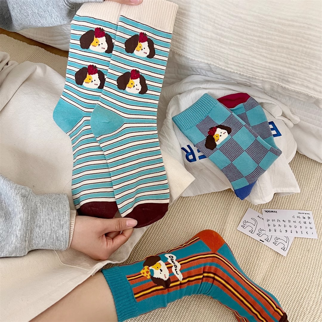 양말 여성의 봄과 가을 Ins 트렌디 한 일본 스타일 귀여운 만화 강아지 스트라이프 대학 스타일 스타킹