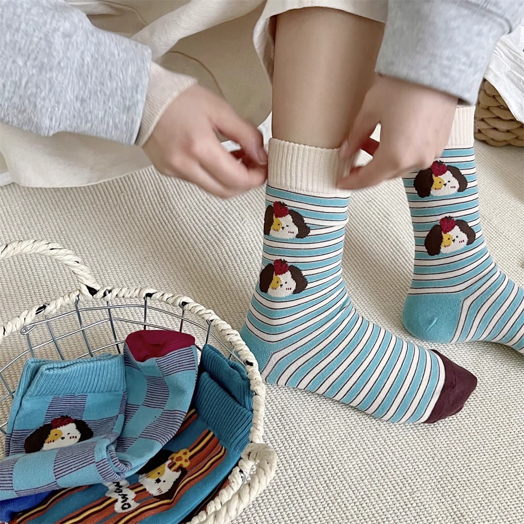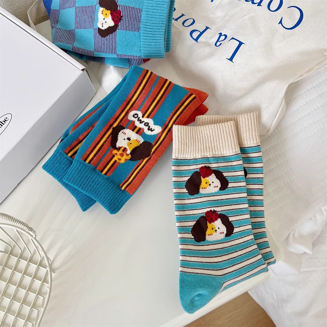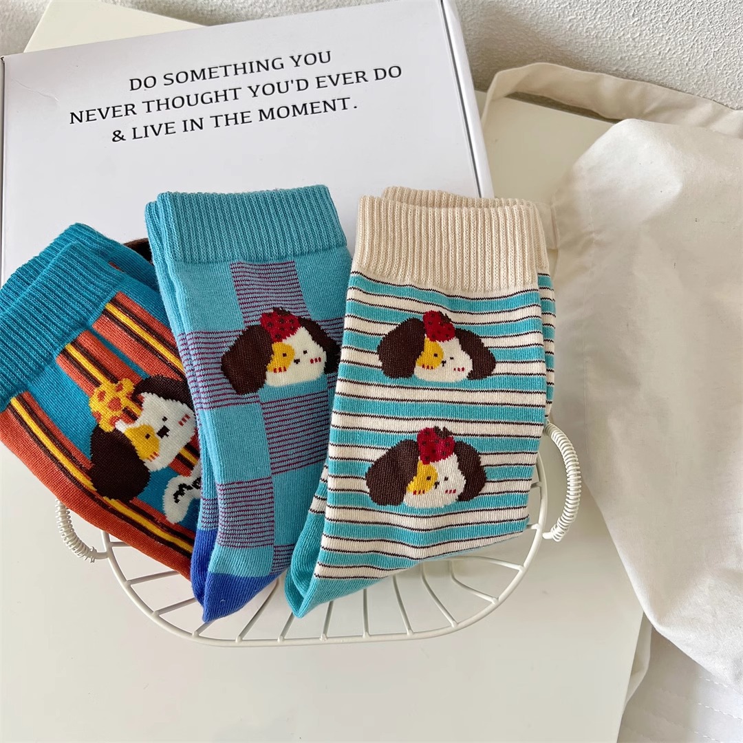 양말 여성의 봄과 가을 Ins 트렌디 한 일본 스타일 귀여운 만화 강아지 스트라이프 대학 스타일 스타킹