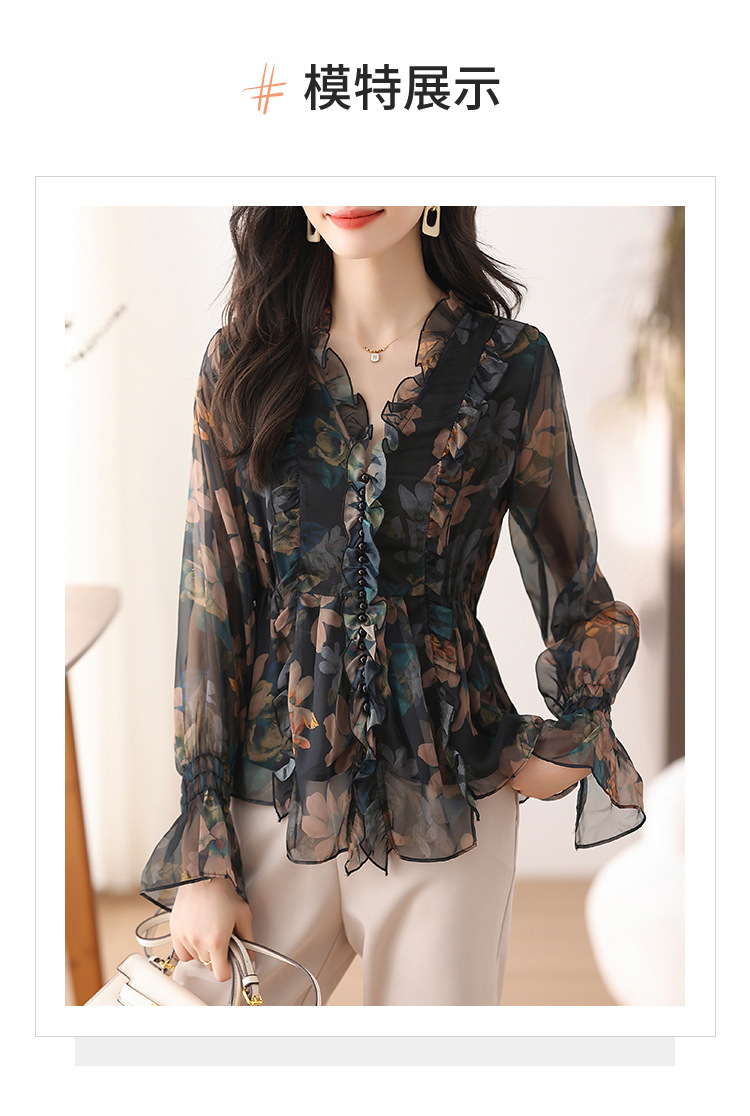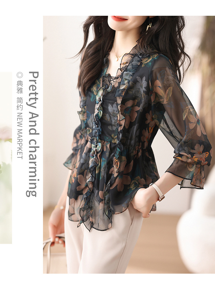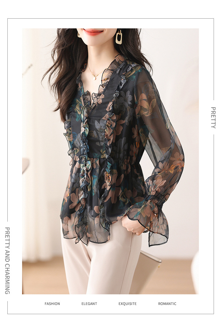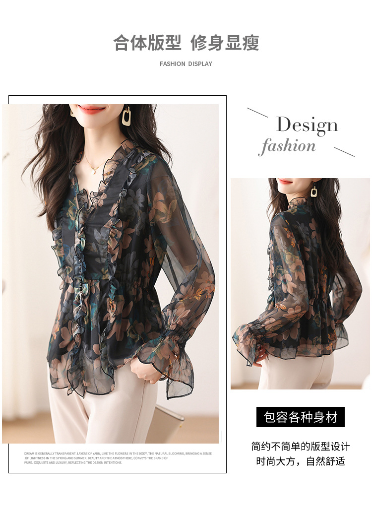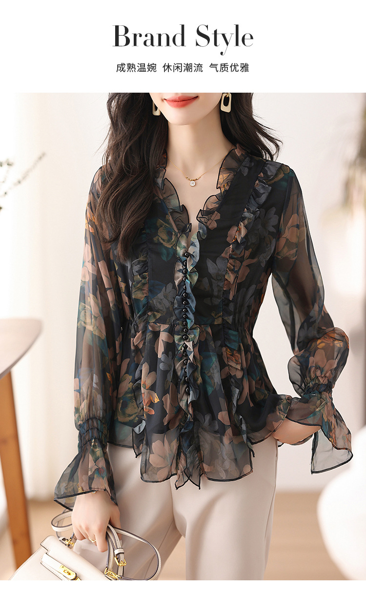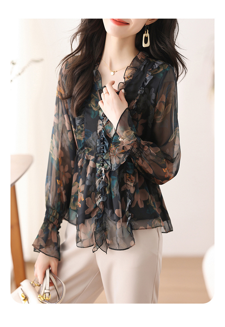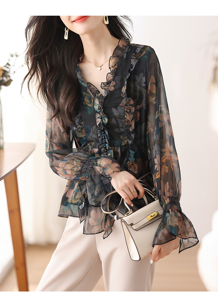 가을과 겨울 배 뒤덮인 슬리밍 꽃 셔츠 허리-단단한 외국 스타일 V-넥 트럼펫 슬리브 러플 쉬폰 탑스토어 가기