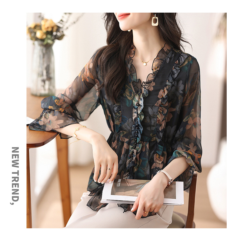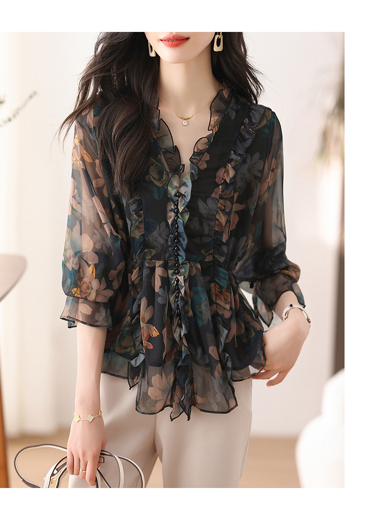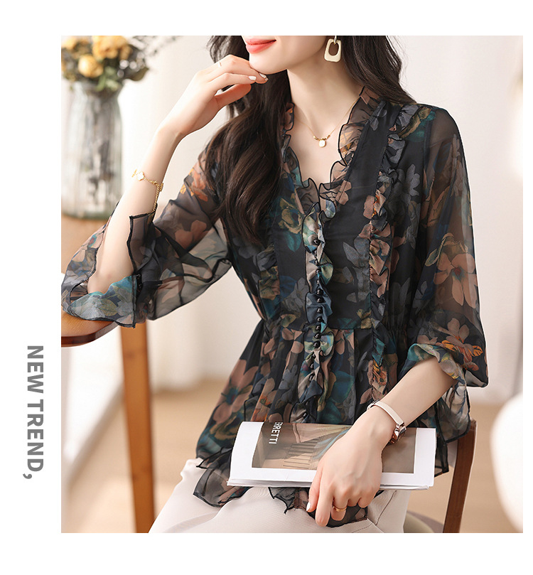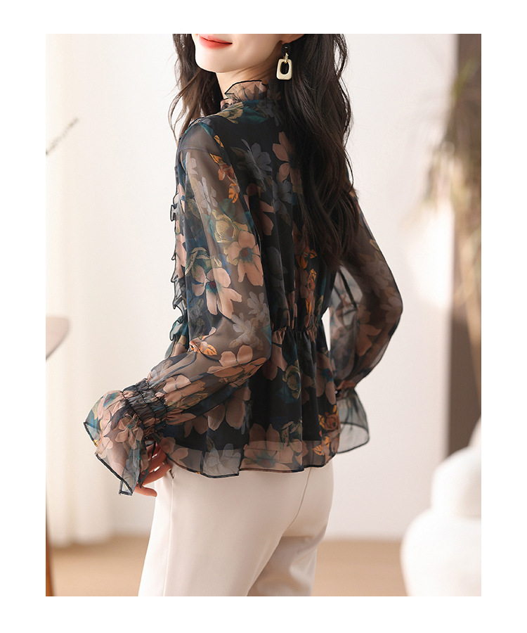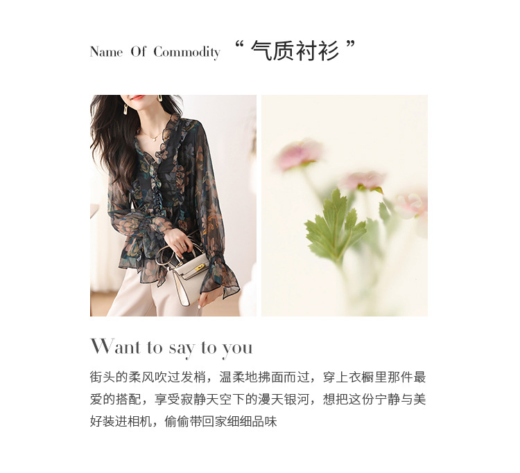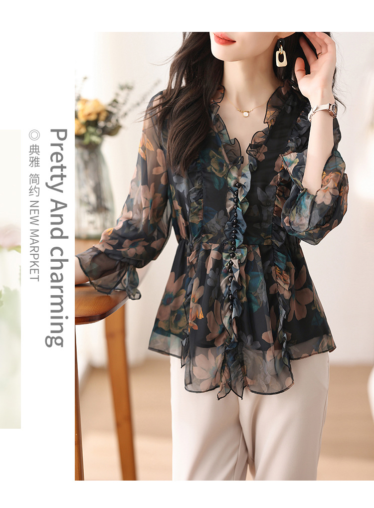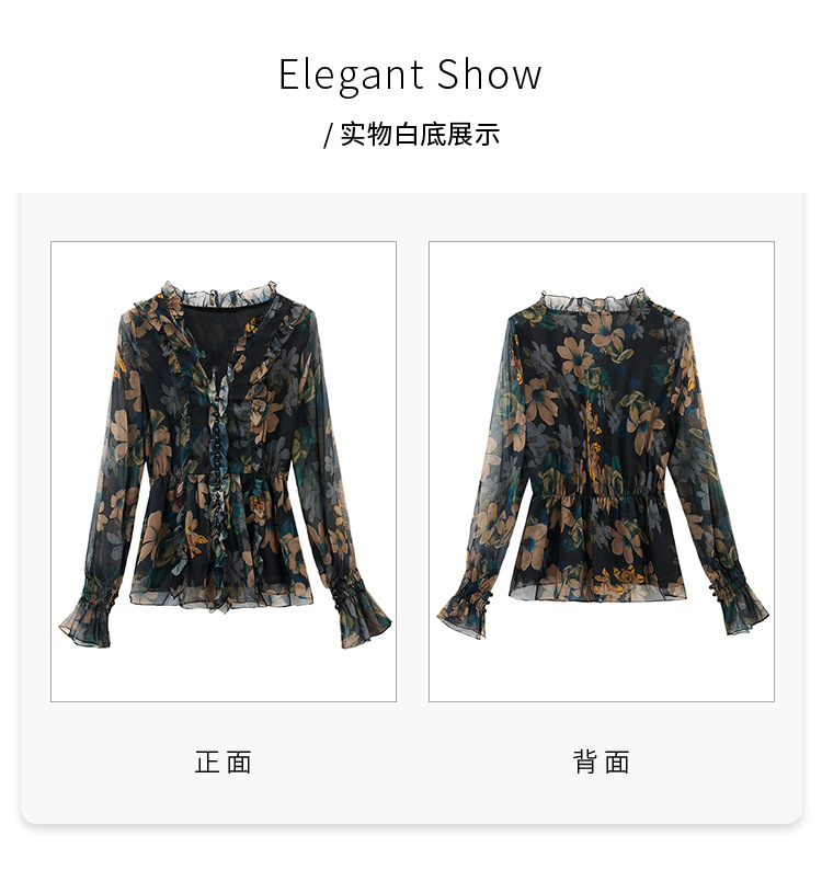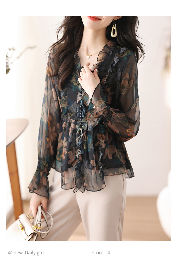 가을과 겨울 배 뒤덮인 슬리밍 꽃 셔츠 허리-단단한 외국 스타일 V-넥 트럼펫 슬리브 러플 쉬폰 탑스토어 가기