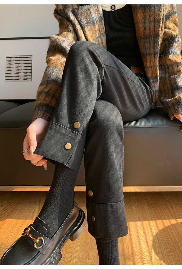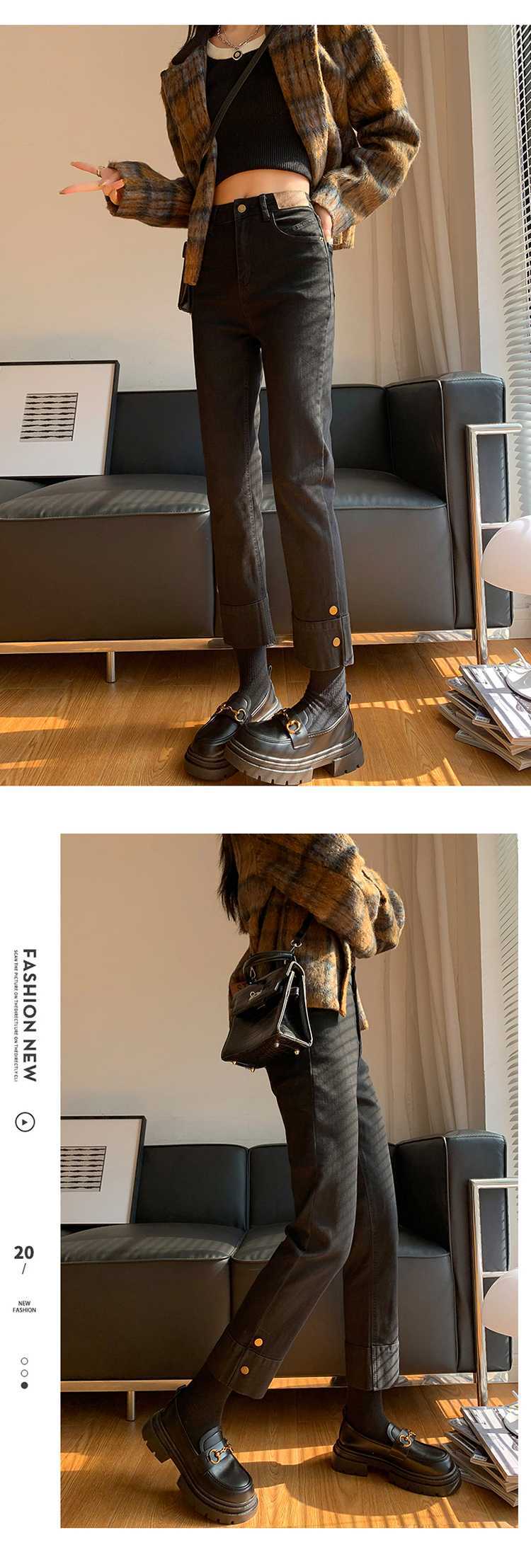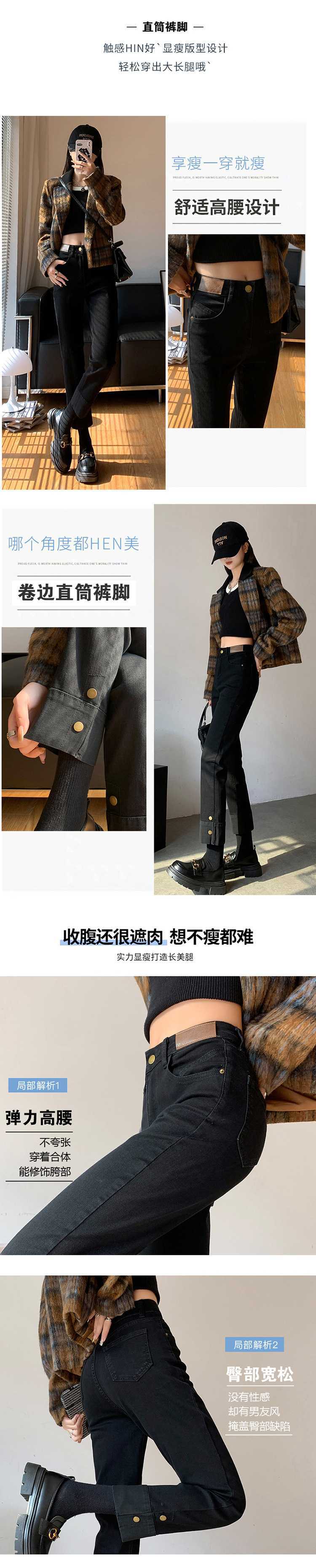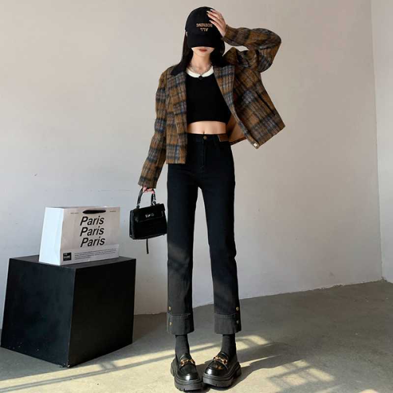 무료 배송 블랙 하이 허리 스트레이트 청바지 여성용 가을과 겨울 디자인 센스 작은 기모 9 포인트 연기 튜브 바지 도매스토어 가기