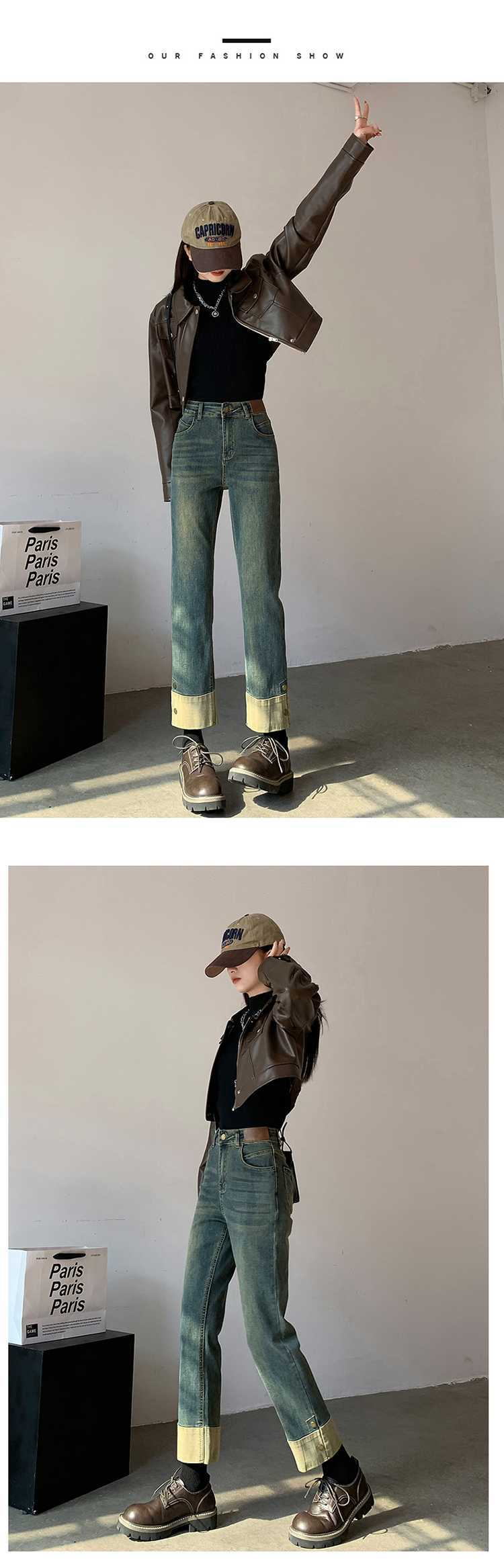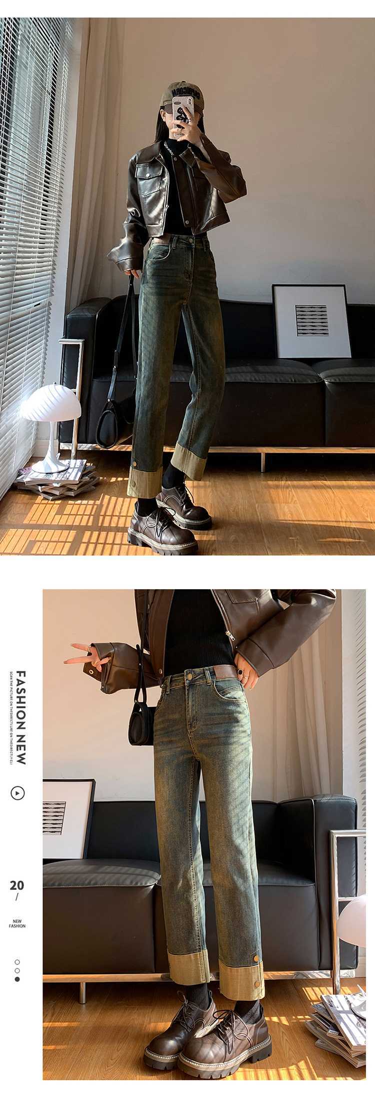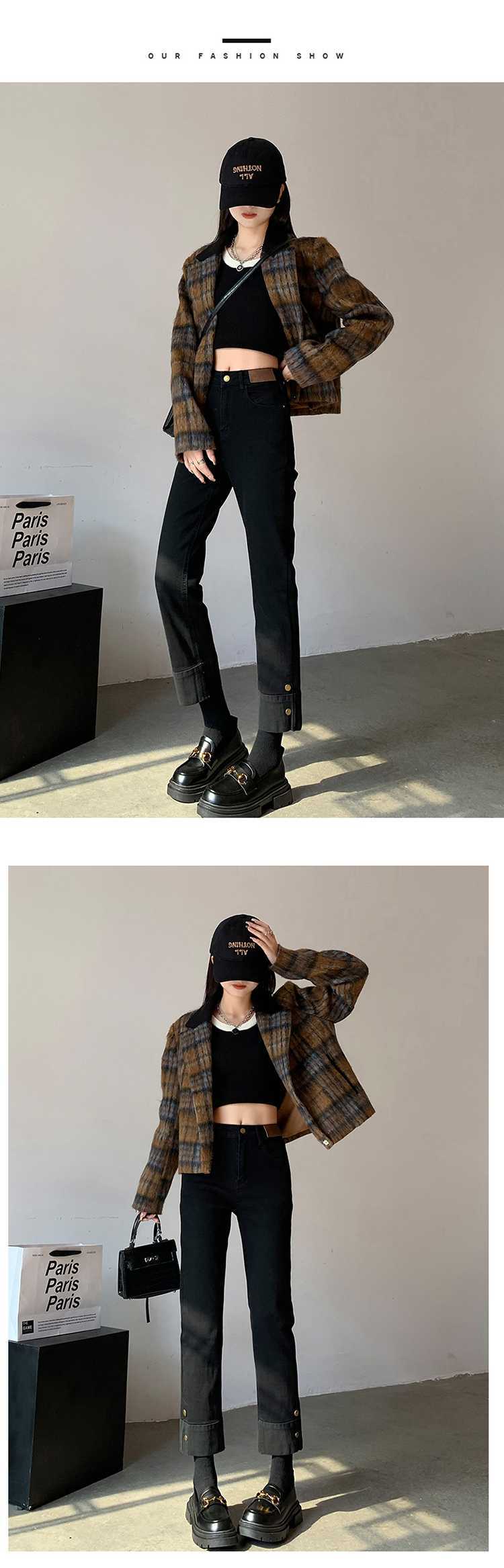 무료 배송 블랙 하이 허리 스트레이트 청바지 여성용 가을과 겨울 디자인 센스 작은 기모 9 포인트 연기 튜브 바지 도매스토어 가기