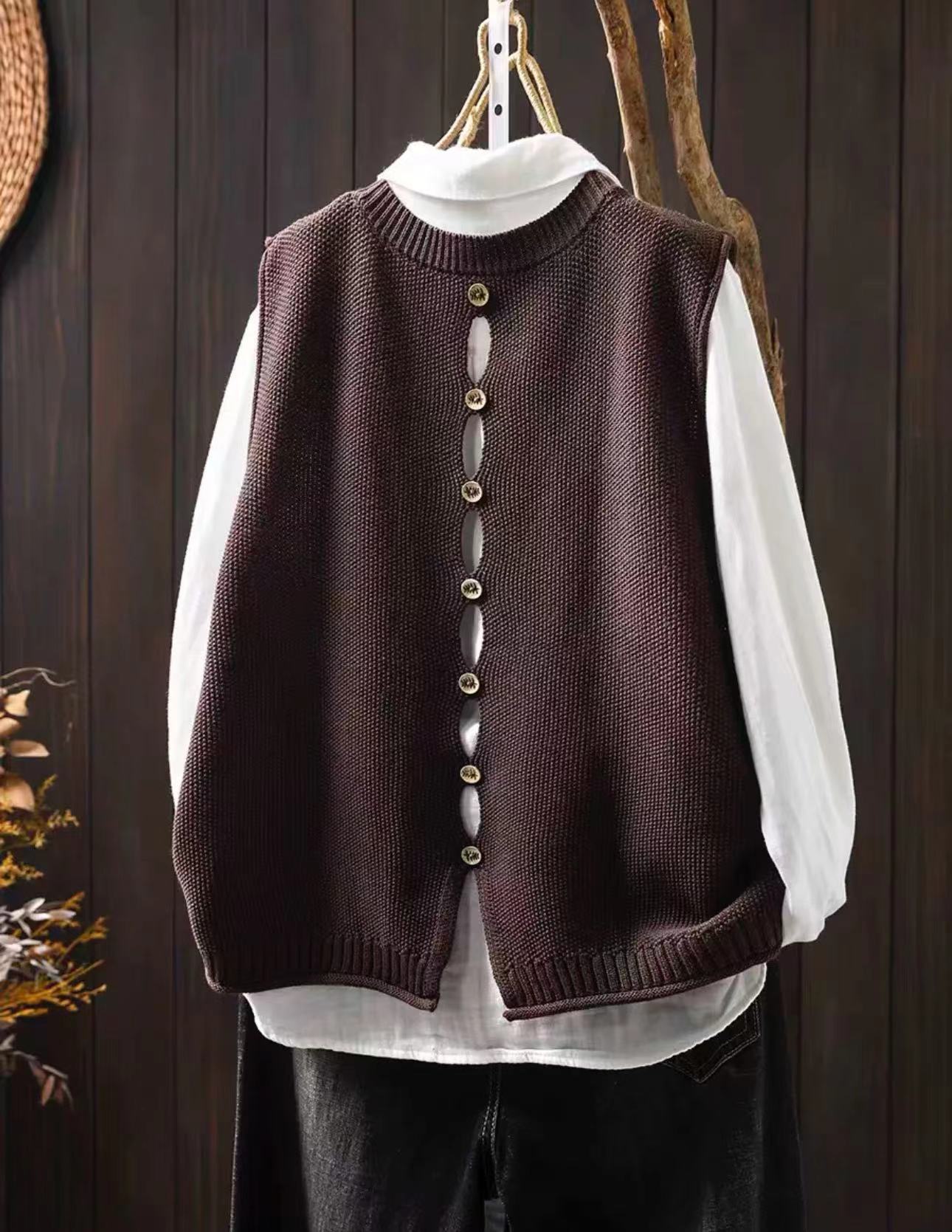 가을 예술면 니트 민소매 라운드 넥 조끼 여성 버튼 할로우 디자인 솔리드 컬러 탑