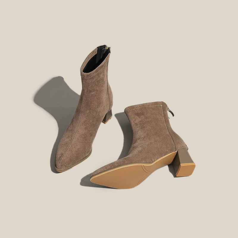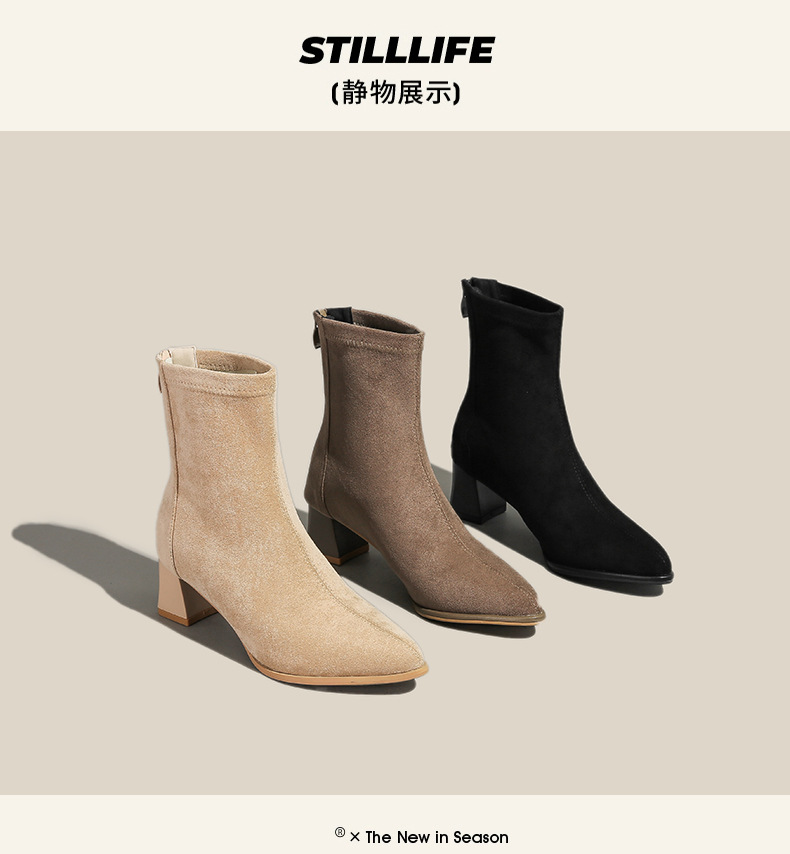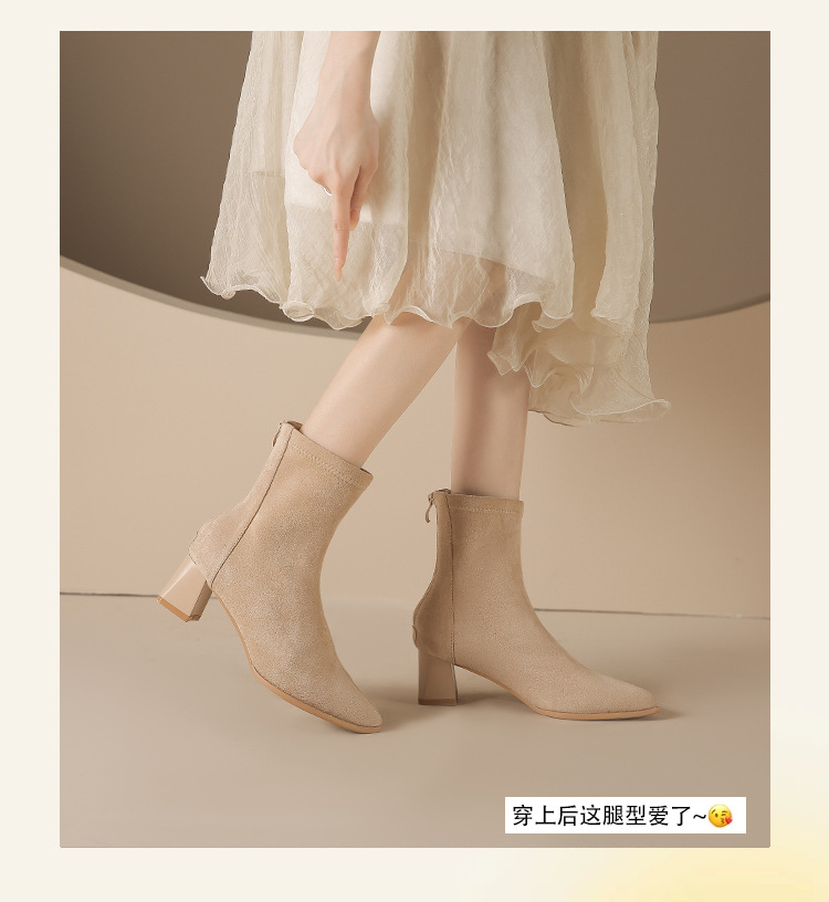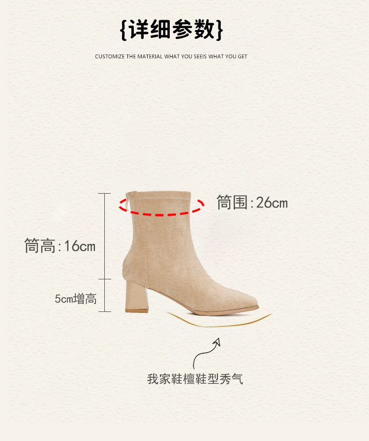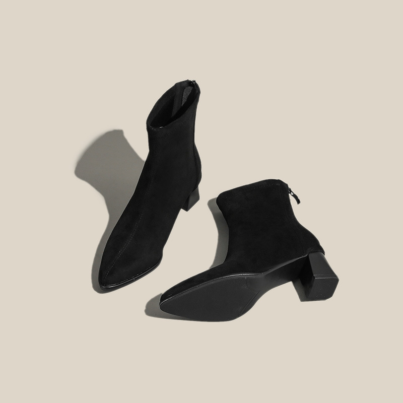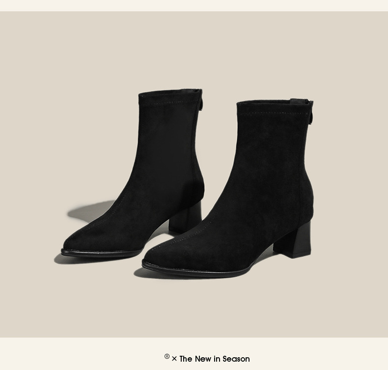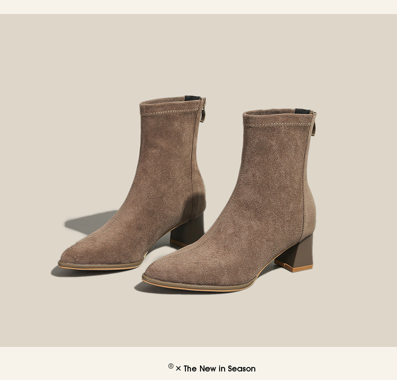 5cm 굽 높이, 사이즈 31-40, 뾰족코, 미들굽, 숏부츠, 가을/겨울용, 뒷지퍼, 스웨이드, 굵은 굽, 슬림핏 부츠