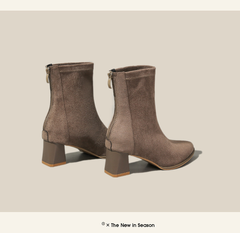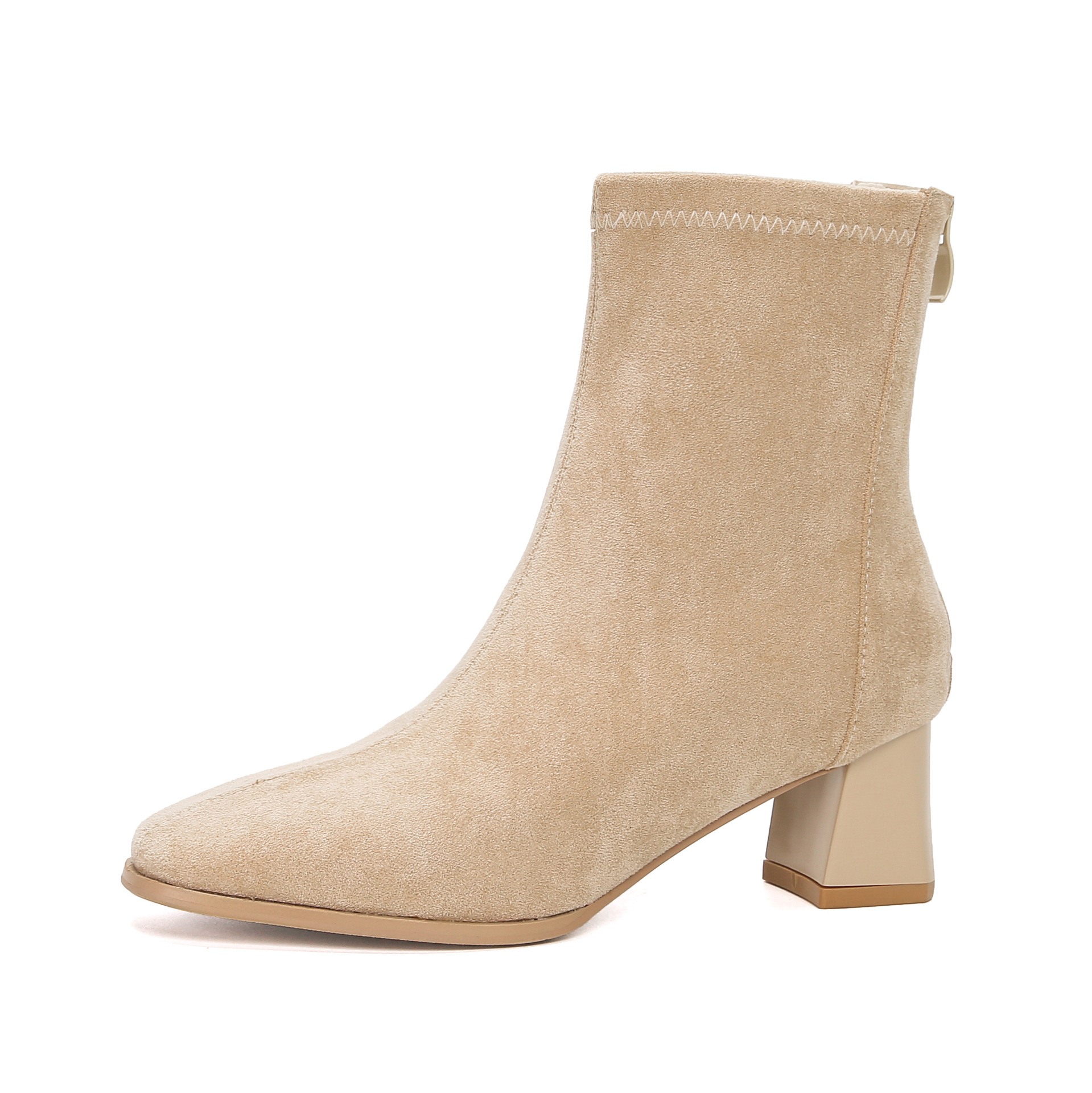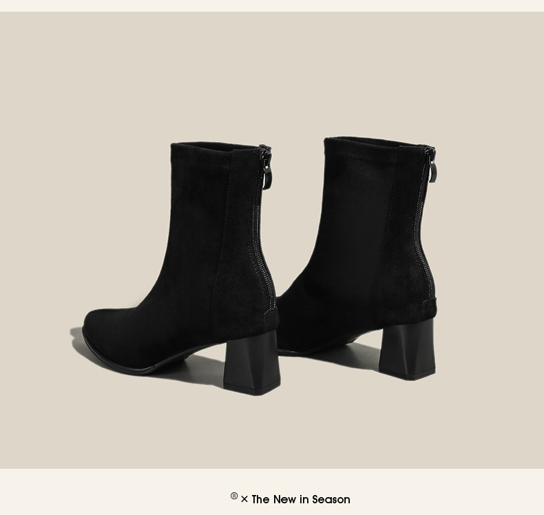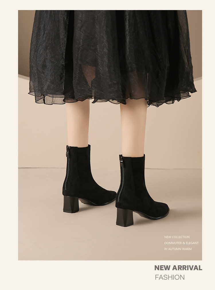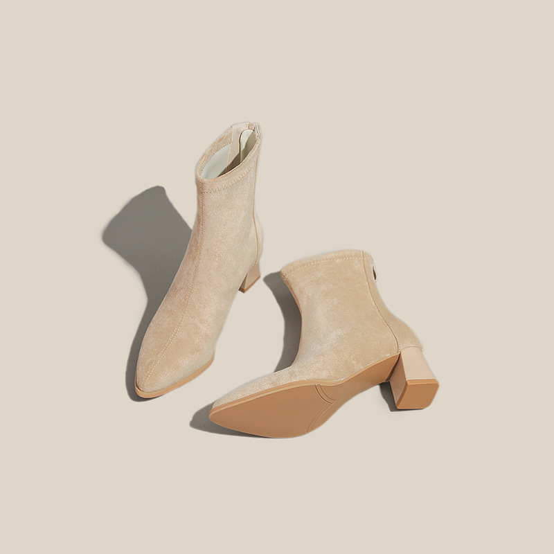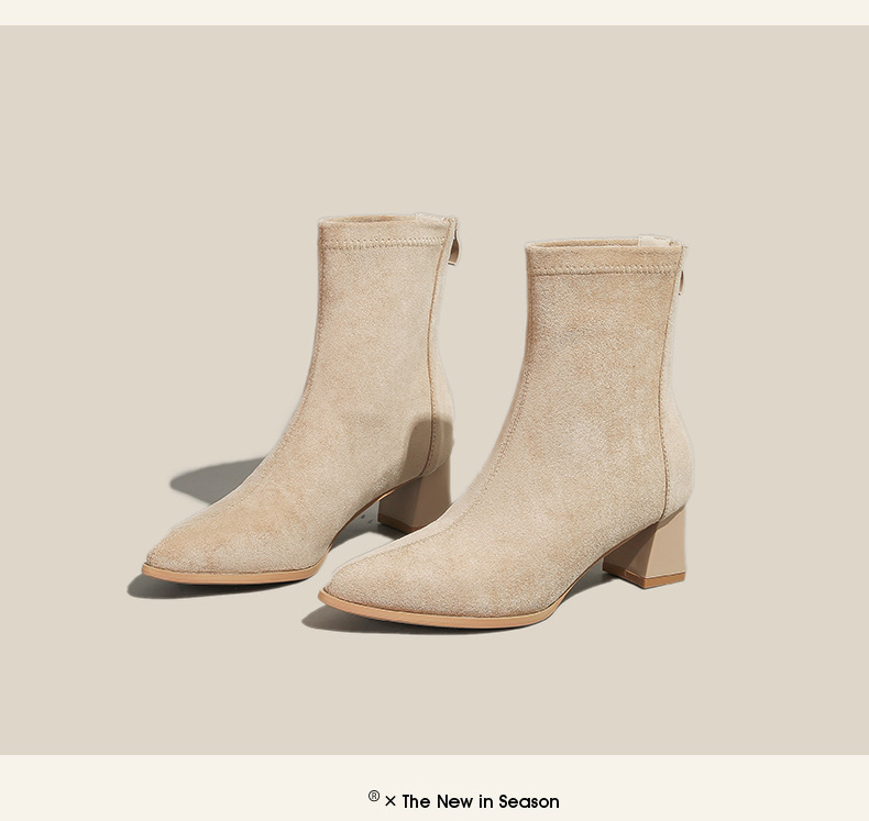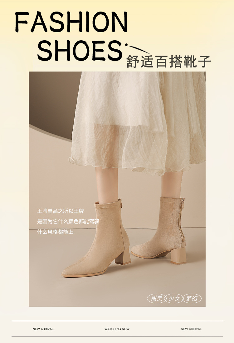 5cm 굽 높이, 사이즈 31-40, 뾰족코, 미들굽, 숏부츠, 가을/겨울용, 뒷지퍼, 스웨이드, 굵은 굽, 슬림핏 부츠