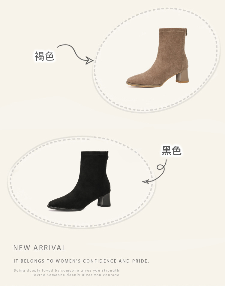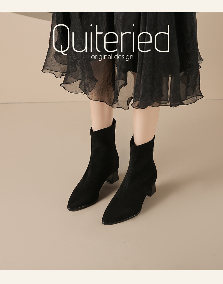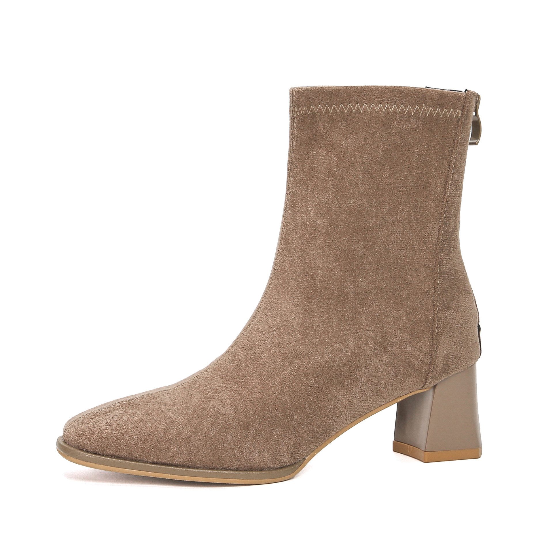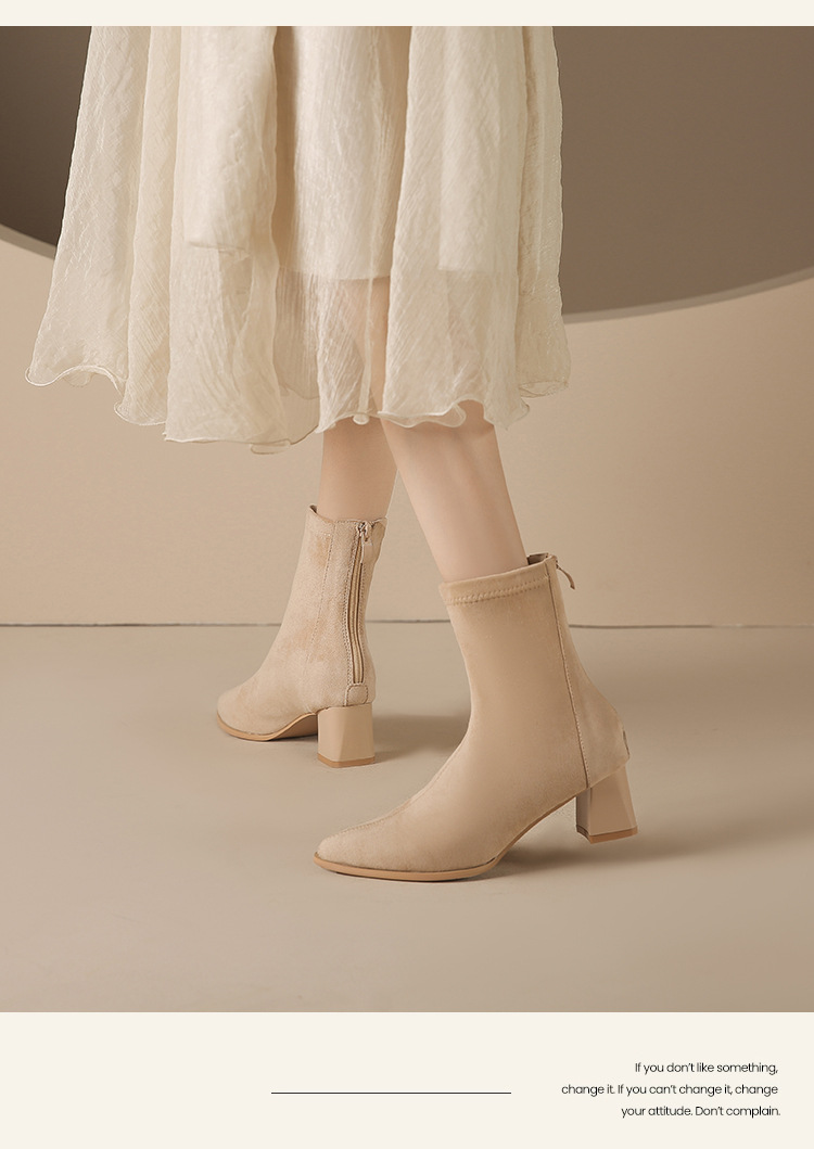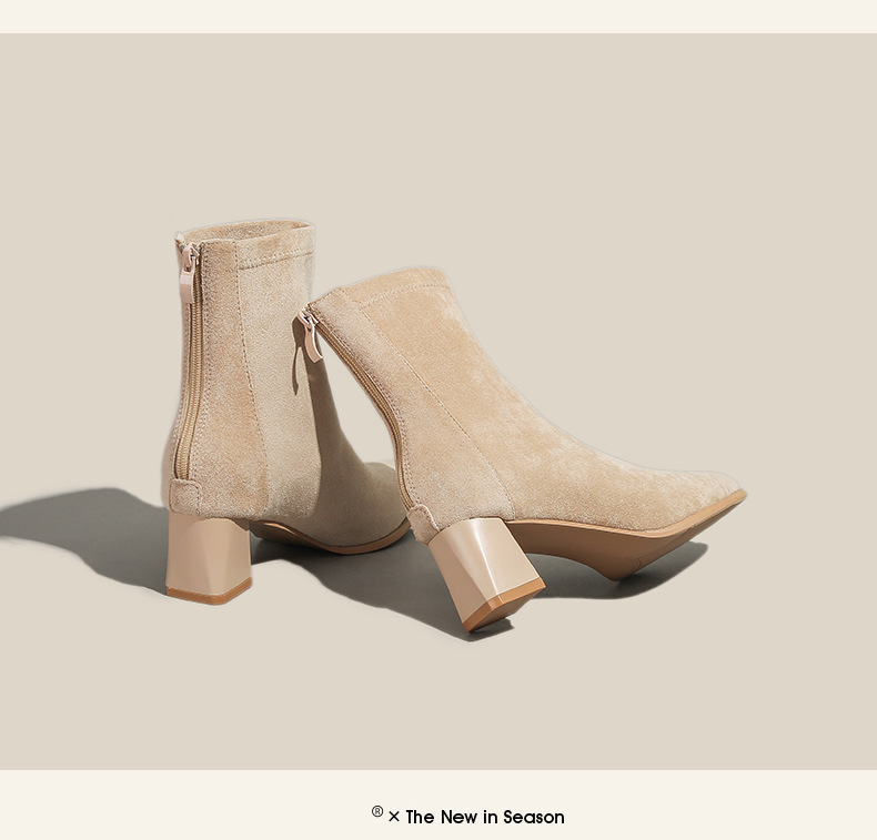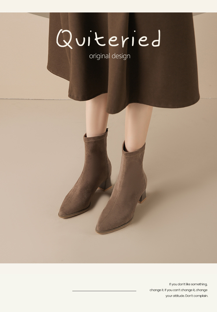 5cm 굽 높이, 사이즈 31-40, 뾰족코, 미들굽, 숏부츠, 가을/겨울용, 뒷지퍼, 스웨이드, 굵은 굽, 슬림핏 부츠