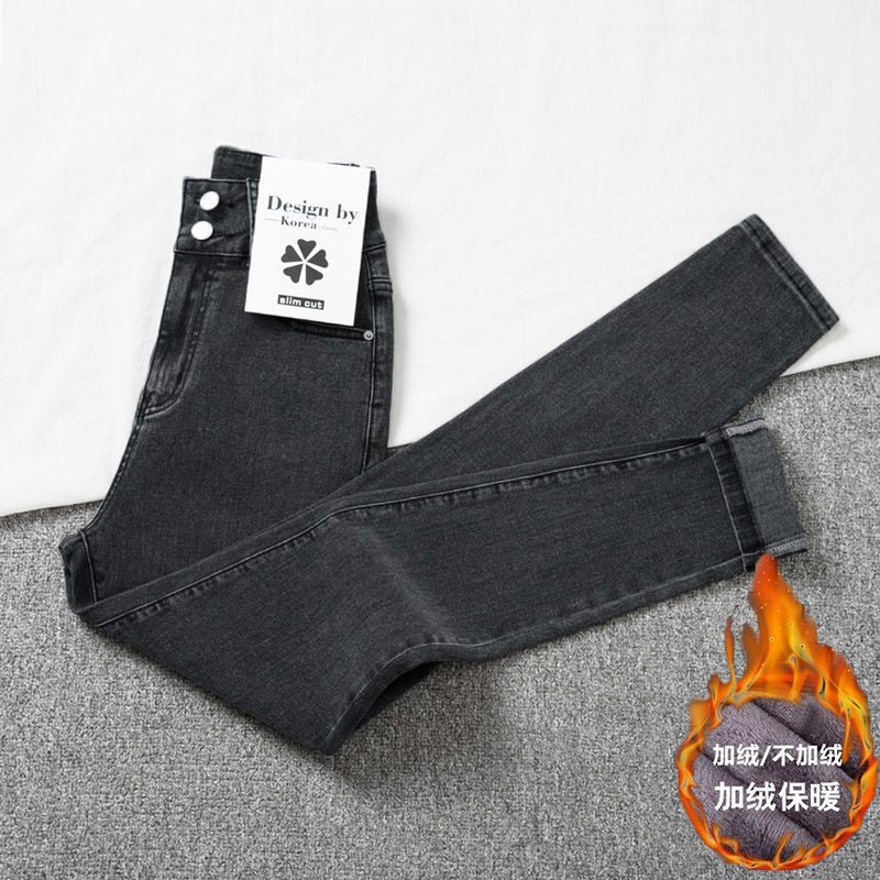 검은 회색 청바지 여성의 봄 가을과 겨울 기모 스트레칭 높은 허리 슬림-꽉 조이는 가벼운 바지 스트레치 연필 바지스토어 가기
