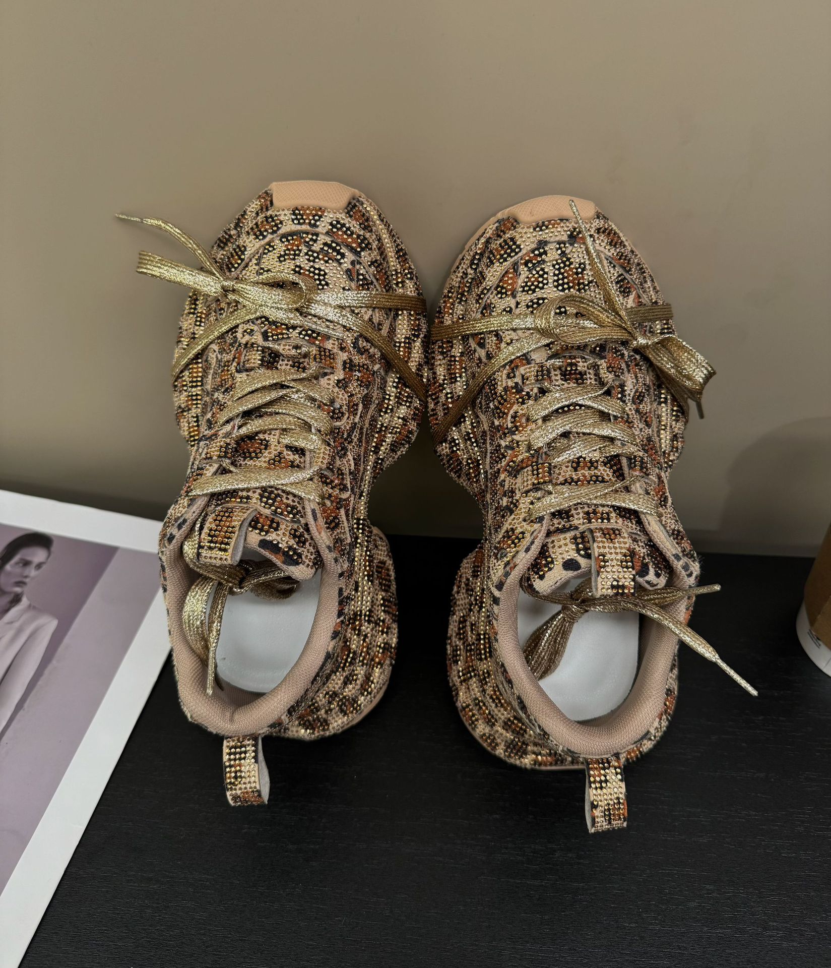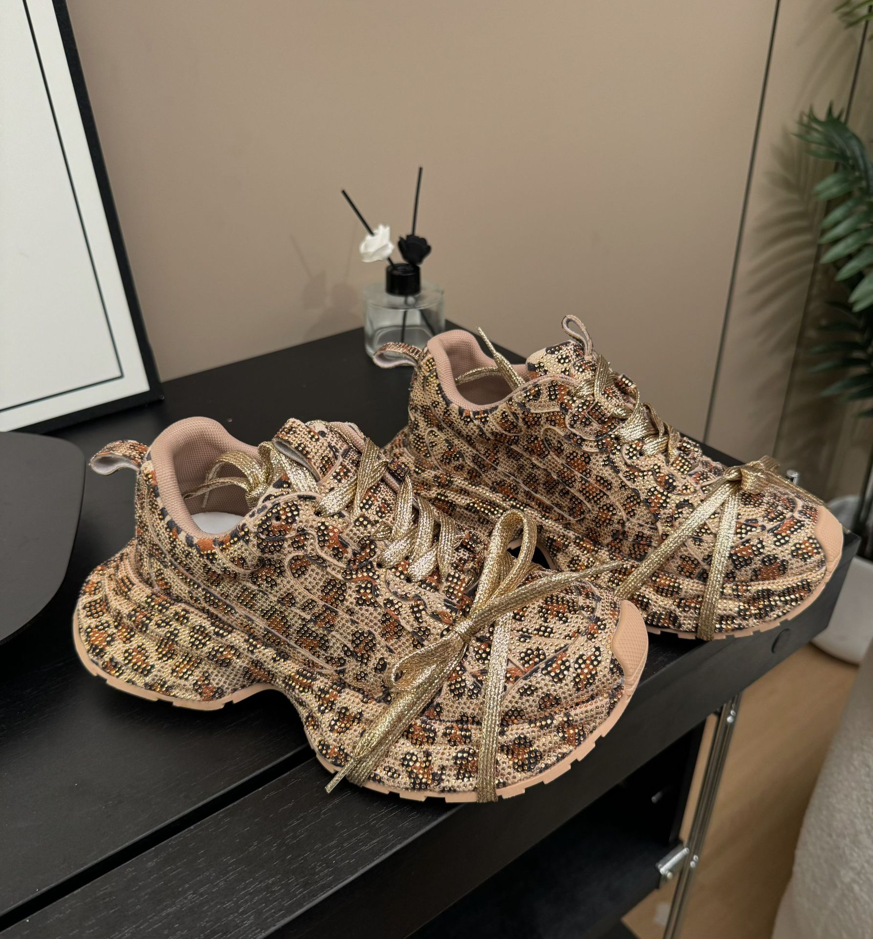 2024 가을 여성용 아빠 신발, 인스 스타일, 풀 다이아몬드 장식, 레오파드 프린트, 골드 컬러, 독특한 디자인, 멋스러운 키높이 효과스토어 가기